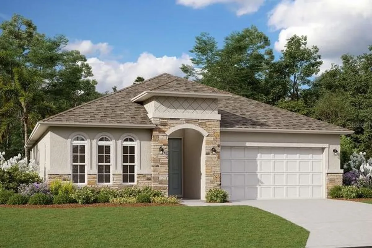 Under Construction. One or more photo(s) has been virtually staged. Welcome to the Mulberry C with Stone Elevation, a 1,938 sq. ft. single-story home in the 55+ community of Heritage: The Cottages of Sanders Grove in Okahumpka. This thoughtfully designed residence features 4 bedrooms, 2.5 bathrooms, and a 2-car garage. The open layout showcases upgraded luxury vinyl plank flooring throughout the main living areas, as well as the bathrooms and carpet in the bedrooms for added comfort. The kitchen offers 42” Harbor cabinets and quartz countertops, blending style and functionality. A covered lanai provides the perfect space to relax or entertain outdoors.Enjoy a peaceful, active-adult setting with convenient access to shopping, dining, and major roadways