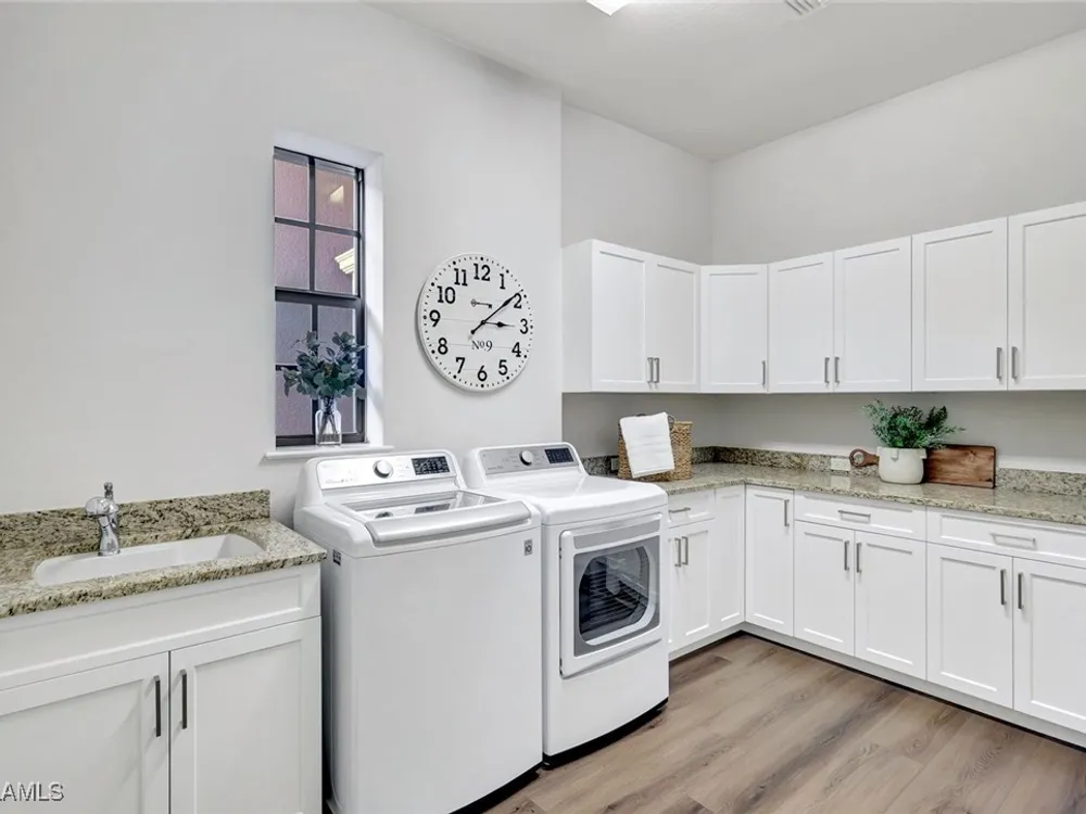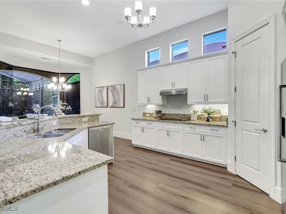 Hammock Isles at the Vineyards, 2015 build, one of the newest in the community. Bright, open layout with new luxury vinyl plank flooring and baseboards. The kitchen offers recently upgraded appliances, an eat-in area, and a pantry. A well-appointed laundry room includes a 2022 washer and dryer, utility sink, custom cabinetry, and generous granite counter space. Two guest bedrooms feature cozy carpeting and plantation shutters. The primary suite is a retreat with a walk-in closet and a spacious bath with glass-enclosed shower, jetted tub, and a custom vanity with granite. Enjoy easy indoor-outdoor living on the screened lanai with pool and spa, LED lighting, and a built-in grill station with granite. Pool and spa pumps have been replaced. Additional updates include an oversized water heater, refreshed garage and front doors, and updated garage door springs and keypad. Vineyards amenities include beauty salon and spa, biking and jogging paths, pickleball, bocce, tennis, clubhouse, lap pool, fitness centers, golf with putting green, play area, restaurant, sauna, and nearby shopping. Private memberships available. Move-in ready, beautifully maintained, and ready for you.