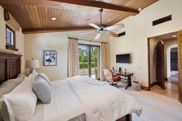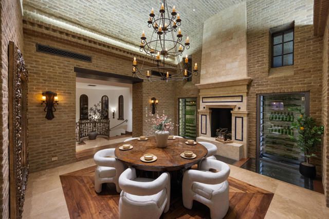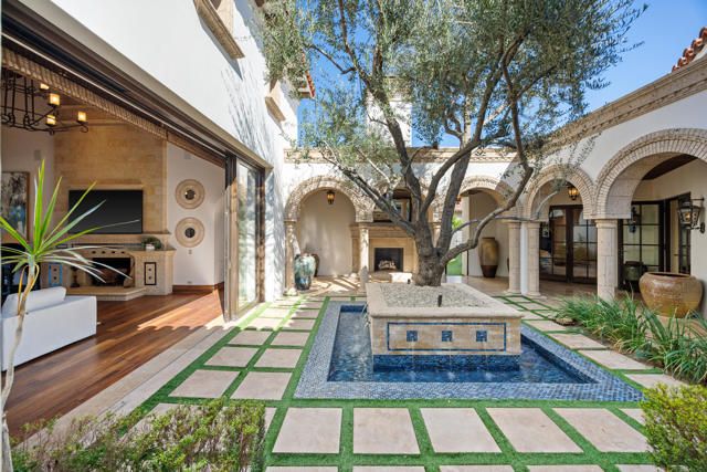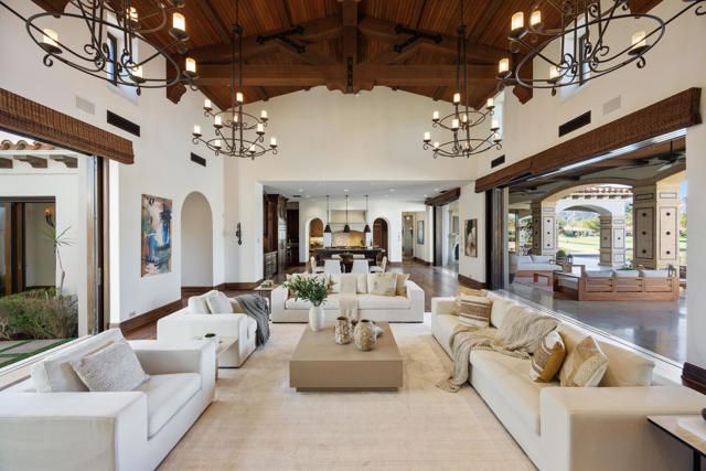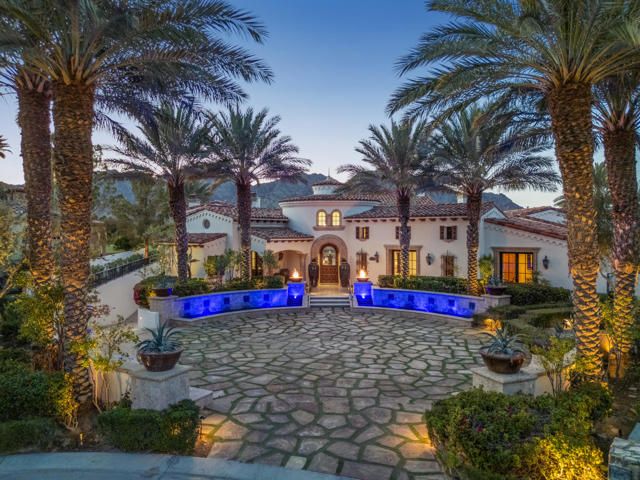 The Peninsula Estate: Occupying one of the most commanding positions in PGA West, this Spanish architectural residence is defined by scale, craftsmanship, and uninterrupted water, mountain, and triple-fairway views.Inspired by Hotel Alfonso XIII in Seville, Spain, the estate reflects European resort sensibility translated into a private setting designed for grand entertaining and refined living. Positioned on over half an acre, a residence with this level of finish, setting, and architectural intent is seldom introduced.An infinity-edge pool and spa overlook the lake, fairways, and Santa Rosa Mountains, complemented by expansive patios with upper and lower lighting, multiple fire features, limestone and Cantera stone detailing, and a rare sky deck with fireplace.A dramatic great room with 19-foot ceilings anchors the home, featuring a massive floor-to-ceiling limestone fireplace framed by wood-clad retractable pocket doors. The kitchen is designed without compromise, offering Viking appliances, Sub-Zero refrigeration, a generous island, custom cabinetry, and a fully appointed butler's pantry with additional appliances.The formal dining room evokes a private wine cellar with panoramic views, tumbled brick barreled ceilings, a striking fireplace, and dual two-story glass wine towers with a see-through floor extending to the lower-level media/wine tasting room.The primary suite is expansive and privately oriented, capturing remarkable views and featuring a fireplace and dedicated patio--creating a quiet yet substantial retreat within the home's broader scale. An open-air interior courtyard with fireplace, sculptural olive tree, and fountain connects the main residence to a well-appointed two-bedroom, two-bath casita with living area and kitchenette.Additional highlights include a mahogany full-service bar, two additional ensuite guest bedrooms, elevator service to the lower level and main floor, newly refinished wood floors, an oversized four-car lower-level garage, mature landscaping with new lighting, and a private executive office with views.A residence of this caliber is rarely available. Offered now for the first time.