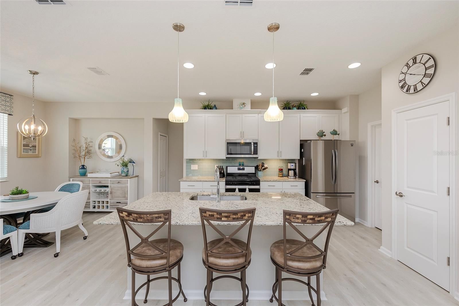Bring your dreams of a Florida paradise to life in this Dreamsicle Cottage located on a quiet corner lot in Phase 3A of the highly-sought active retirement community, Latitude Daytona! Thoughtful upgrades throughout make this home truly special. Recessed lighting, designer fixtures, custom window treatments, and wood-like LVP flooring are just some of the highlights, while the premium open kitchen features a gas stove, granite countertops, stainless steel appliances, subway tile backsplash and an extended island that is great for hosting. The spacious owner's suite provides a stylish barn style door into the primary bath where you will find a granite-topped dual sink vanity and a walk-in shower. Also enjoy the flexibility for accommodating additional guests or having an office / game space in the convenient den. Relax in the evenings from the cozy, screened wrap-around front porch and relish your new found lifestyle. And take note, this home is close to the Latitude Daytona amenities which include a private restaurant / bar, a beach club, multiple swimming pools, tennis, pickleball and much more. You can even drive a golf cart to the local Publix Supermarket! Don't miss the chance to live the dream in a Dreamsicle schedule your showing today!