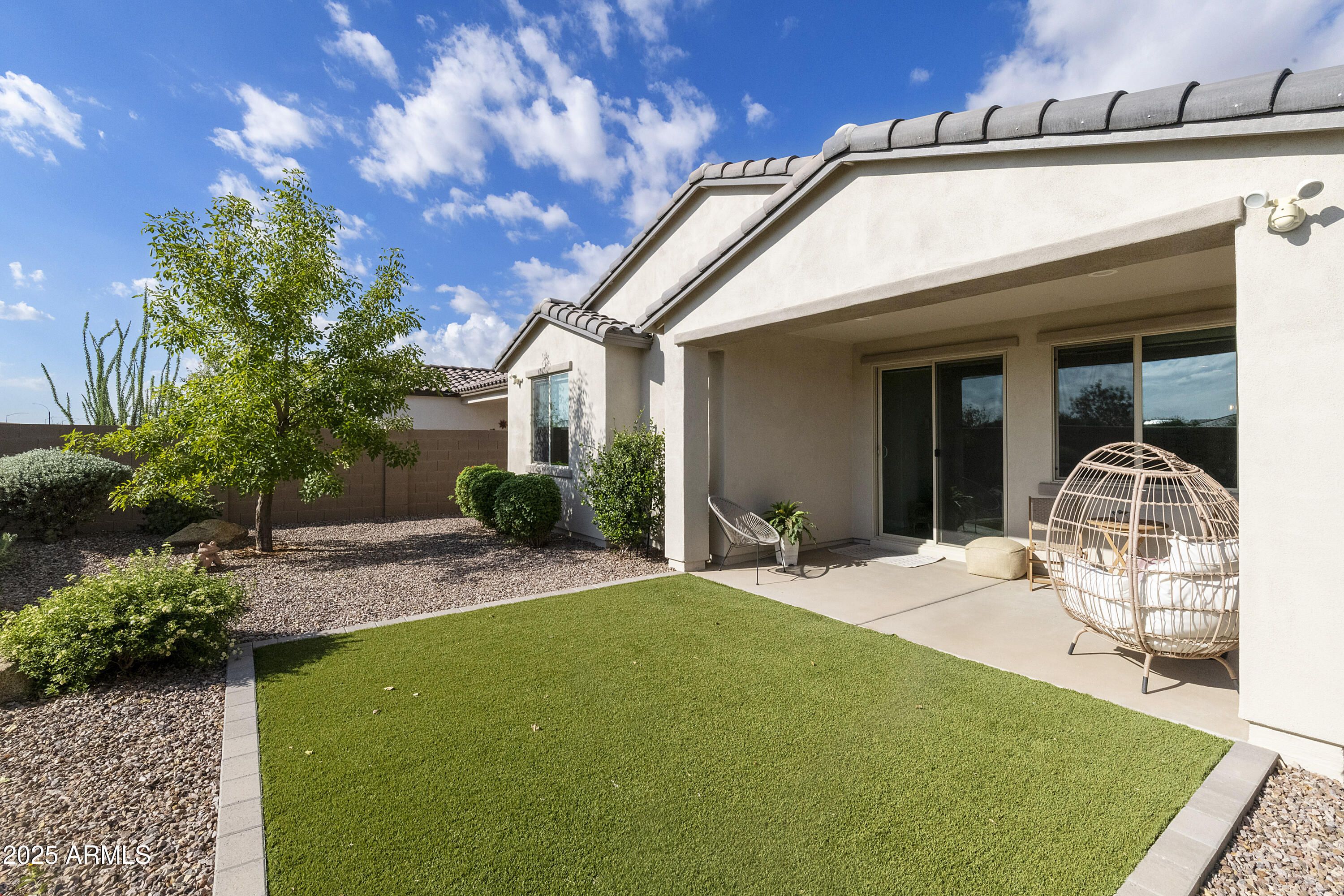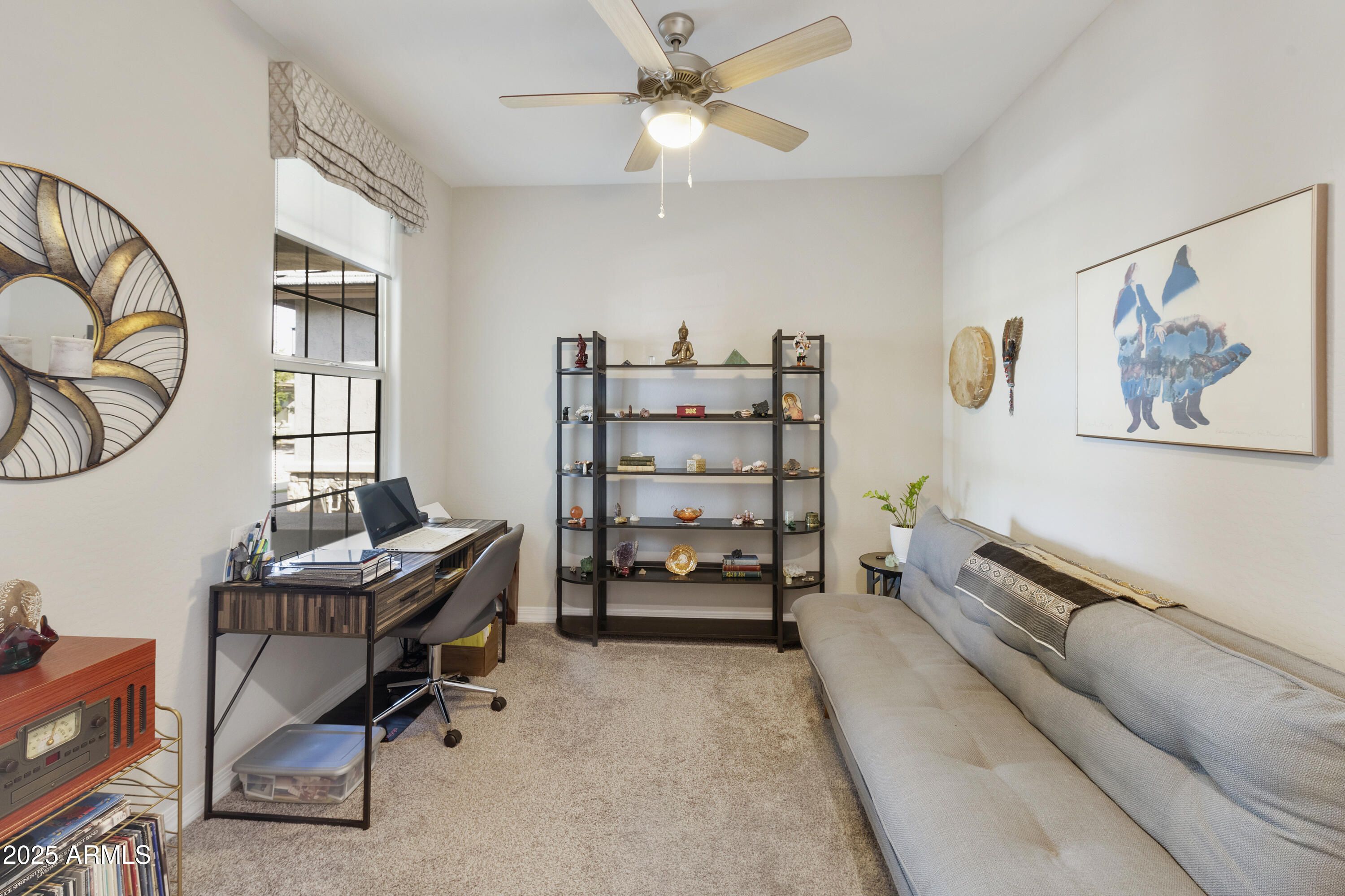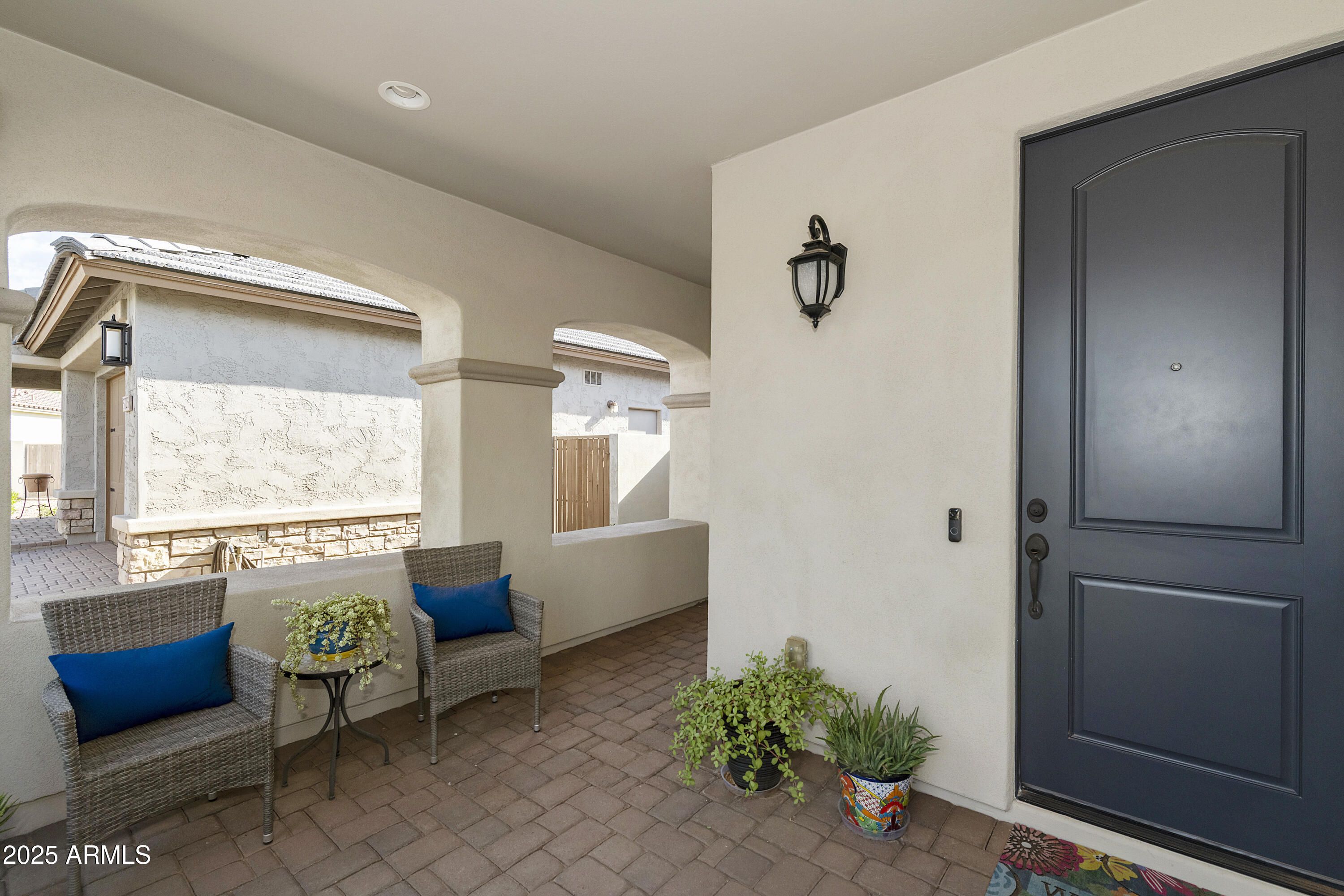 Stunning 2 bedroom, 2 bath home with a den in the 55+ community of Encore at Eastmark. Built in 2020 this home is highly upgraded! Enter the home through the covered front porch with paver accent walkway. Pride of ownership shows in this LINDY floor plan is a great room concept with eat in kitchen. Kitchen has upgraded cabinets that roll out, panty, large island with R/O, stainless appliances including refrigerator, gas range/oven, quartz counter tops. Primary bedroom has a spacious shower, dual sinks, quartz counters, large walk in closet with access to the laundry room & the washer/ dryer are newer & comvey. Home has upgraded fans & light fixtures. Backyard is easy to maintain with covered patio & upgraded turf. Garage has storage cabinets.