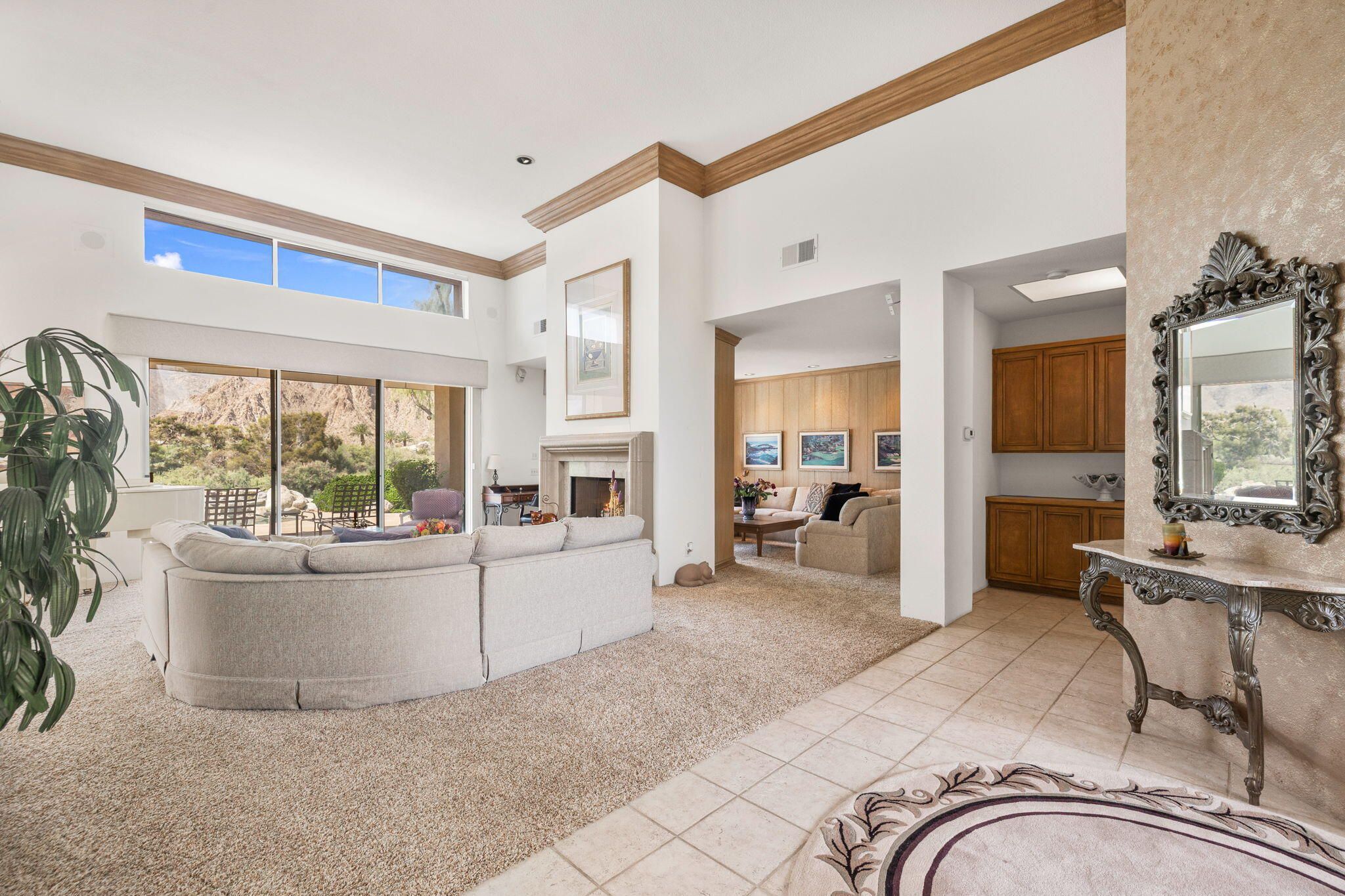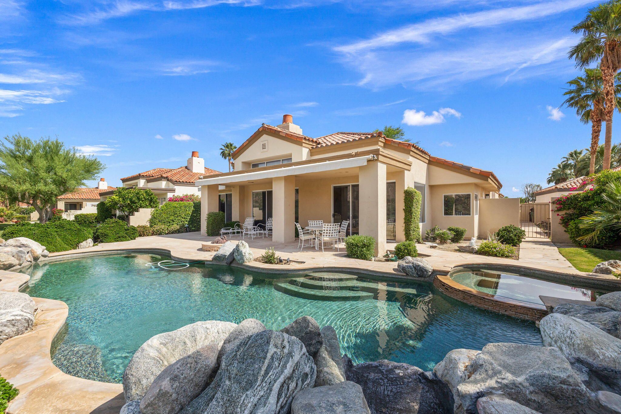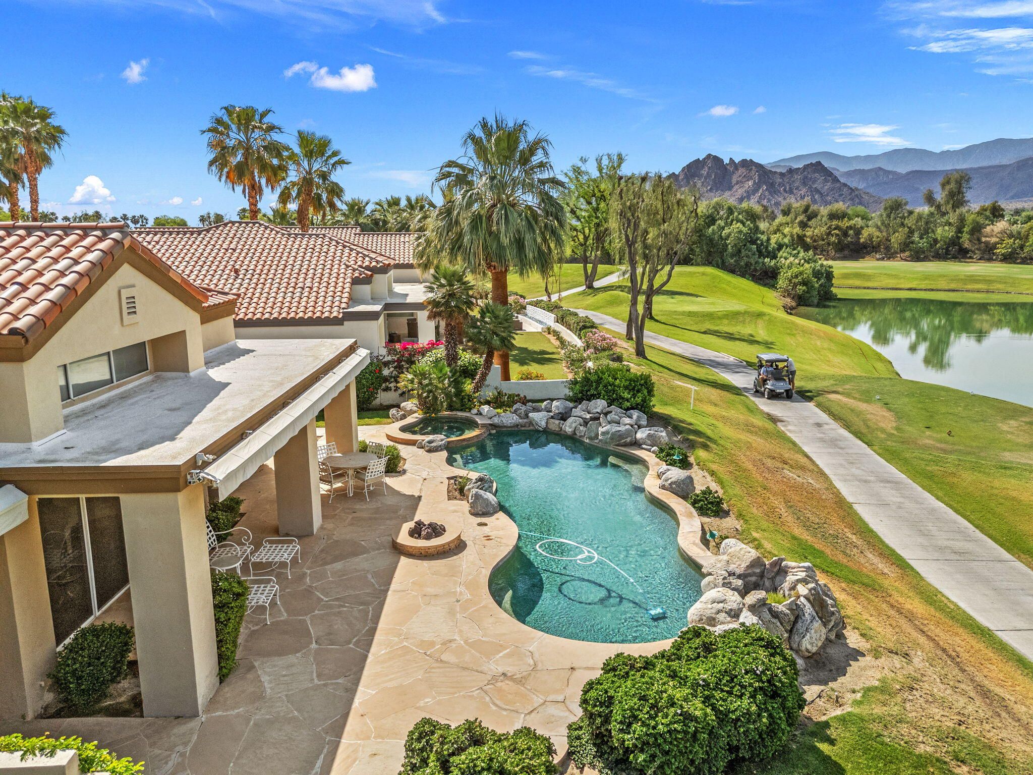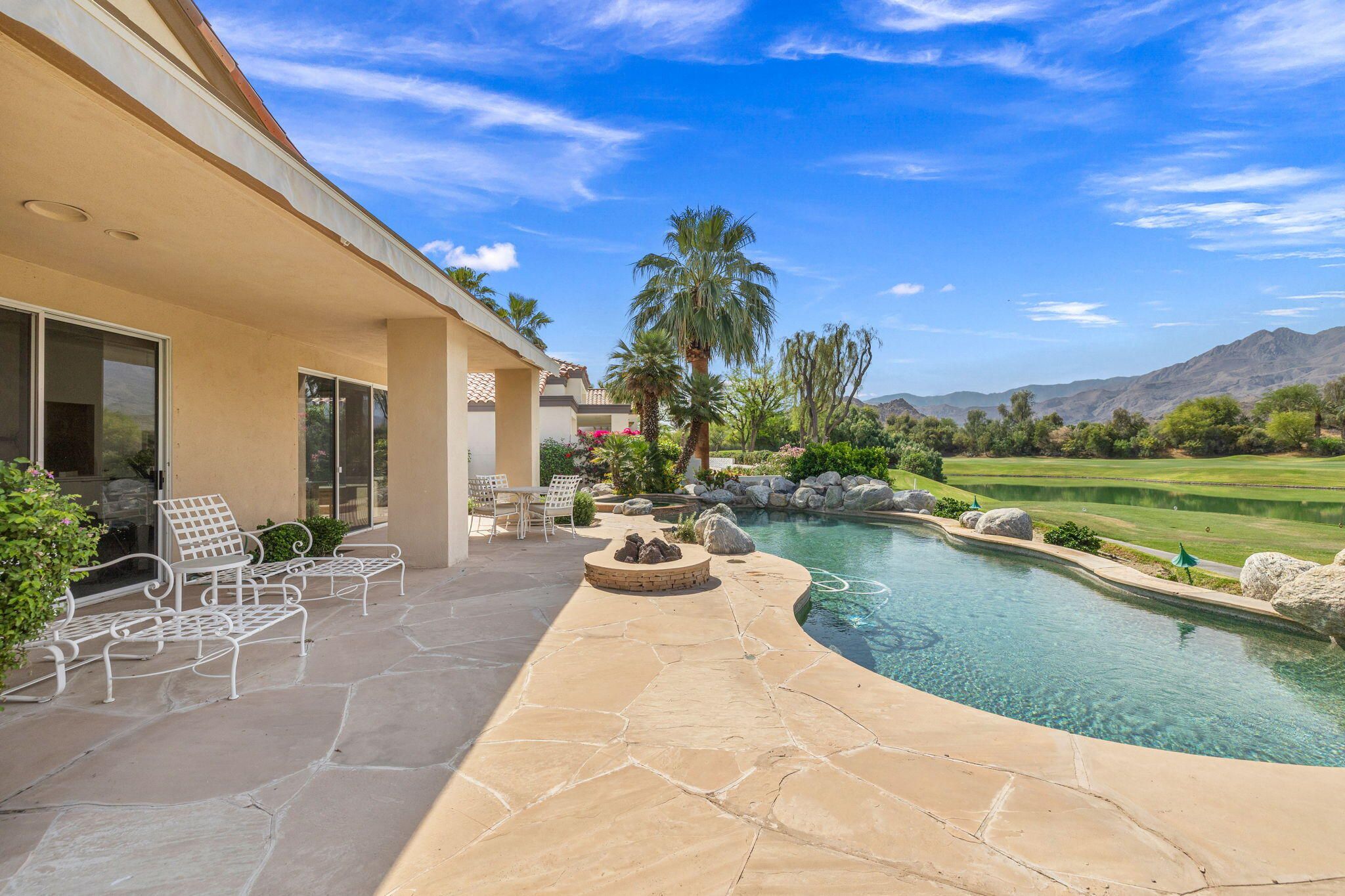 OPPORTUNITY awaits you to TRANSFORM this original 1990 residence into your own CUSTOM RETREAT. Located on the 16th hole of the PGA Nicklaus Private Course, this property captures unobstructed SOUTHWEST VIEWS overlooking the private pool and spa, fairway, lake, and the breathtaking 180-degree panorama view of the Santa Rosa Mountain range. MAIN home features a spacious living area with vaulted ceilings, fireplace, and sit-down wet bar, all oriented to take in the spectacular golf course and mountain views. Large patio doors open to the entertainment patio with a retractable awning creating seamless indoor-outdoor living. The expansive kitchen and dining area open to the BBQ patio, ideal for casual gatherings and entertainment. PRIMARY Bedroom suite and GUEST Bedroom suite both offer ensuite baths and sliding glass doors opening to the private interior courtyard. A converted GUEST Bedroom now serves as a den or media room just off the living room with a private two-piece lavatory and sliding glass doors opening to the view patio. A guest POWDER room and oversized LAUNDRY room complete the main residence. DETACHED CASITA overlooks the private interior courtyard, offering wonderful flexibility for guests or a private office. The property also includes a large two-bay attached garage plus a separate entry golf cart garage attached to the Casita-ideal conversion to an art studio, workshop, or additional creative space. This is a rare opportunity to RENOVATE, UPGRADE, and LANDSCAPE to your personal taste while enjoying an exceptional setting and unforgettable views.