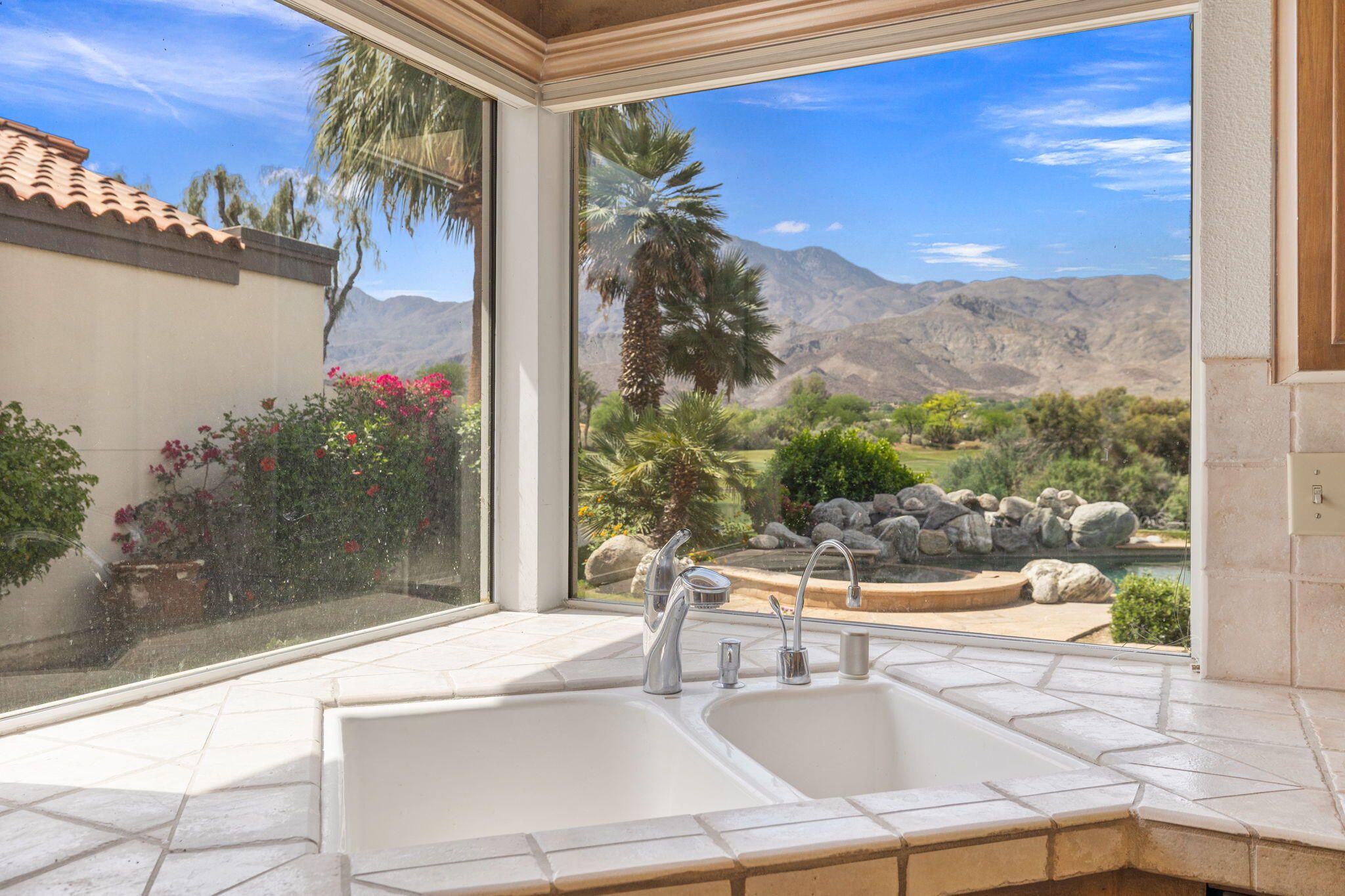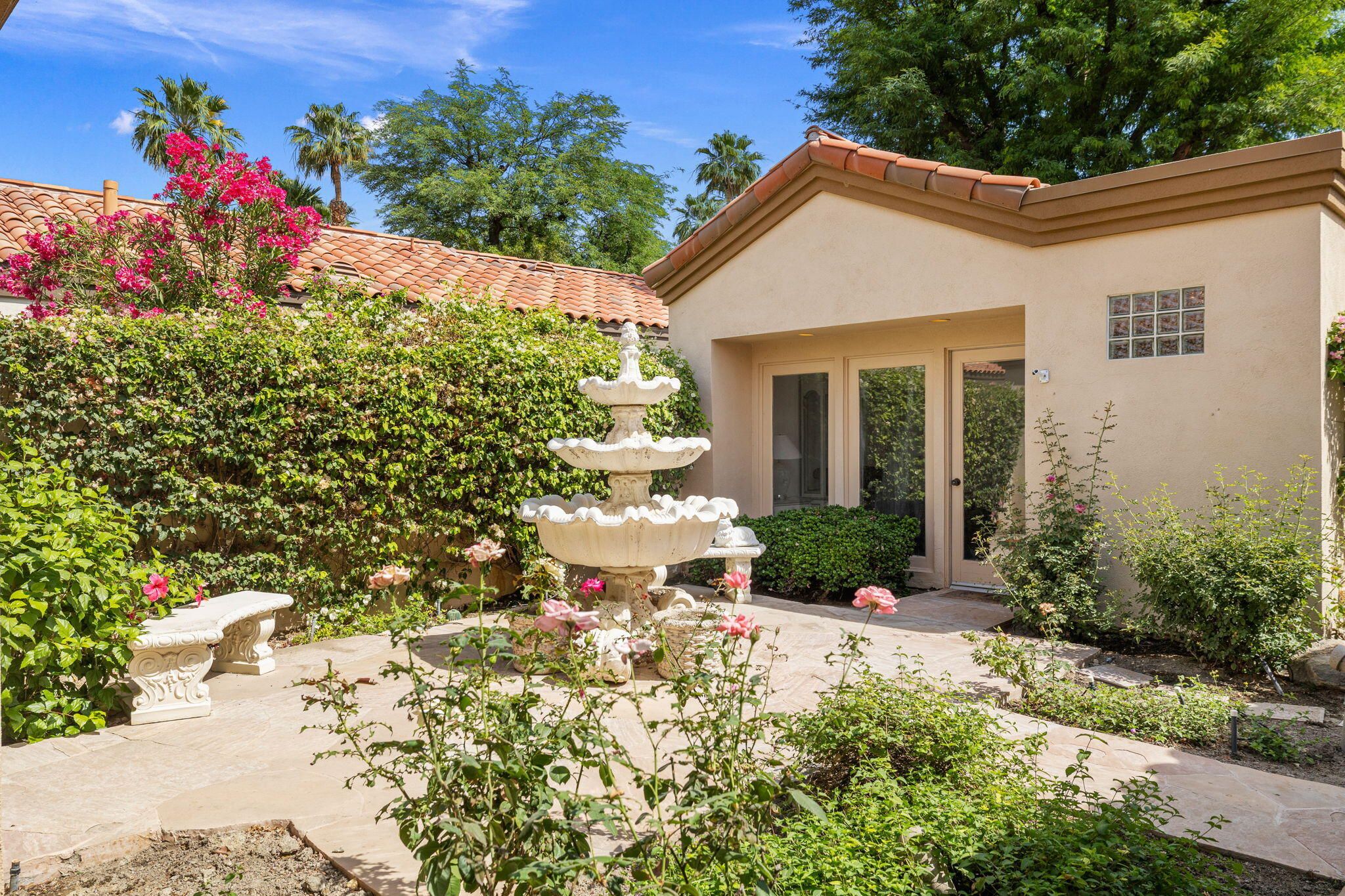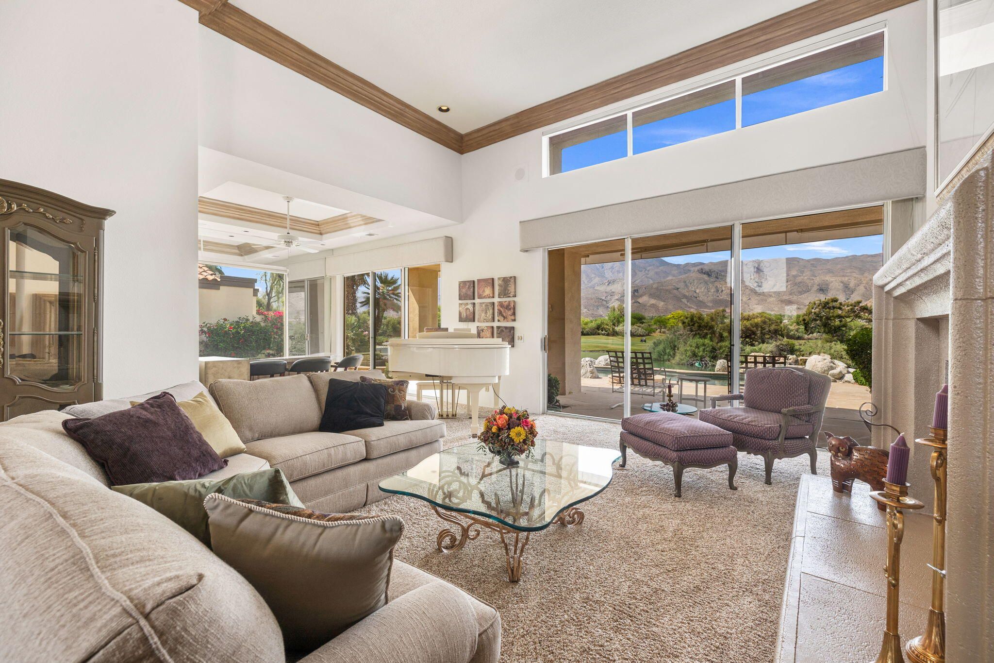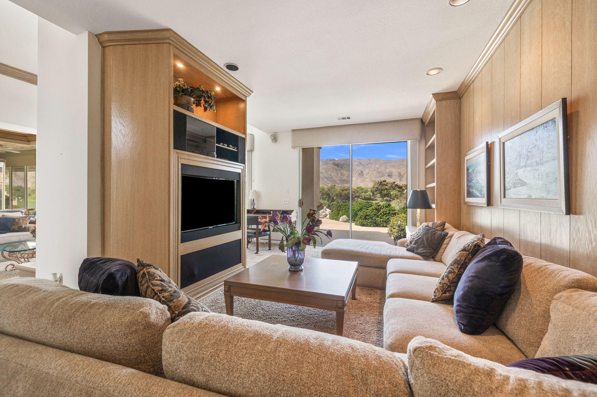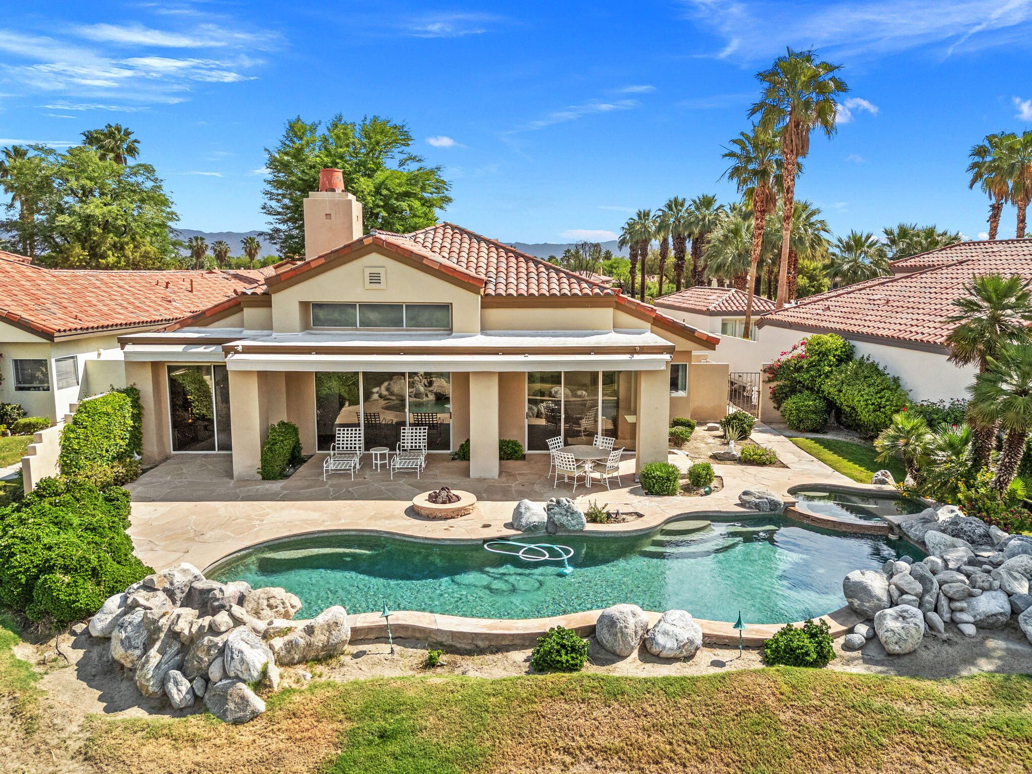 OPPORTUNITY awaits you to TRANSFORM this original 1990 residence into your own CUSTOM RETREAT. Located on the 16th hole of the PGA Nicklaus Private Course, this property captures unobstructed SOUTHWEST VIEWS overlooking the private pool and spa, fairway, lake, and the breathtaking 180-degree panorama view of the Santa Rosa Mountain range. MAIN home features a spacious living area with vaulted ceilings, fireplace, and sit-down wet bar, all oriented to take in the spectacular golf course and mountain views. Large patio doors open to the entertainment patio with a retractable awning creating seamless indoor-outdoor living. The expansive kitchen and dining area open to the BBQ patio, ideal for casual gatherings and entertainment. PRIMARY Bedroom suite and GUEST Bedroom suite both offer ensuite baths and sliding glass doors opening to the private interior courtyard. A converted GUEST Bedroom now serves as a den or media room just off the living room with a private two-piece lavatory and sliding glass doors opening to the view patio. A guest POWDER room and oversized LAUNDRY room complete the main residence. DETACHED CASITA overlooks the private interior courtyard, offering wonderful flexibility for guests or a private office. The property also includes a large two-bay attached garage plus a separate entry golf cart garage attached to the Casita-ideal conversion to an art studio, workshop, or additional creative space. This is a rare opportunity to RENOVATE, UPGRADE, and LANDSCAPE to your personal taste while enjoying an exceptional setting and unforgettable views.