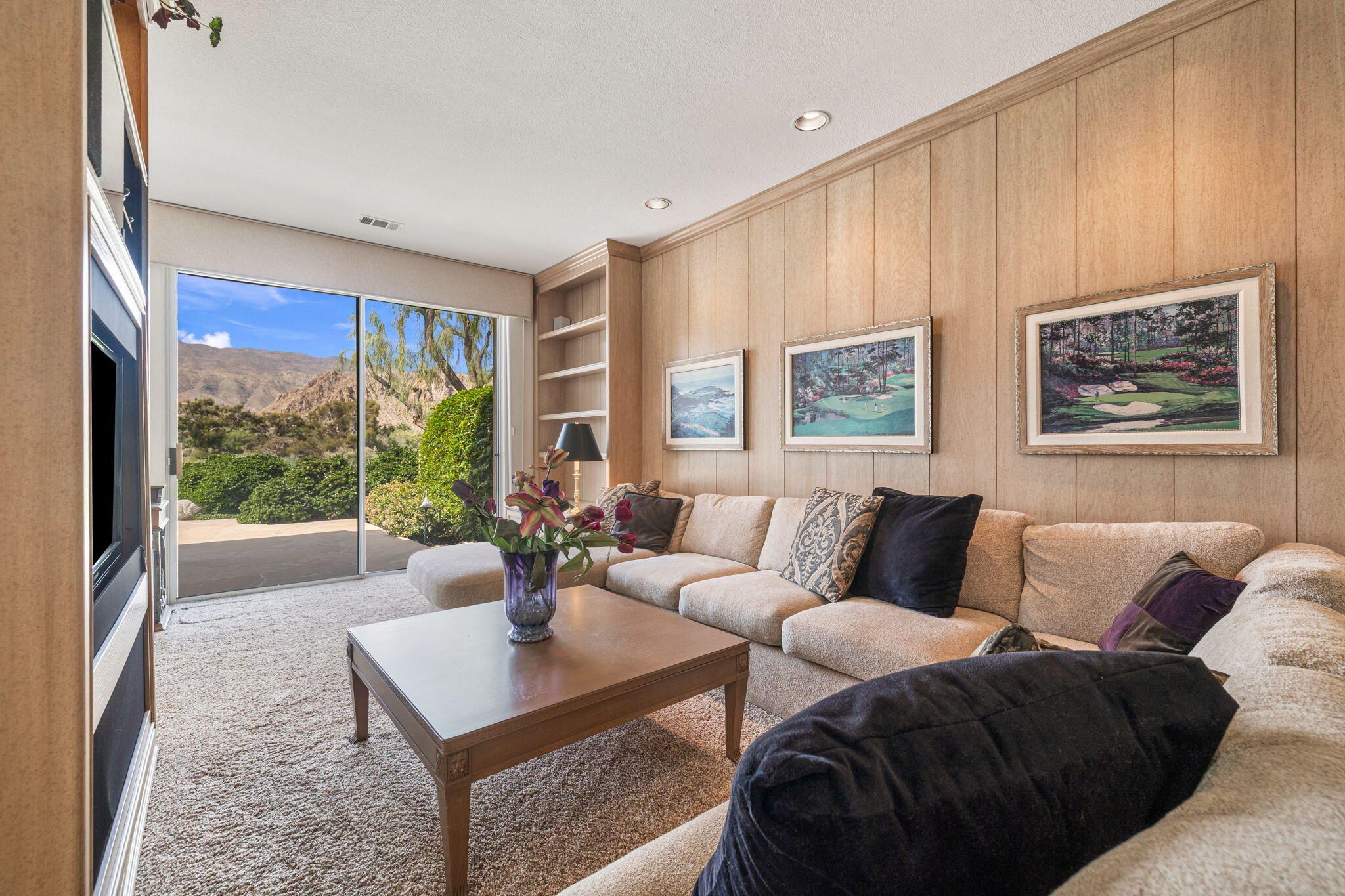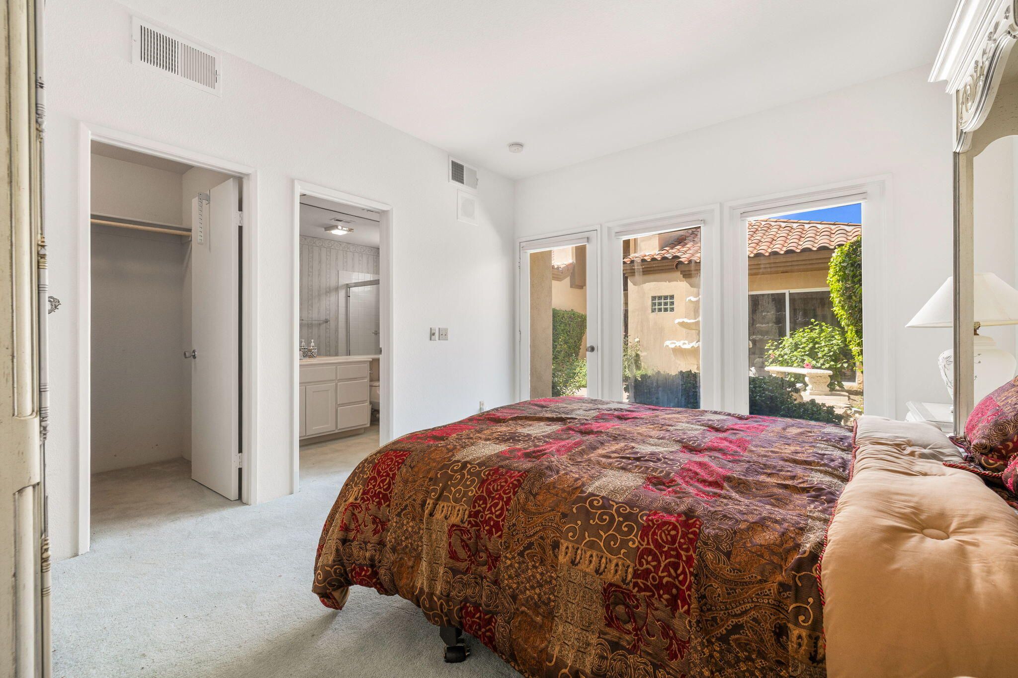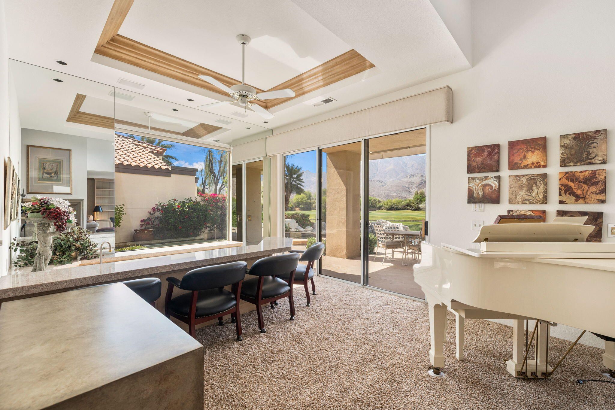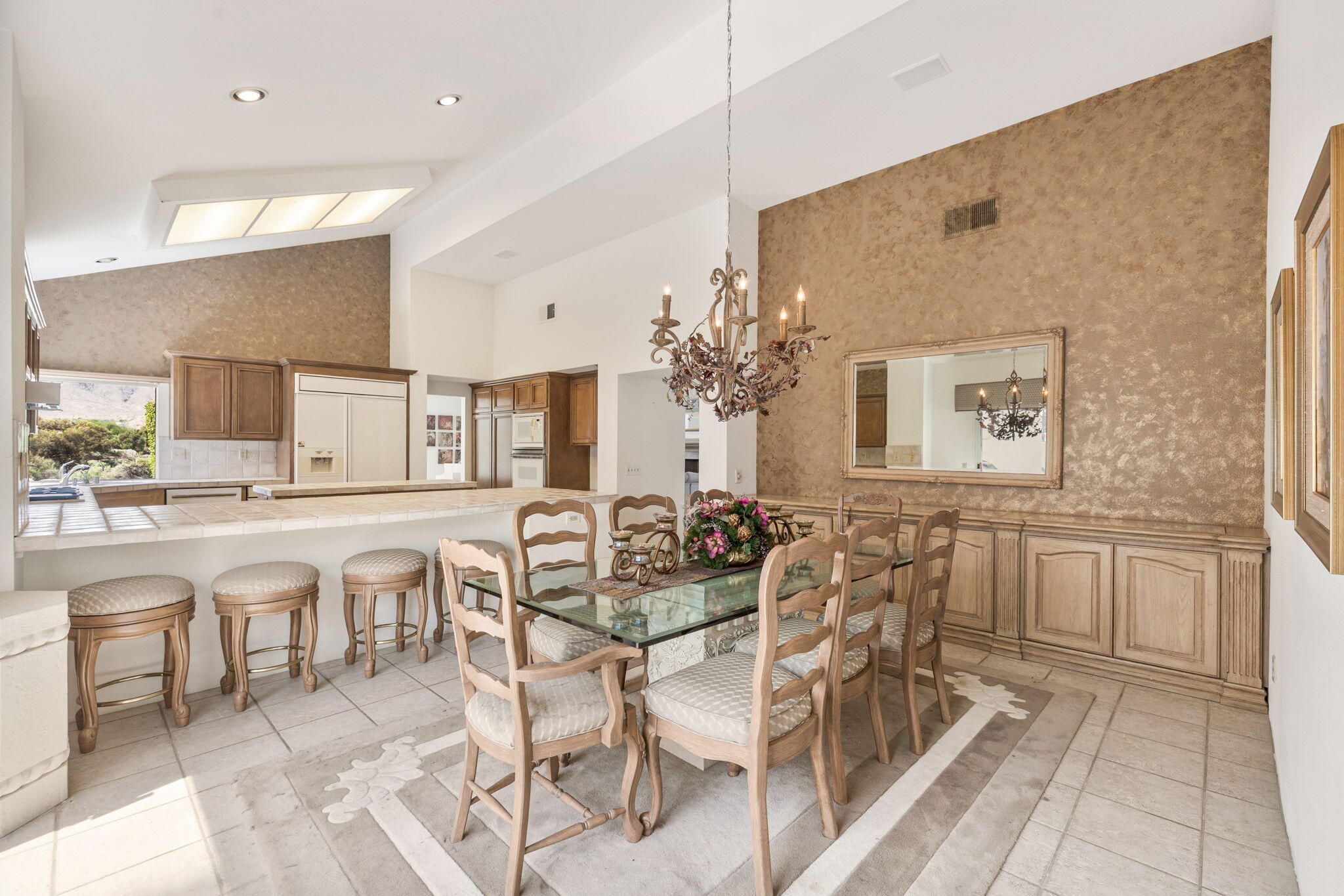 OPPORTUNITY awaits you to TRANSFORM this original 1990 residence into your own CUSTOM RETREAT. Located on the 16th hole of the PGA Nicklaus Private Course, this property captures unobstructed SOUTHWEST VIEWS overlooking the private pool and spa, fairway, lake, and the breathtaking 180-degree panorama view of the Santa Rosa Mountain range. MAIN home features a spacious living area with vaulted ceilings, fireplace, and sit-down wet bar, all oriented to take in the spectacular golf course and mountain views. Large patio doors open to the entertainment patio with a retractable awning creating seamless indoor-outdoor living. The expansive kitchen and dining area open to the BBQ patio, ideal for casual gatherings and entertainment. PRIMARY Bedroom suite and GUEST Bedroom suite both offer ensuite baths and sliding glass doors opening to the private interior courtyard. A converted GUEST Bedroom now serves as a den or media room just off the living room with a private two-piece lavatory and sliding glass doors opening to the view patio. A guest POWDER room and oversized LAUNDRY room complete the main residence. DETACHED CASITA overlooks the private interior courtyard, offering wonderful flexibility for guests or a private office. The property also includes a large two-bay attached garage plus a separate entry golf cart garage attached to the Casita-ideal conversion to an art studio, workshop, or additional creative space. This is a rare opportunity to RENOVATE, UPGRADE, and LANDSCAPE to your personal taste while enjoying an exceptional setting and unforgettable views.