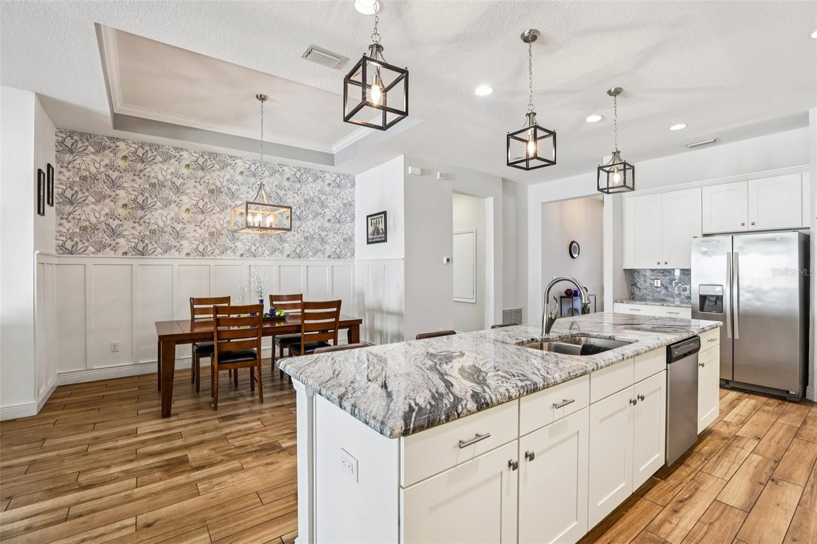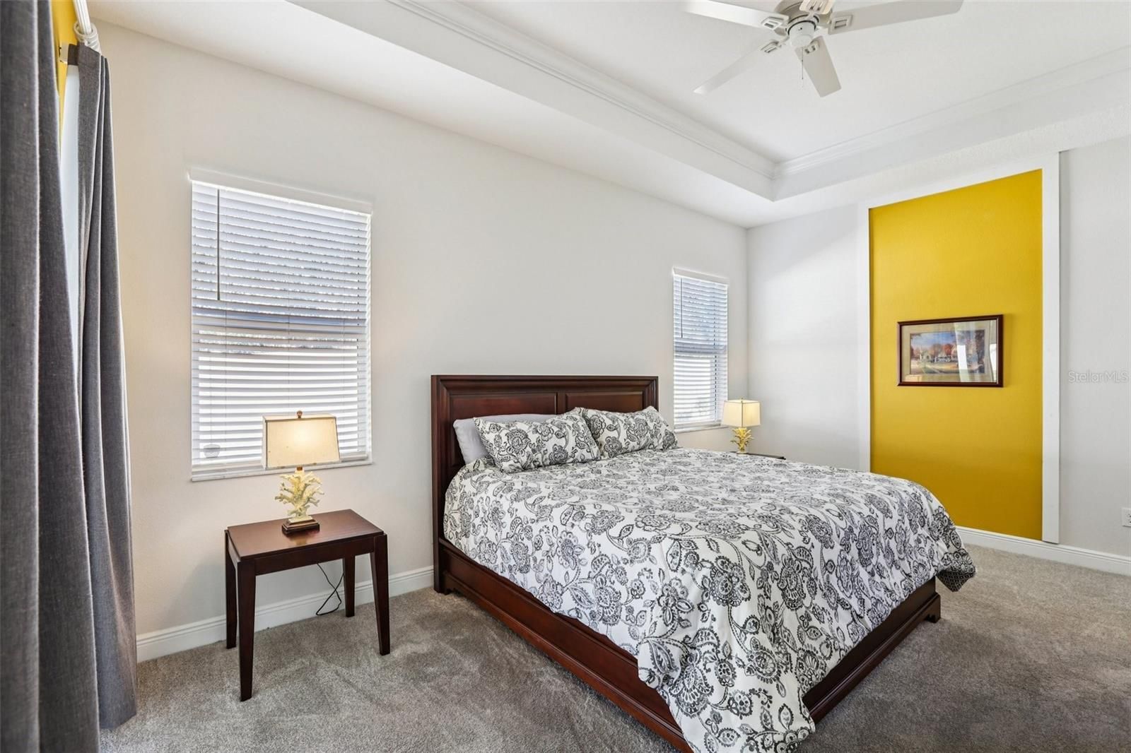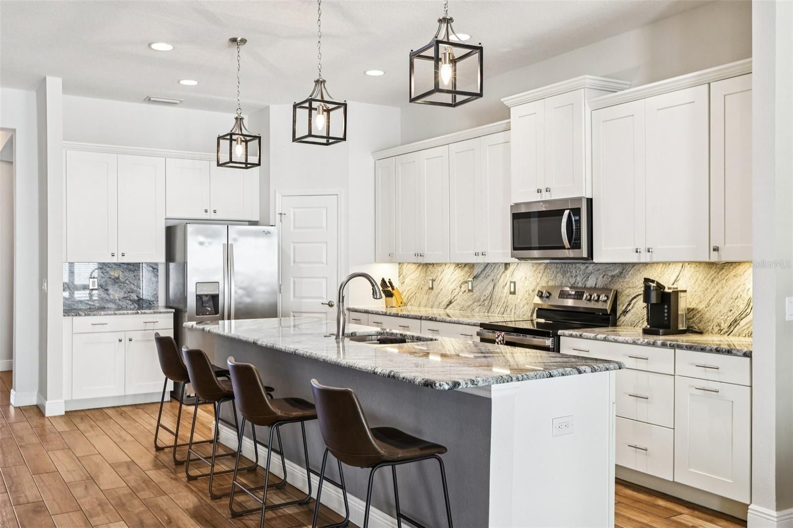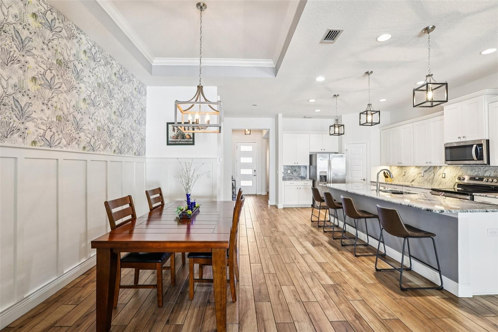 - Ceiling Fan(s), Eat-in Kitchen, High Ceilings, Kitchen/Family Room Combo, Living/Dining Room, Open Floorplan, Solid Surface Counters, Solid-Wood Cabinets, Tray Ceiling(s), Walk-In Closet(s)