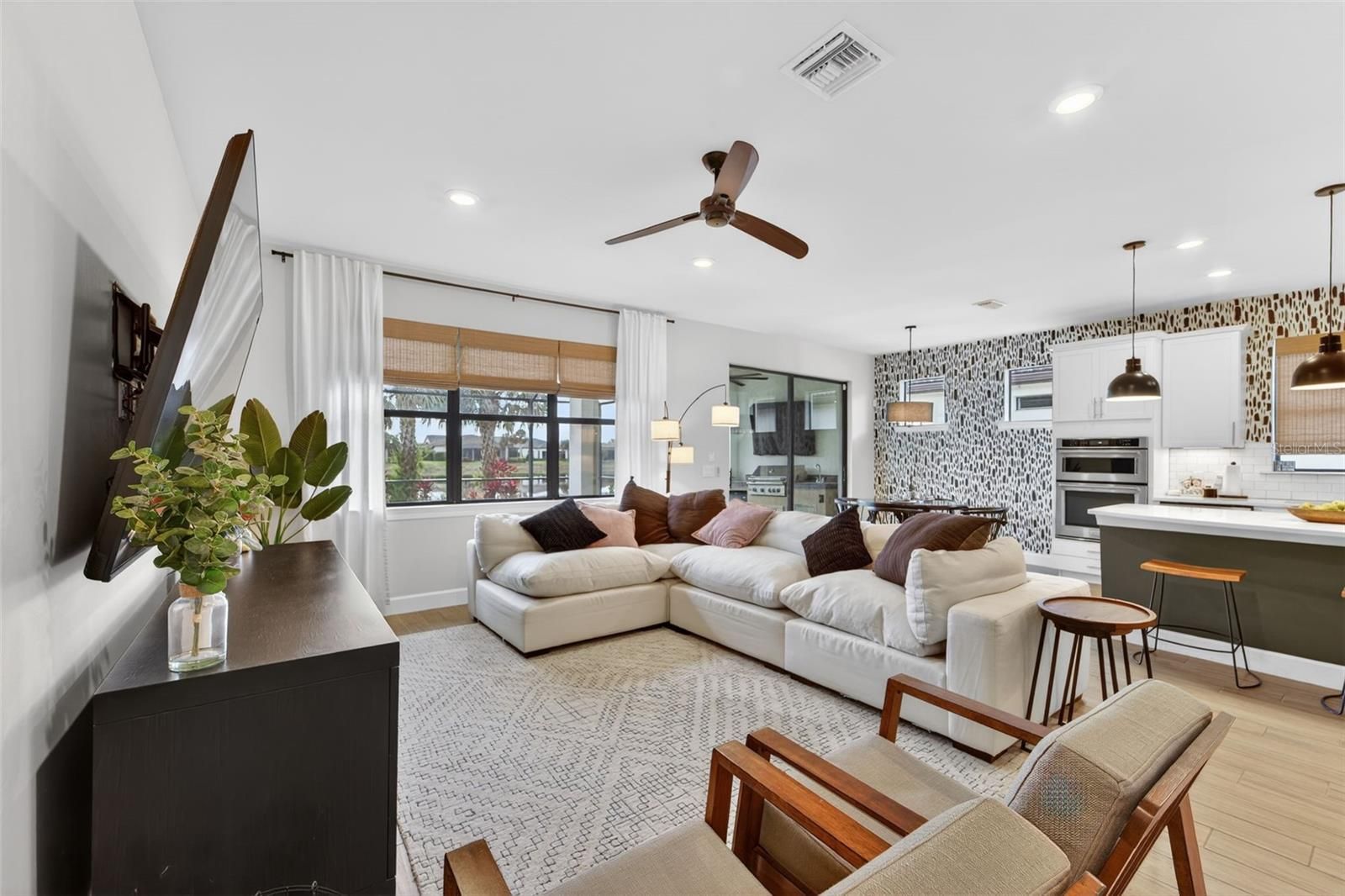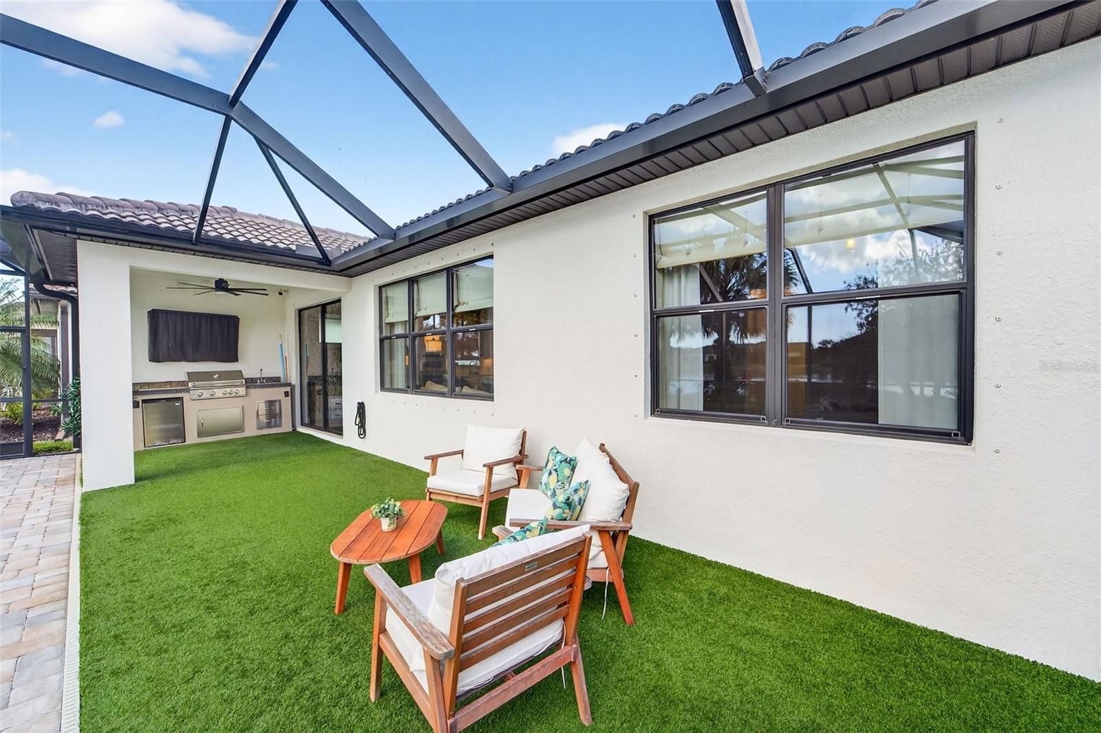 Beautifully designed Lakefront Abbeyville 2 bed -2 bath with den home offering an open and spacious 1,683 sq. ft. layout with abundant natural light, soaring ceilings, and refined finishes throughout. The chef’s kitchen includes a 5-burner gas range, white cabinetry, decorative tile backsplash, stainless steel appliances, and a large island with generous seating. The split-bedroom floor-plan provides excellent privacy, featuring a guest bedroom with its own en-suite bath at the front of the home and an Owner’s Suite at the rear with dual sinks and a comfortable, spa-like design. A versatile flex room near the guest suite is ideal for a home office, den, hobby room, or additional sleeping space. A centrally located laundry room enhances everyday convenience. Outdoor living shines with a paver-brick lanai, sparkling pool and spa, and peaceful lake views. This is a very dog friendly home with a professional installed Pet Astro turf area . For animal enthusiast this is a game changer. Additional home features include full hurricane shutters and an epoxy-coated 2-car garage. This resort-style community offers a clubhouse with activities director, tennis, pickleball, fitness center, resort pool, dog park, playground, and more. Located in Palmer Ranch near shopping, dining, world-renowned beaches, the Legacy Trail, and downtown Sarasota.