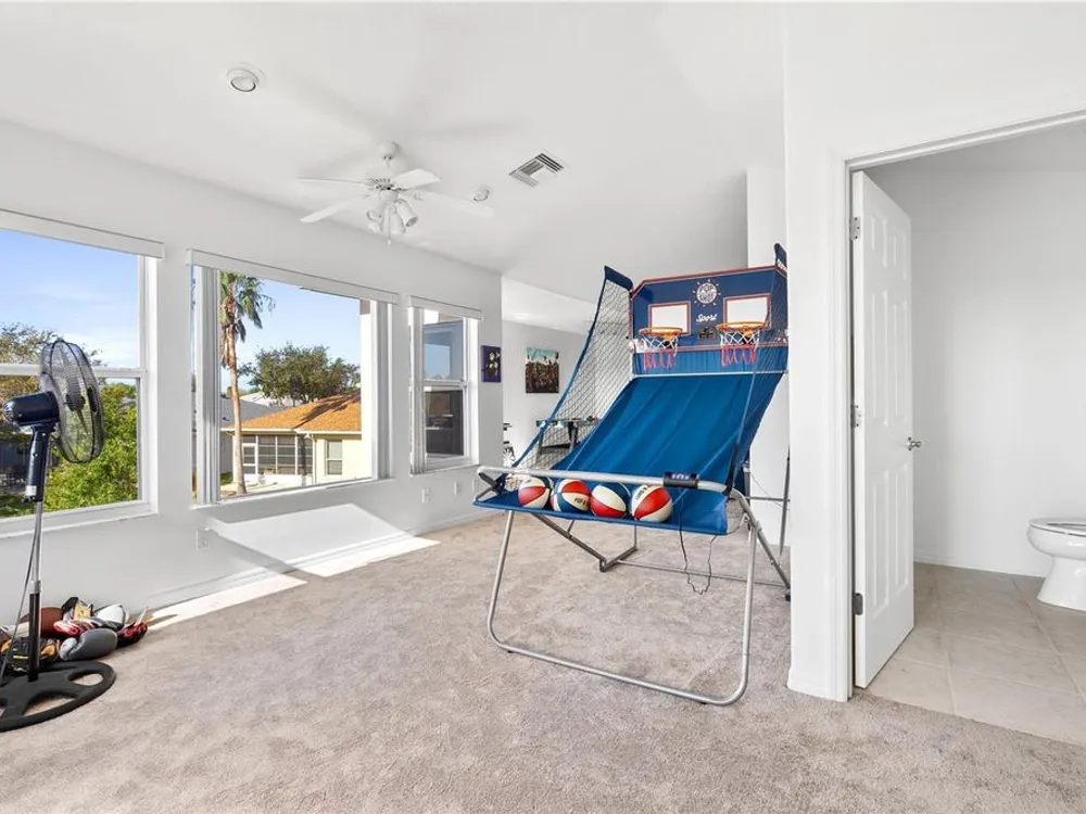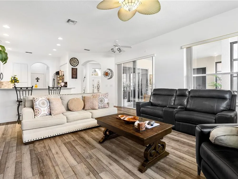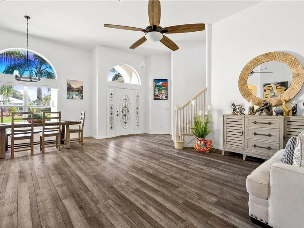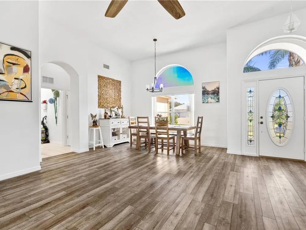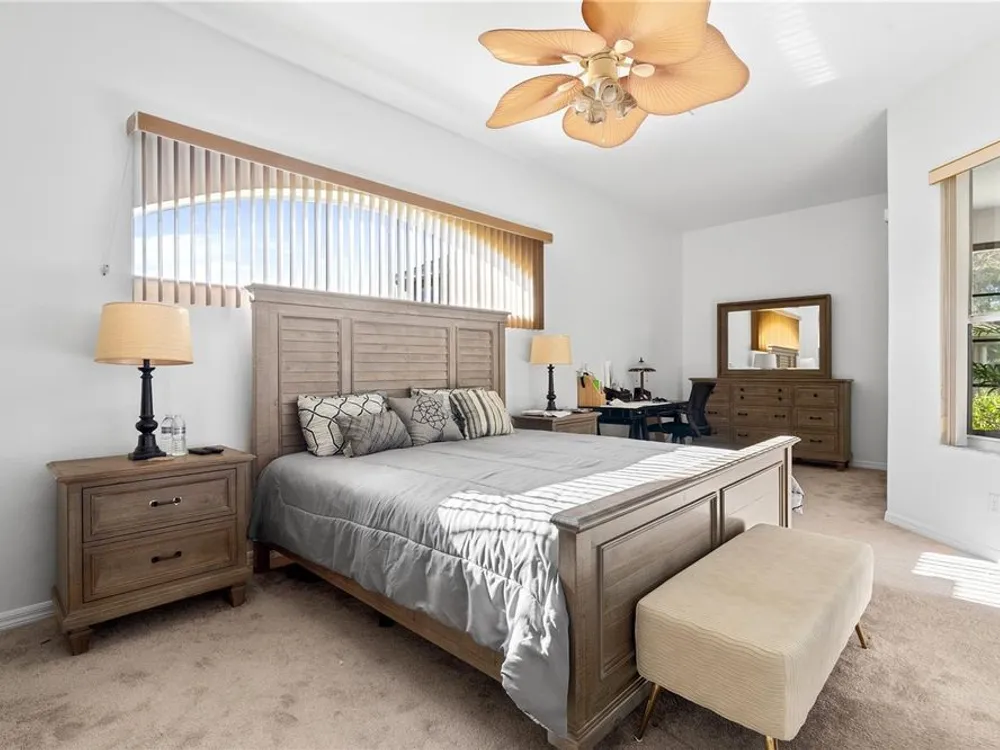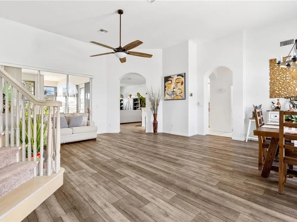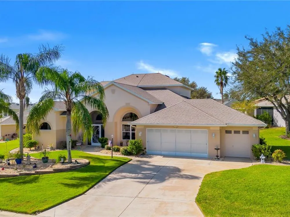 Experience the best of Florida living in the heart of Tavares, the Seaplane Capital. From the moment you arrive, the meticulously landscaped yard sets the tone for this beautifully maintained home. Inside, the open living and dining area is ideal for entertaining, seamlessly connecting to the enclosed lanai for easy indoor-outdoor living. The split floor plan offers privacy, featuring a spacious primary suite with direct lanai access and space for a cozy reading nook or home office. The primary bath has a spa-like feel with a walk-in shower, dual sinks, and full handicap accessibility. The upgraded kitchen overlooks the family room, highlighted by a striking stone accent wall—perfect for relaxed gatherings. Off the family room are two additional bedrooms and a guest bath with a solar tube skylight that fills the space with natural light. Upstairs, discover a versatile fourth bedroom and bonus area with panoramic lake views, dual closets, a wet bar, and a half bath. This space easily adapts as a guest suite, game room, fitness area, or craft retreat. Recent updates include a new three-zone AC system installed in October 2024. The large driveway leads to an oversized two-car garage, separate golf cart garage, and ample parking and storage. Located in Royal Harbor, a premier gated 55+ golf cart community, residents enjoy exceptional amenities—an Olympic-size enclosed pool, pickle ball and tennis courts, a clubhouse with fitness center, craft rooms, library, and billiards room—plus storage for boats, RVs, and recreational vehicles.