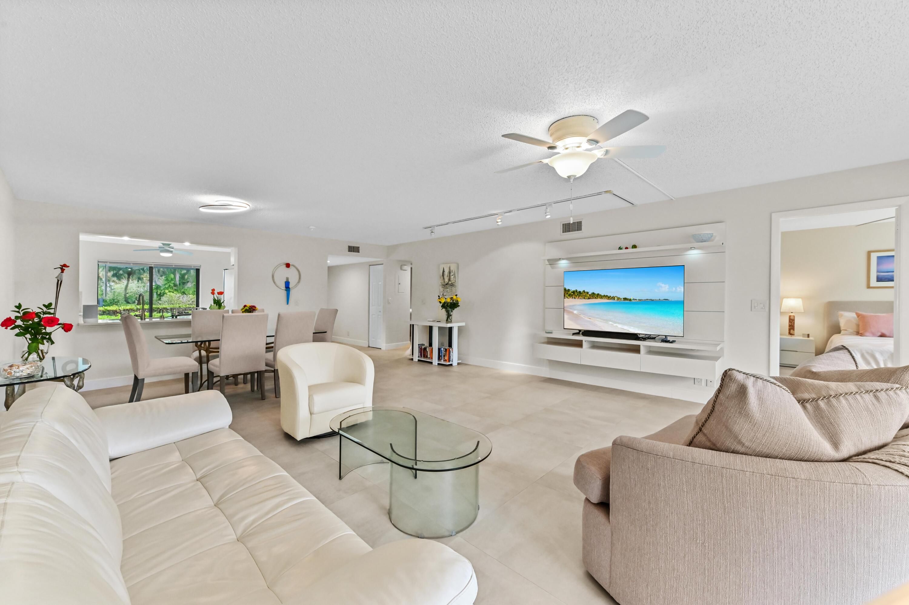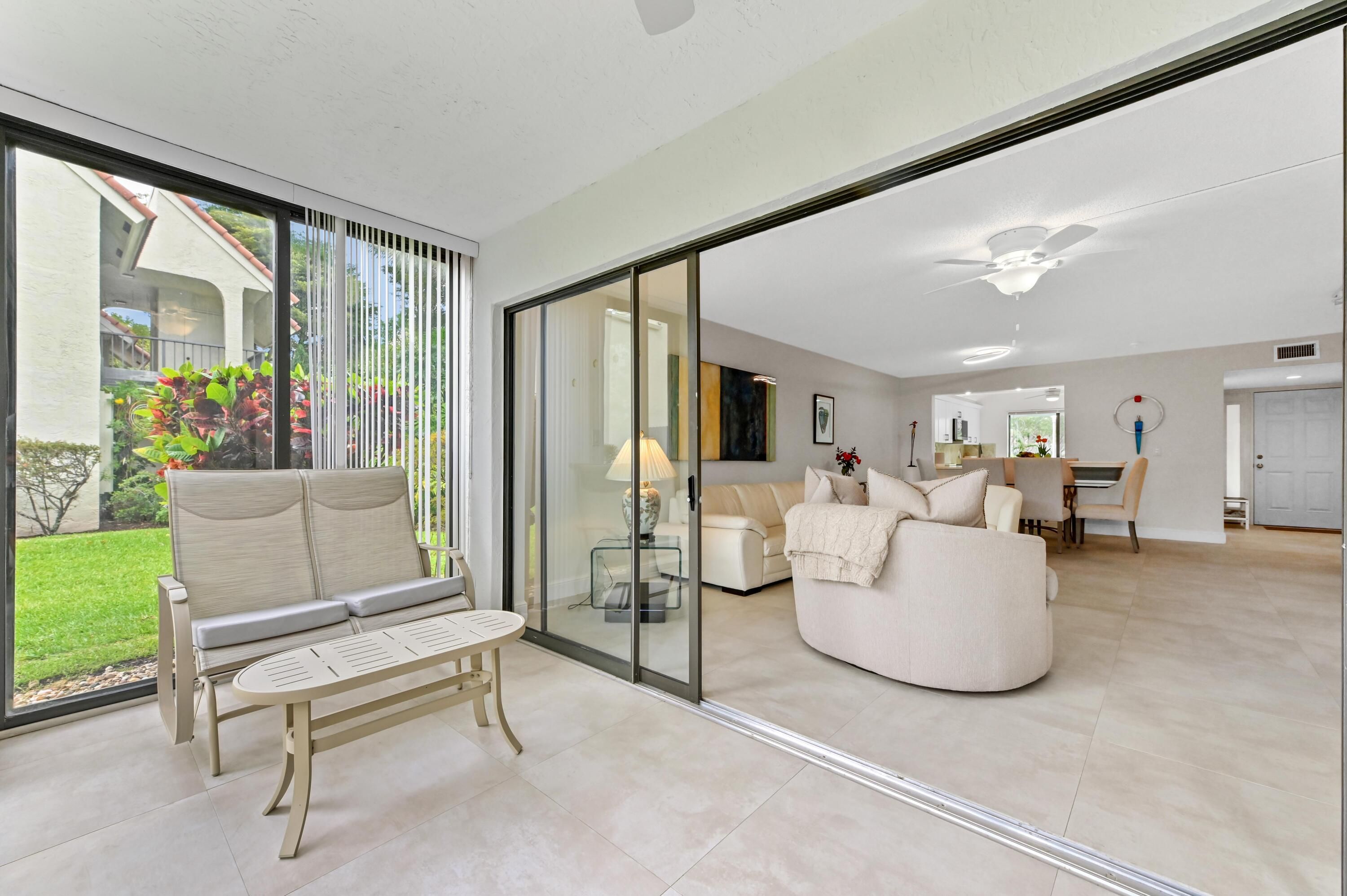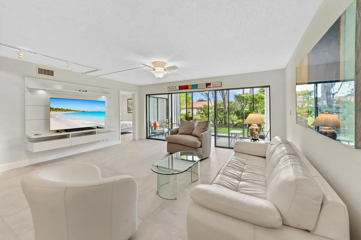 Welcome to this beautifully maintained first-floor residence in the sought-after Fairway Park 55+ community of Indian Spring. This spacious condo offers a bright, open layout with seamless flow between the living, dining, and kitchen areas—perfect for both everyday living and entertaining. Large sliding glass doors invite in natural light and lead to a private patio where you can relax and take in serene water and garden views, creating a peaceful backdrop that truly elevates the home's ambiance. Inside, you'll find a thoughtfully designed split-bedroom floor plan, generous closet space, and a well-appointed kitchen that connects effortlessly to the main living areas. Residents enjoy the comfort and security of a gated, guard-patrolled community along with access to resort-style amenities, all within a tranquil, well-kept setting. The location offers the perfect blend of privacy and convenience—just minutes from shopping, dining, golf, and everything Boynton Beach has to offer. Whether you're looking for a full-time residence or a seasonal retreat, this home delivers a relaxed Florida lifestyle with beautiful surroundings, modern updates, and an inviting sense of space.