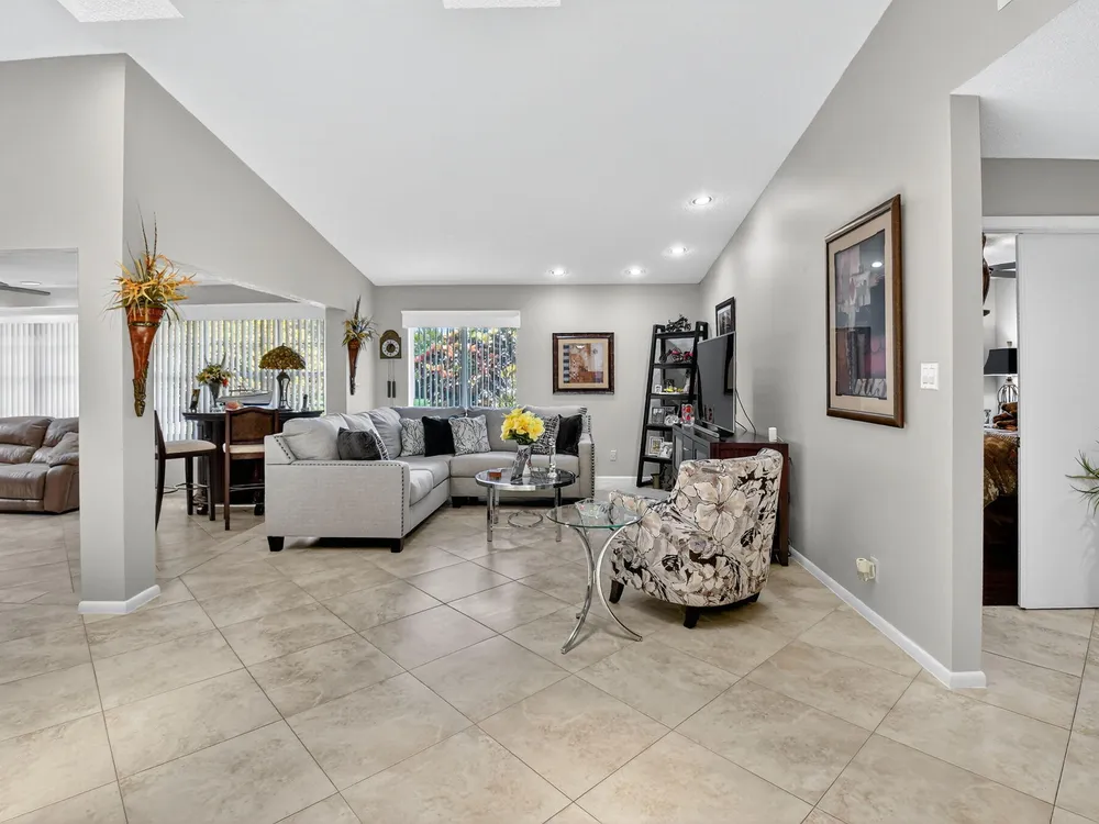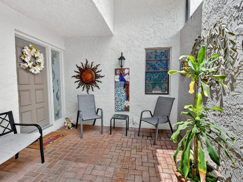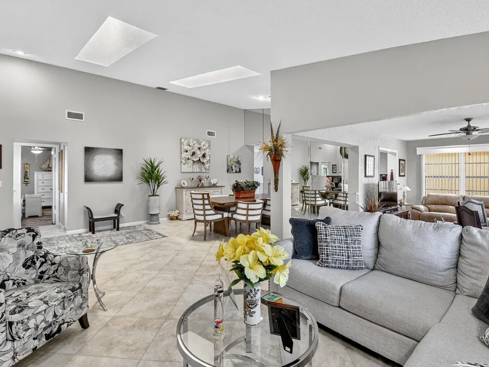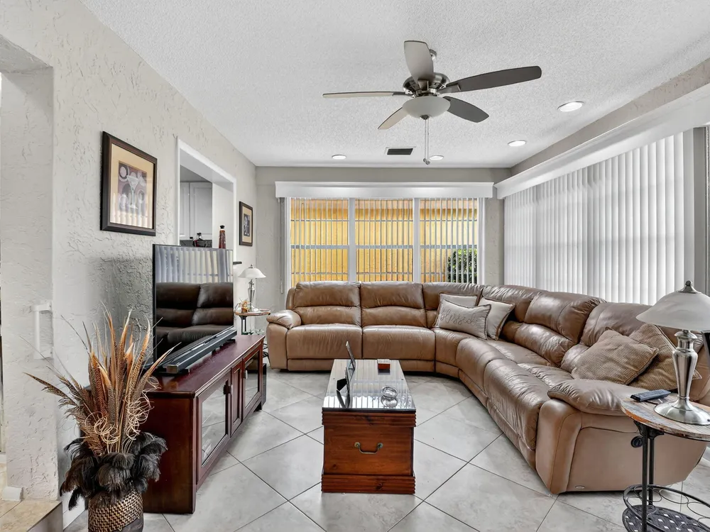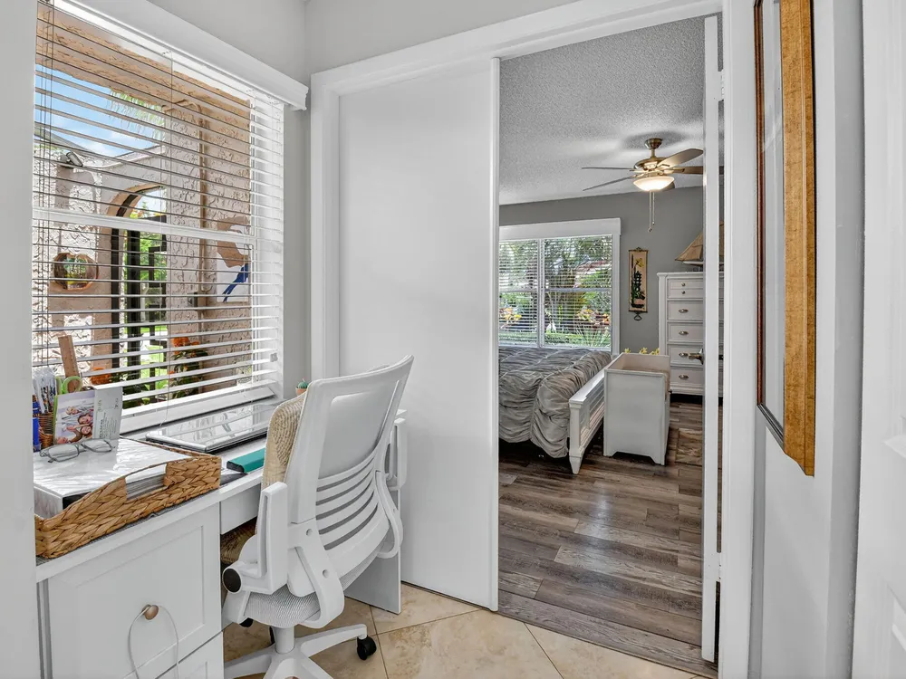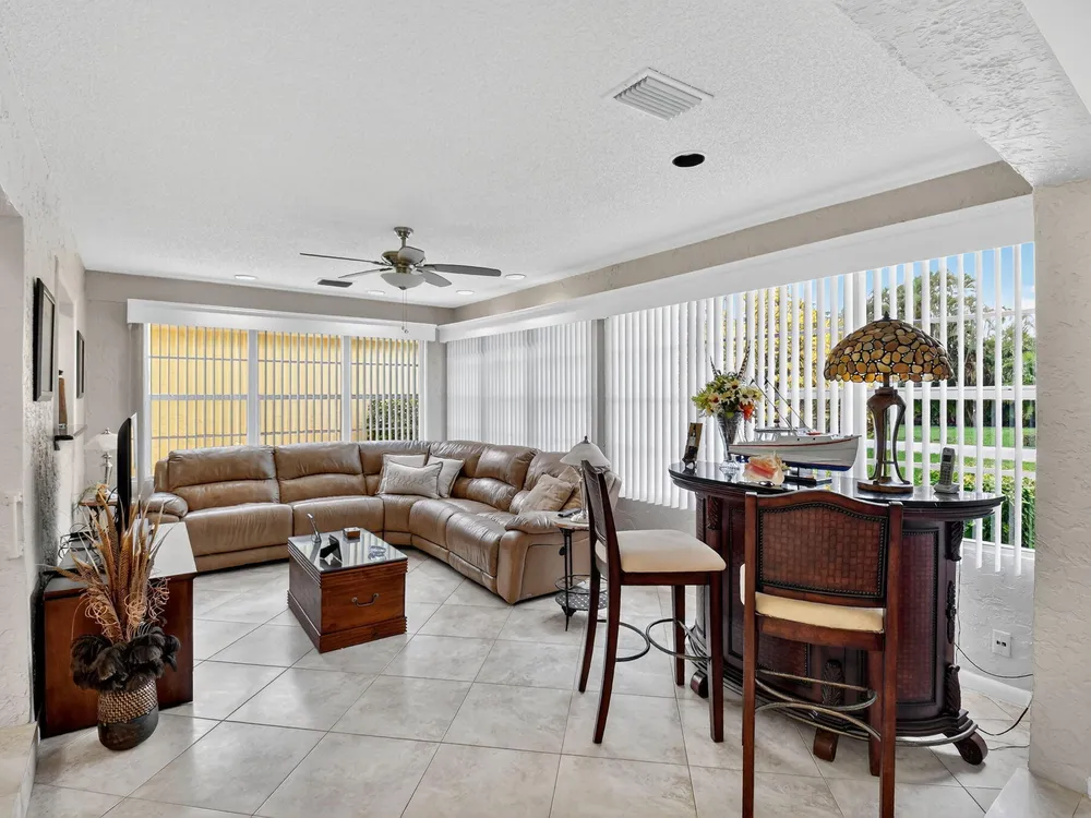 Welcome to this hidden gem located in the highly desirable Villas of Green Glen within the 55+ prestigious Indian Spring Country Club with no mandatory membership. This charming 2 bed 2 bath home has a vaulted ceiling with sky lights giving and abundance of light , an almost all open floor plan with tile throughout the main house and laminated floors in the bedrooms. This home has been beautifully maintained has an updated kitchen with marble backsplash, built in wine rack and has sliding doors to a private patio for grilling and unwinding adding extra living space.The master bedroom boast a walk in closet plus 2 additional closets