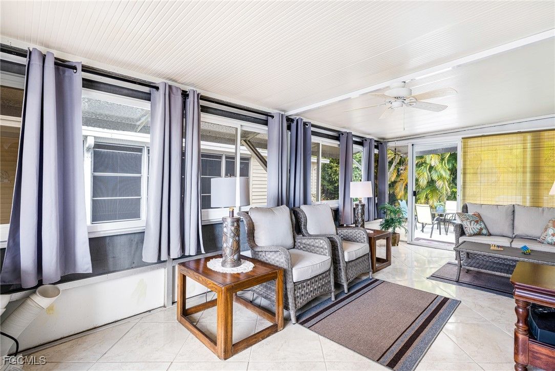 This well-maintained corner-lot home offers comfortable living in an active 55+ gated community. Featuring two bedrooms, two full bathrooms, and a spacious, light-filled living and dining area, the layout is both functional and inviting with plenty of storage. Recent improvements include a newer roof, new flooring, updated cabinets, and an updated primary bath, creating a move-in-ready interior. An expanded Florida room provides versatile additional living space, ideal for relaxing or entertaining year-round. Enjoy the beautiful Florida weather on the secluded patio and the convenience of being just a short walk to the expansive new pool and hot tub at the clubhouse. Experience nine acres of natural beauty at the Palm Point waterfront area, complete with a fishing pier, picnic tables, tiki huts, and spectacular views of the river and downtown Fort Myers. The community offers an exceptional lifestyle with a Gulf-access marina, boat slip rentals, and a full calendar of social activities. Additional amenities include a workout center, pickleball courts, bocce, shuffleboard, and tennis—bringing resort-style living right to your doorstep. Schedule your showing today and discover your own “Peace” of Paradise.