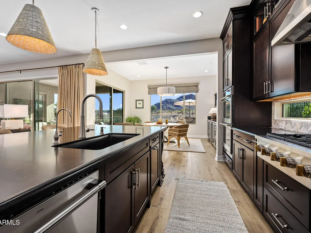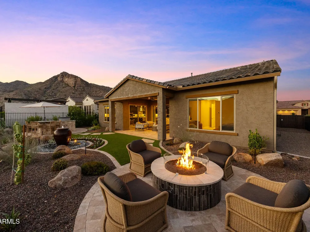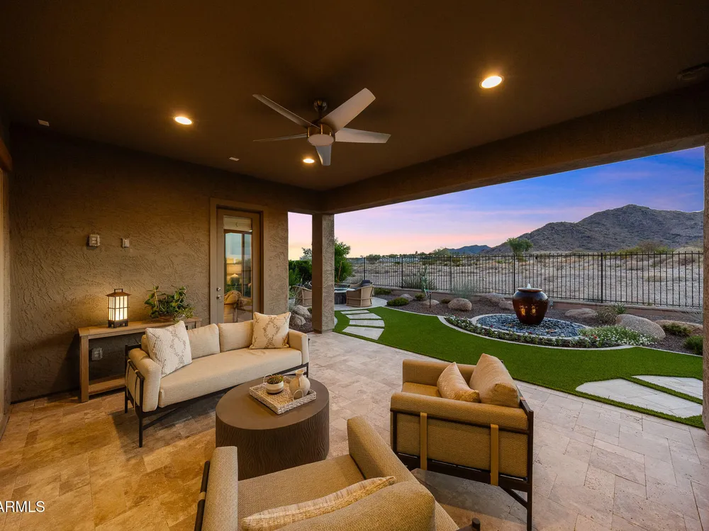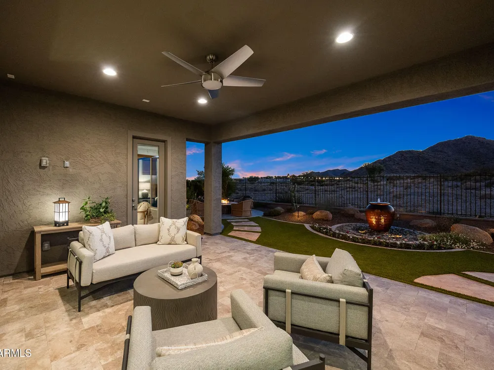 EXCEPTIONAL Taylor Morrison Shire floorplan on 9th tee box of Victory course capturing awesome views of open space & mountains. Highly upgraded throughout in every detail: Great room w/16' sliders to extended covered patio; Chef's kitchen w/top of line cabinets/appliances, lighting, counters; dining buffet cabinetry w/wine & Bev coolers; beautiful laminate wood flooring, custom lighting; Owners' retreat w/custom window treatments, upgrade bath fixtures & tile; two guest rooms w/upgraded ensuite baths; spacious office/den; Creative Environments landscape incl travertine, stacked stone BBQ island, fire pit, water feature, lighting; and the VIEW! See docs tab for extensive list.