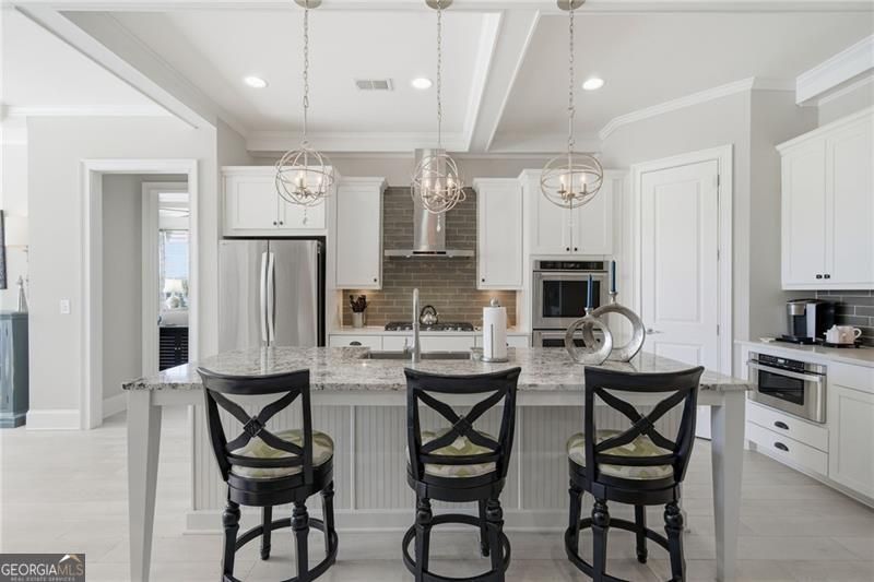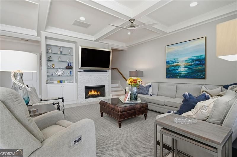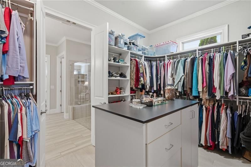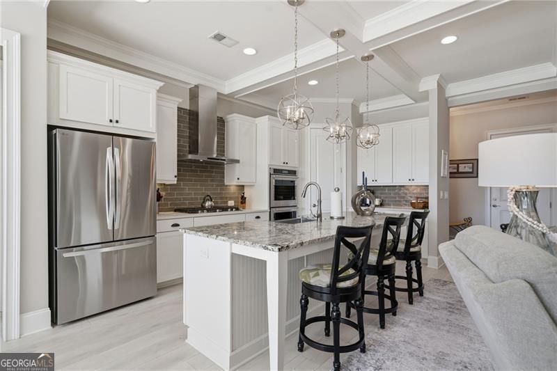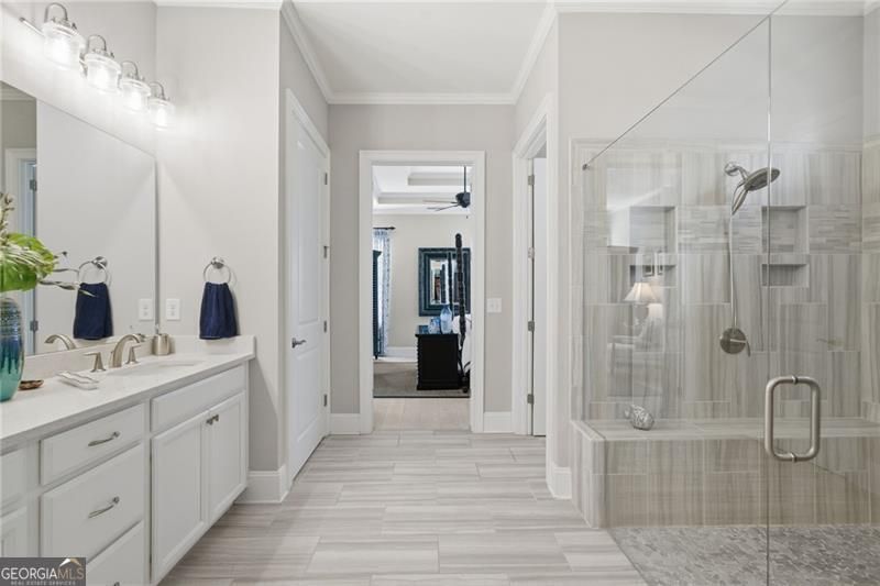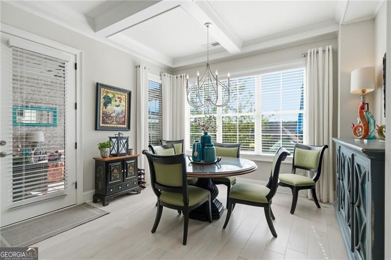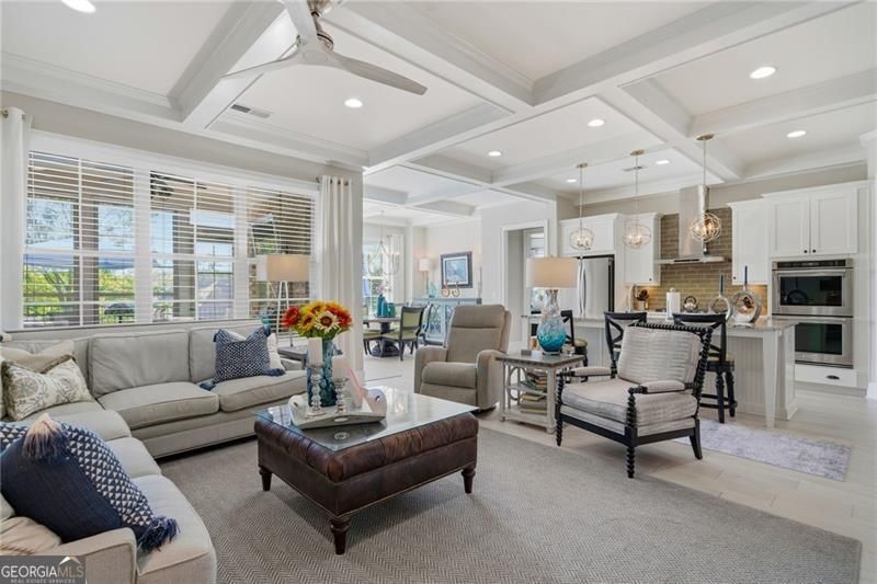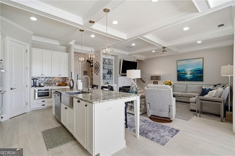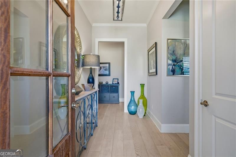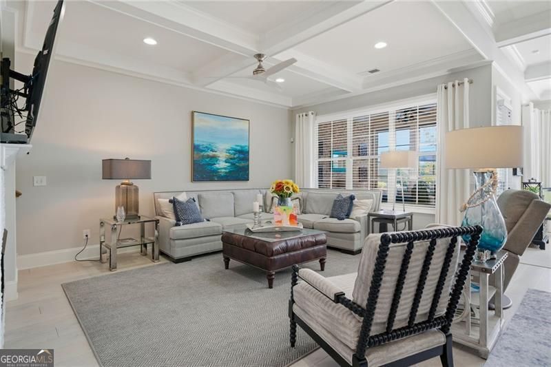 Impeccably Maintained Home with Premium Park View in Coveted Jim Chapman Gated Community This beautifully cared-for home sits on a prime lot in the highly desirable Jim Chapman Active Adult gated community, offering tranquil views overlooking Chattahoochee Pointe Park. A welcoming covered flagstone and brick front porch opens to a spacious foyer and an open-concept layout with 10-foot ceilings, gleaming hardwood floors, plantation shutters across the front, and abundant natural light streaming through three sides of this desirable end unit. The chef's kitchen is a dream featuring 42-inch high-end cabinetry, generous granite and quartz counter space, a wall double oven, five-burner gas cooktop, drawer microwave, and a large stainless farmhouse undermount sink. A large custom china and crystal closet provides elegant and practical storage, ideal for fine serveware, linens, silver, or even kitchen appliances. Enjoy bar seating at the island or gather in the bright dining area beneath the coffered ceiling that extends into the great room. The great room offers a warm, elegant atmosphere with a gas fireplace, built-in bookcase, and access to the sunroom, which features state-of-the-art windows providing beautiful, year-round views. Step outside to the extended flagstone patio one of the finest outdoor living spaces in the community perfectly positioned to overlook the park and enjoy peaceful mornings or relaxing evenings. The primary suite on the main level is spacious and inviting, with hardwood flooring extended from the living areas, a luxurious ensuite bath showcasing an oversized frameless glass shower with two shower heads and a bench, a linen closet, and a large walk-in closet with a custom organization system. Direct access to the laundry room from the primary closet adds everyday convenience. A guest bedroom and upgraded full bath on the main level provide comfort and privacy for visitors, while a drop zone with built-in bench at the garage entry adds both function and charm. Hardwood treads lead to the upper level, which offers 9-foot ceilings, two spacious bedrooms connected by a Jack-and-Jill bath, one featuring a huge walk-in closet, plus hallway attic access for additional storage. The main level is wheelchair accessible, ensuring comfort and ease of living for all.
