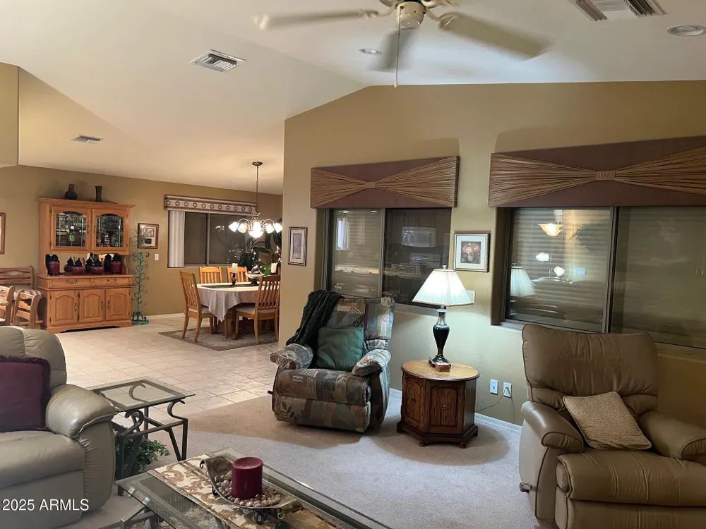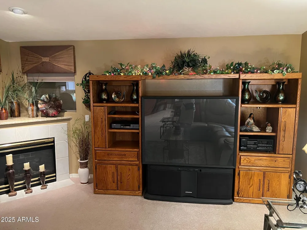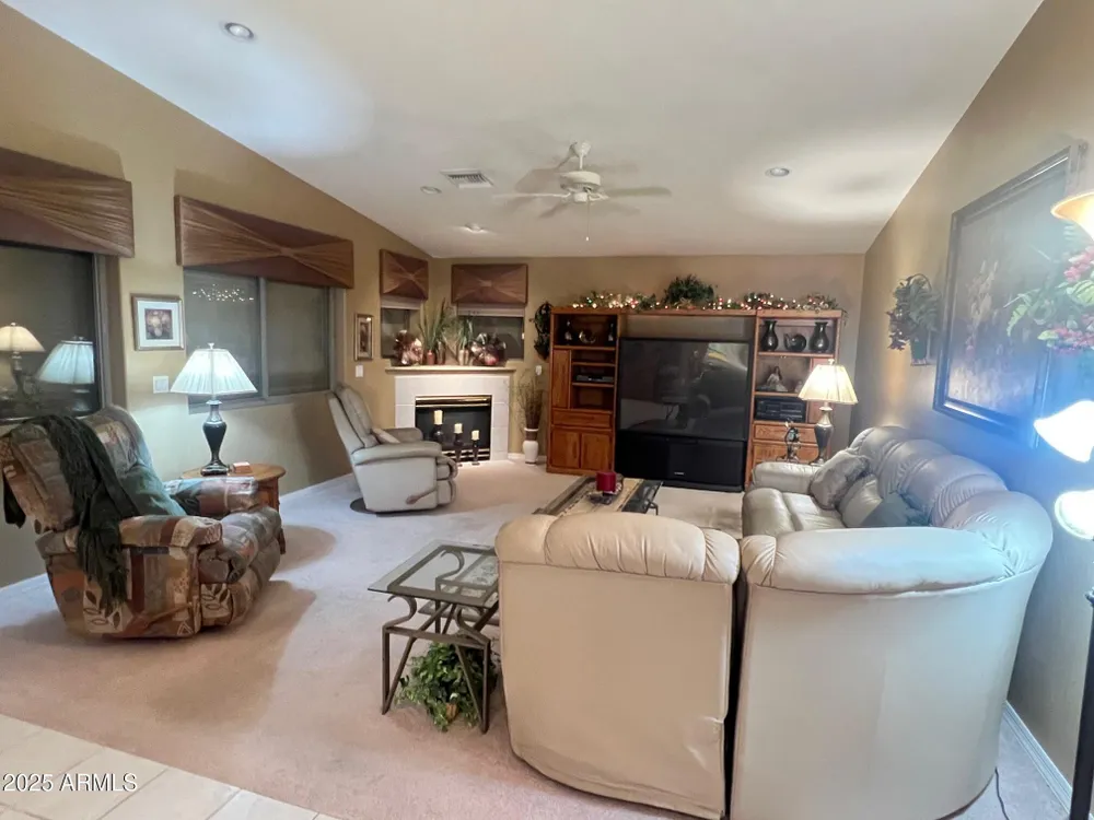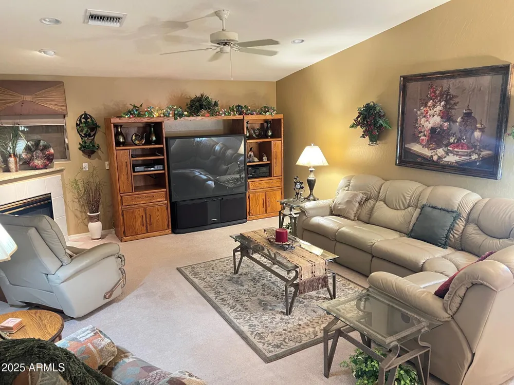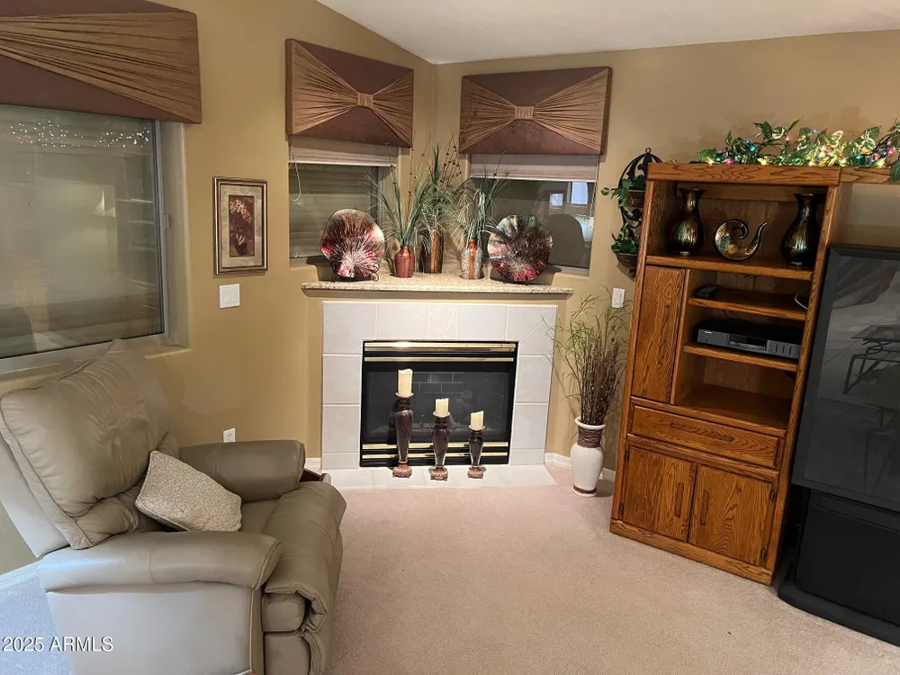 Welcome to this spectacular fully furnished 3 bedroom, 2 bath home nestled in the desirable 55+ community of Apache Wells. This home features a mix of tile and carpet flooring, vaulted ceilings, and a spacious living room with a cozy fireplace for comfortable gatherings. The modern kitchen boasts an oversized breakfast bar and a formal dining area. The primary bedroom offers two separate sink areas and an oversized walk in closet. Enjoy the cozy rooms and updated baths. Step outside to the covered patio and take in the serene backyard views overlooking the golf course. All windows have electric shutters. 2.5 car garage with built in storage cabinets. This home provides a perfect blend of comfort and convenience in a truly amazing subdivision. Very close to club house and amenities