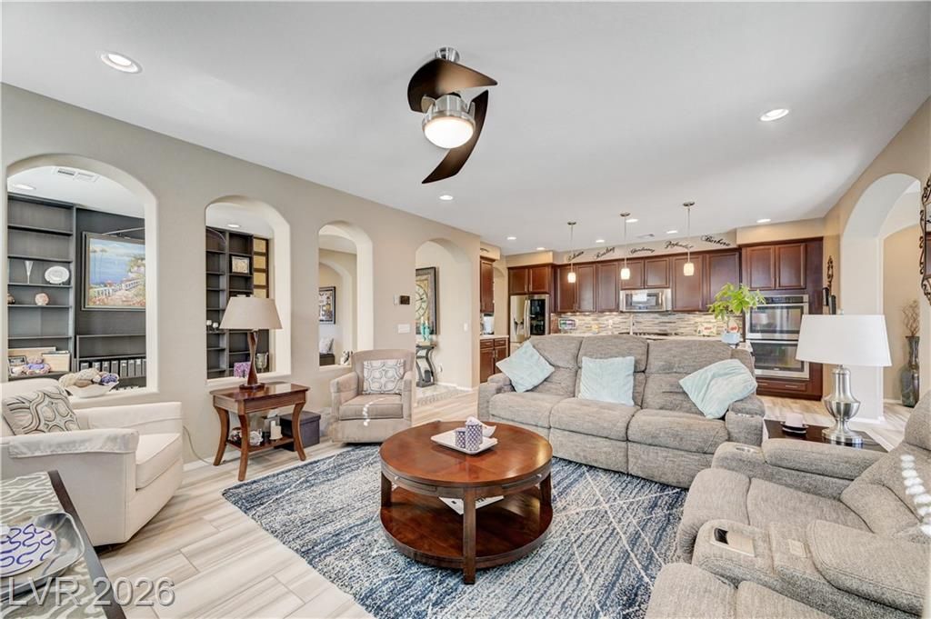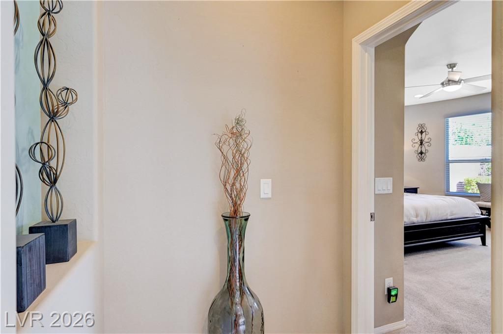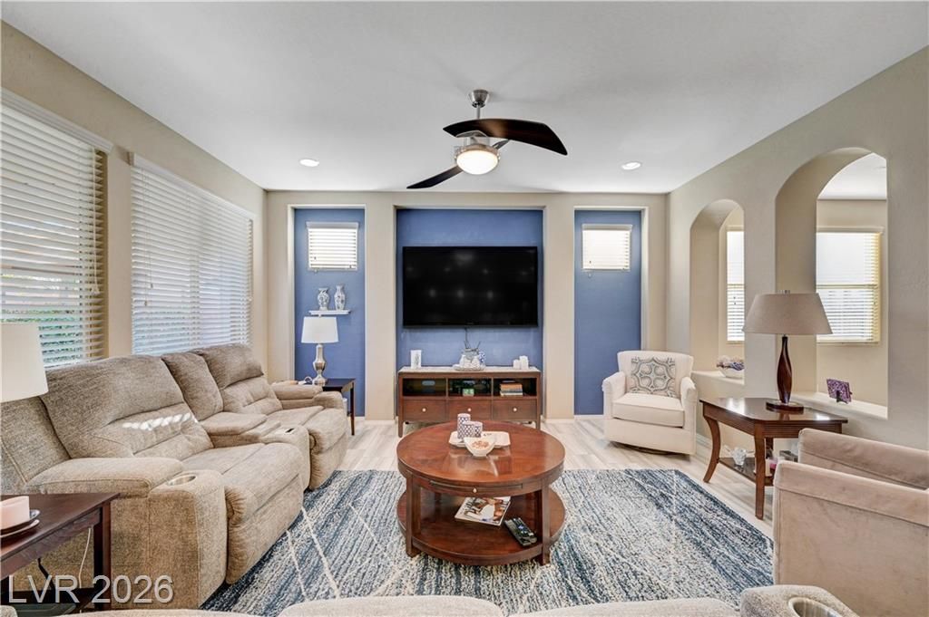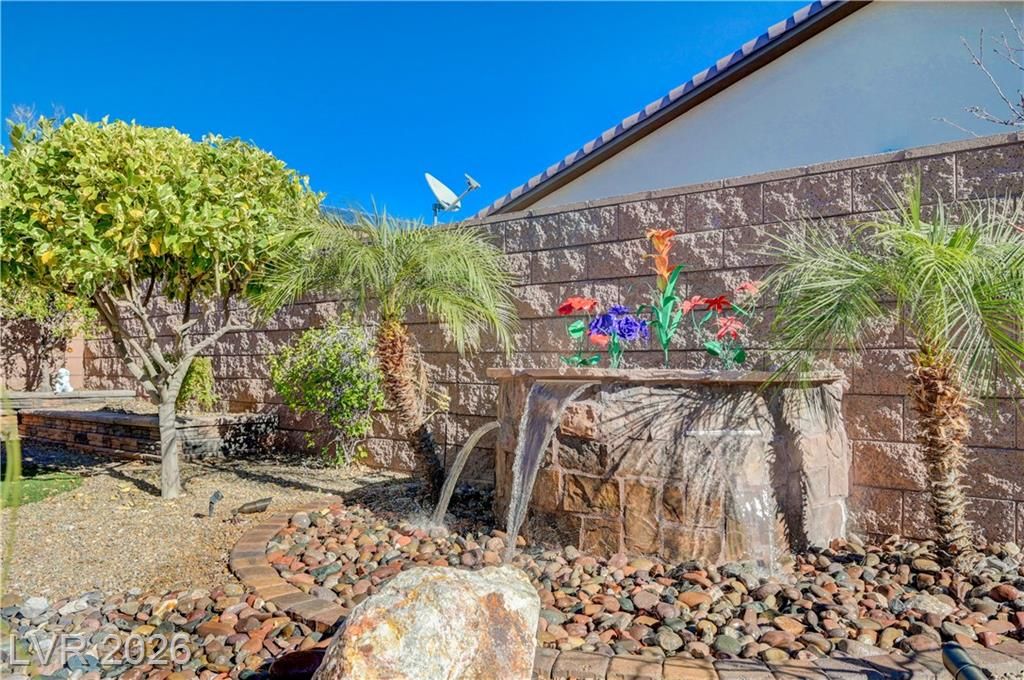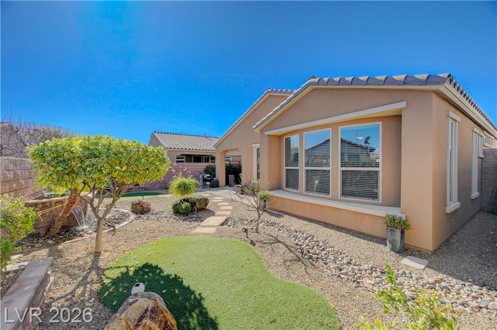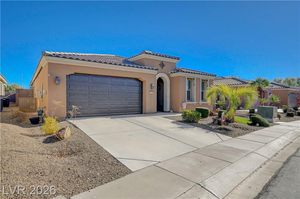 AGE RESTRICTED 55+ Resort Style Living. Gated. Prepaid Solar Panels. Close to New State of The Art VA Hospital and Shopping. Easy Access to the 215 and I-15. True Pride of Ownership. WOW!! Tons of Upgrades. New A/C and Water Heater 2024. Custom Front Door Opens to Beautiful Custom Flooring. 2 BR's Plus a Den - Can easily be 3rd BR. Additional Room for Office, Crafts etc in The Smart Space. Entertainers Dream - Chef's Kitchen - Large Island, Double Ovens, Upgraded Counters and Cabinets, UnderCabinet Lighting and Coffee Bar. S/S Appliances. Walk In Pantry. Primary Suite - Bay Window, Double Sinks, Custom Tiled Shower, Walk In Closet. Separate from the Primary is the Guest Quarters with 2nd BR and Bath with Shower/Tub. Large GreatRoom with Arches to the Den. Extended Formal Dining Room has a Rolling Wall of Glass to the Extended Patio with Remote Sunshades. BackYard Oasis with Water Fountain. Garage Cabinets and EV Charger. Clubhouse has 2 Pools, Spa, Gym, Tennis, Pickleball, Pet Park etc
