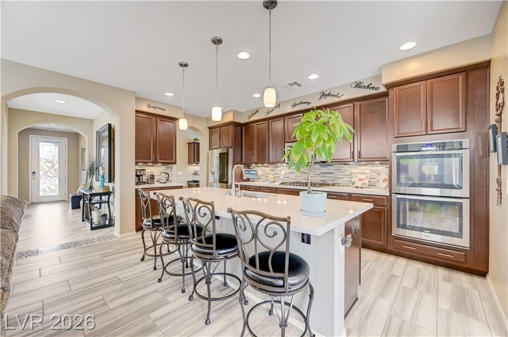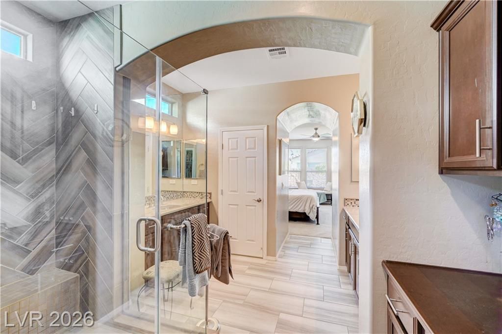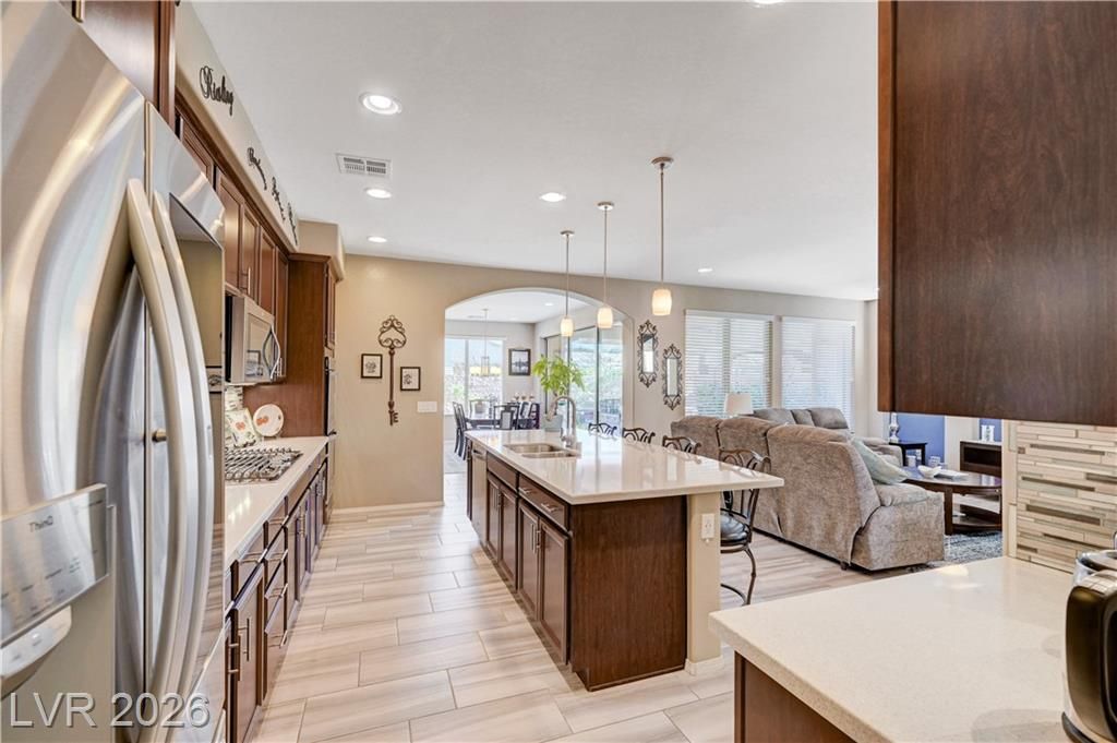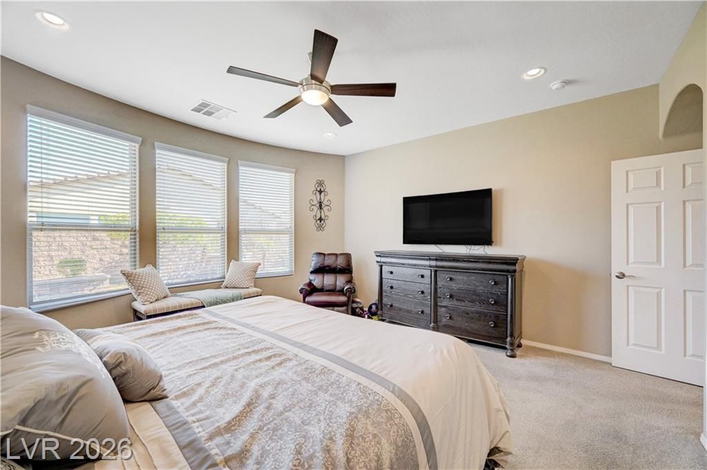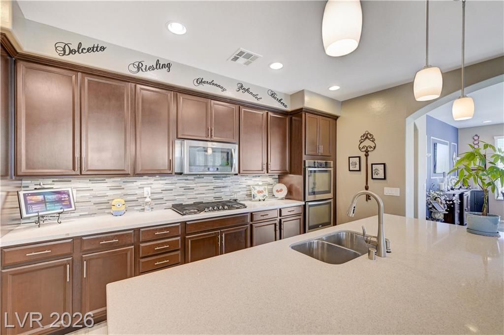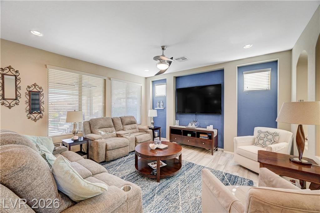 AGE RESTRICTED 55+ Resort Style Living. Gated. Prepaid Solar Panels. Close to New State of The Art VA Hospital and Shopping. Easy Access to the 215 and I-15. True Pride of Ownership. WOW!! Tons of Upgrades. New A/C and Water Heater 2024. Custom Front Door Opens to Beautiful Custom Flooring. 2 BR's Plus a Den - Can easily be 3rd BR. Additional Room for Office, Crafts etc in The Smart Space. Entertainers Dream - Chef's Kitchen - Large Island, Double Ovens, Upgraded Counters and Cabinets, UnderCabinet Lighting and Coffee Bar. S/S Appliances. Walk In Pantry. Primary Suite - Bay Window, Double Sinks, Custom Tiled Shower, Walk In Closet. Separate from the Primary is the Guest Quarters with 2nd BR and Bath with Shower/Tub. Large GreatRoom with Arches to the Den. Extended Formal Dining Room has a Rolling Wall of Glass to the Extended Patio with Remote Sunshades. BackYard Oasis with Water Fountain. Garage Cabinets and EV Charger. Clubhouse has 2 Pools, Spa, Gym, Tennis, Pickleball, Pet Park etc