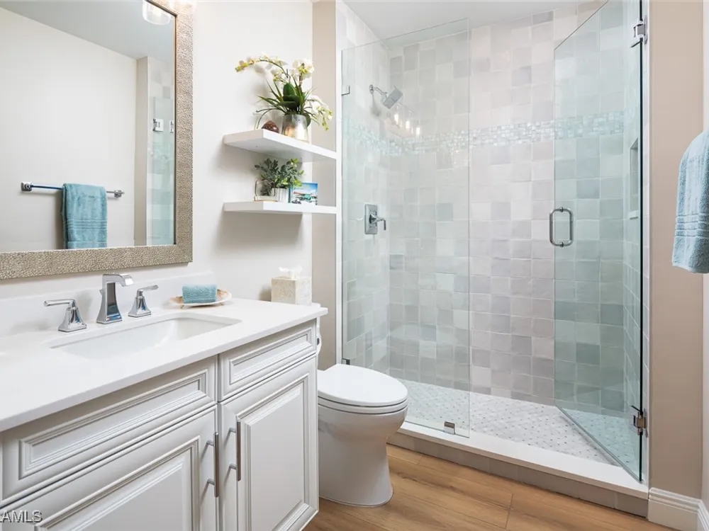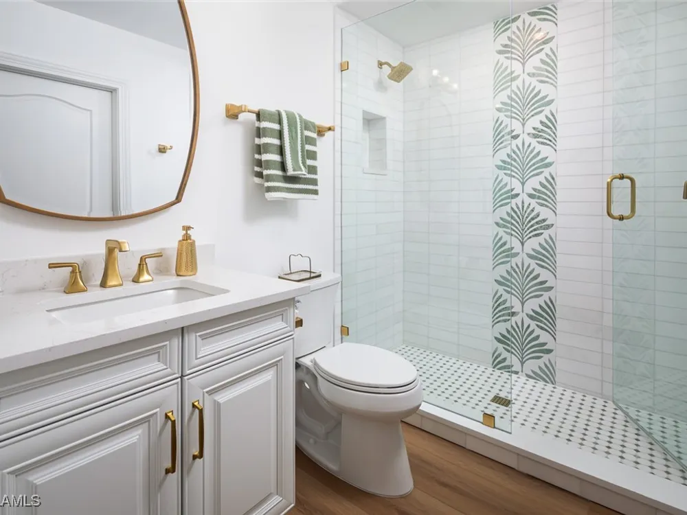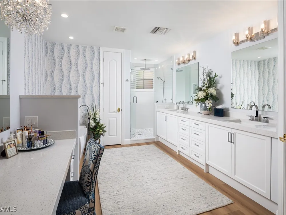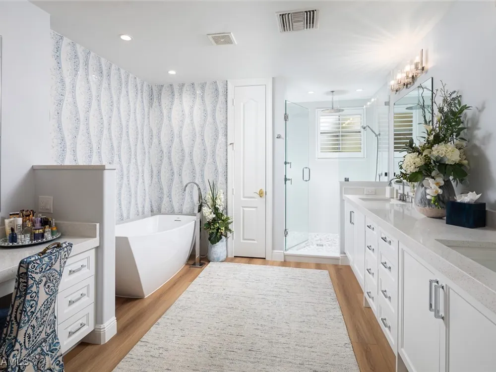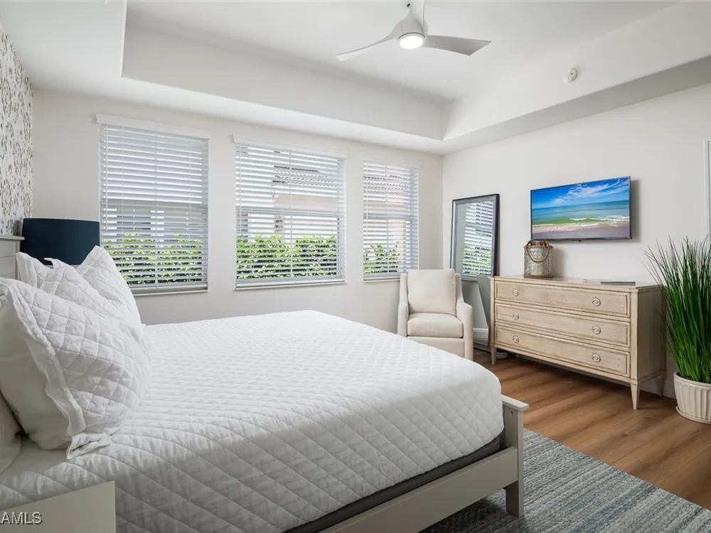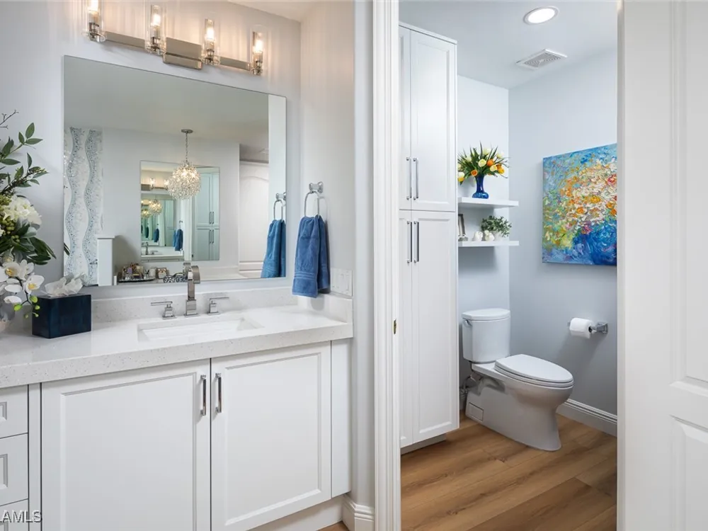 Spacious refurbished 1st floor condo in Avellino Isles inside the manned gates of the beautiful Vineyards Golf & Country Club. This beautifully renovated home offers breathtaking water views and high-end features throughout the redesigned floor plan. Three large bedrooms each with updated ensuite baths and walk-in closets plus a half bath for guests off the main hallway. Gorgeous kitchen updates include all new Thermador appliances, quartz countertops and backsplash, Kohler cast iron farmers sink w/ Rohl fixture and enlarged pantry. Primary bath features a double vanity, dedicated make-up counter, large soaking tub, walk-in shower with Newport News chrome fixtures, all accented with an Italian polished stone wall and two linen closets. Primary bedroom offers a large walk-in closet designed by California Closets. Office has two work areas with ample file cabinets and a queen size Murphy bed for the occasional extra guest. Additionally, new luxury vinyl flooring throughout, plus every room has all new light fixtures, fans, and Hunter Douglas Blinds. Avellino Isles offers an updated clubhouse with a fitness center, card room, infinity pool, spa, and large grilling area. New roofs were installed in 2024-2025, all buildings have been freshly painted and new exterior light fixtures installed in 2025. This is a rare opportunity to enjoy the best of luxury living in the Vineyards' convenient location. Memberships are available but not required, offering flexibility to suit your lifestyle. At time of listing the Vineyards has immediate golf membership available.