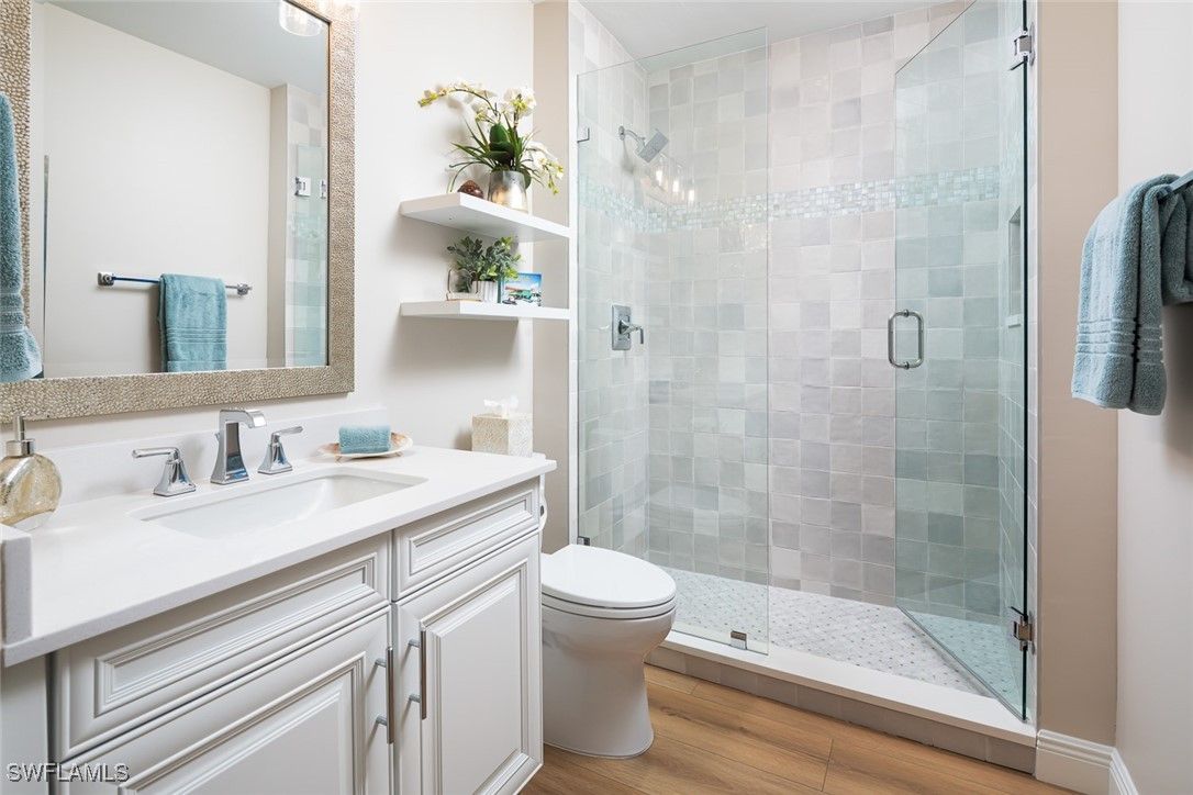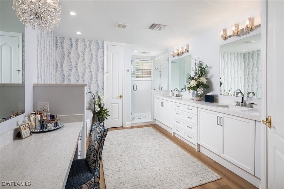 Spacious refurbished 1st floor condo in Avellino Isles inside the manned gates of the beautiful Vineyards Golf & Country Club. This beautifully renovated home offers breathtaking water views and high-end features throughout the redesigned floor plan. Three large bedrooms each with updated ensuite baths and walk-in closets plus a half bath for guests off the main hallway. Gorgeous kitchen updates include all new Thermador appliances, quartz countertops and backsplash, Kohler cast iron farmers sink w/ Rohl fixture and enlarged pantry. Primary bath features a double vanity, dedicated make-up counter, large soaking tub, walk-in shower with Newport News chrome fixtures, all accented with an Italian polished stone wall and two linen closets. Primary bedroom offers a large walk-in closet designed by California Closets. Office has two work areas with ample file cabinets and a queen size Murphy bed for the occasional extra guest. Additionally, new luxury vinyl flooring throughout, plus every room has all new light fixtures, fans, and Hunter Douglas Blinds. Avellino Isles offers an updated clubhouse with a fitness center, card room, infinity pool, spa, and large grilling area. New roofs were installed in 2024-2025, all buildings have been freshly painted and new exterior light fixtures installed in 2025. This is a rare opportunity to enjoy the best of luxury living in the Vineyards' convenient location. Memberships are available but not required, offering flexibility to suit your lifestyle. At time of listing the Vineyards has immediate golf membership available.