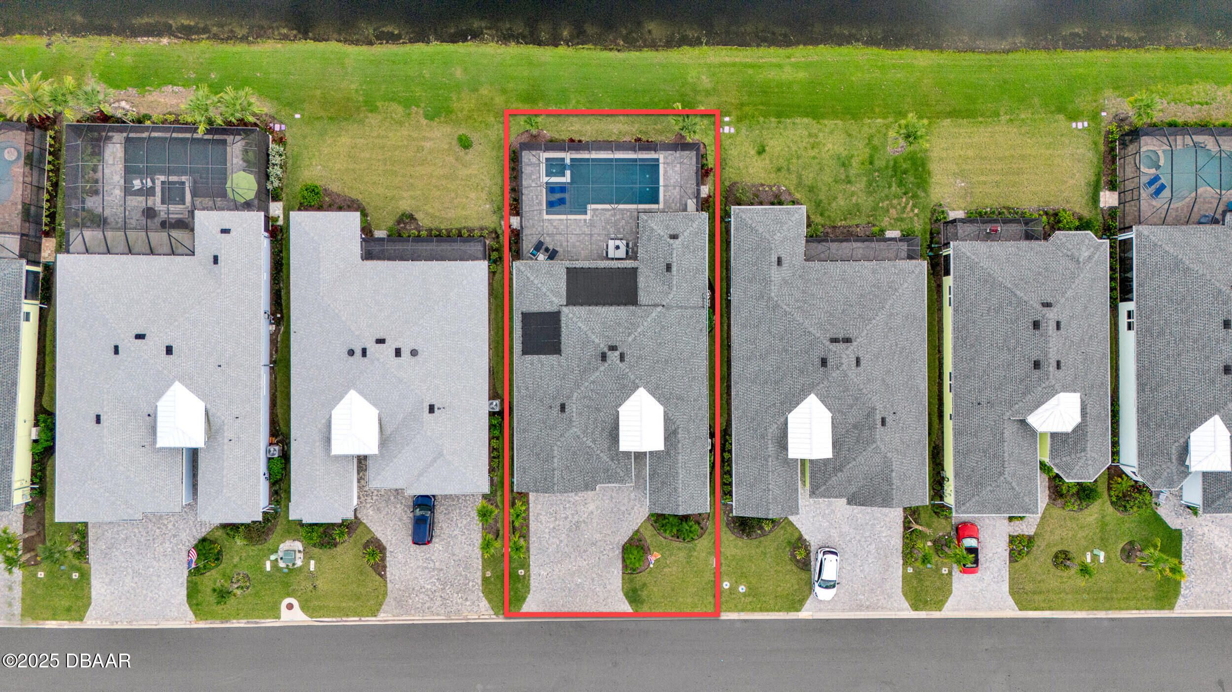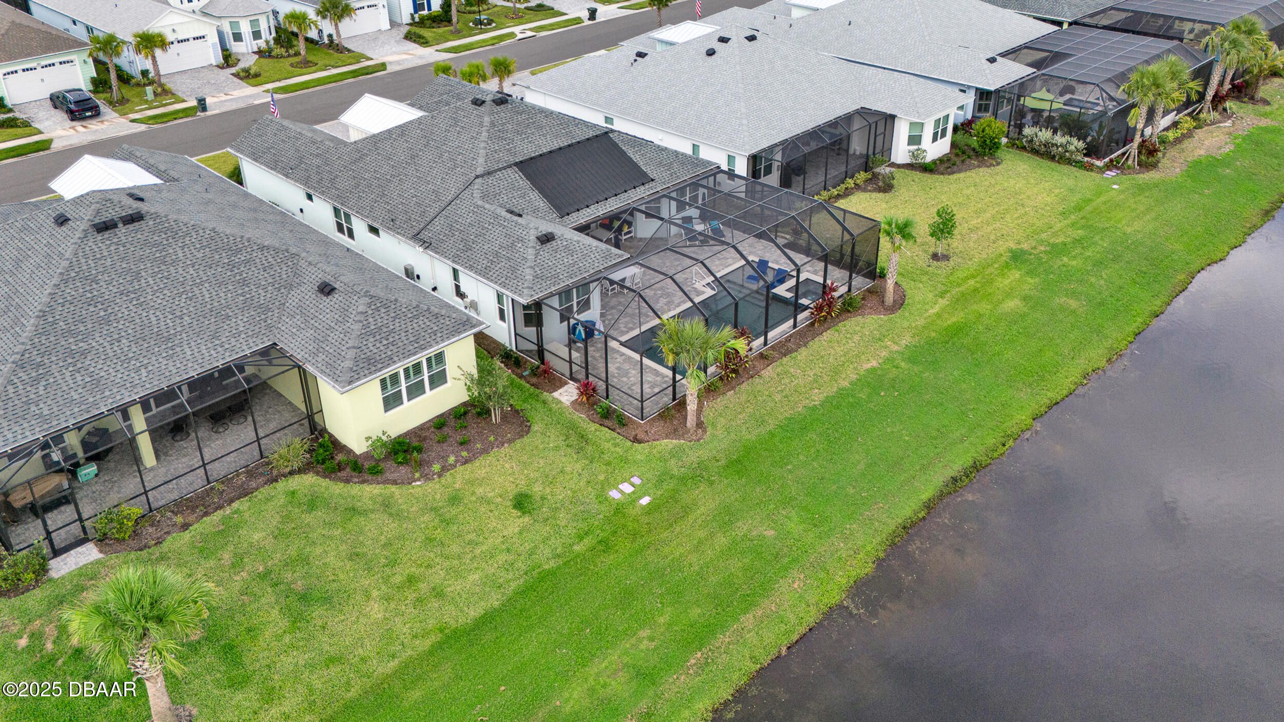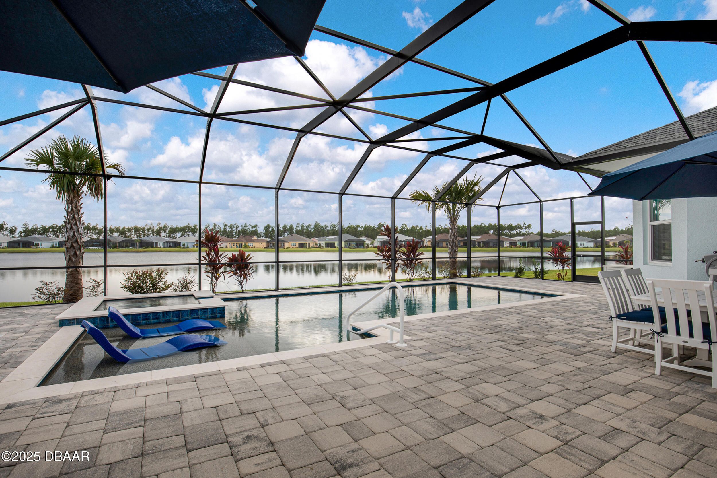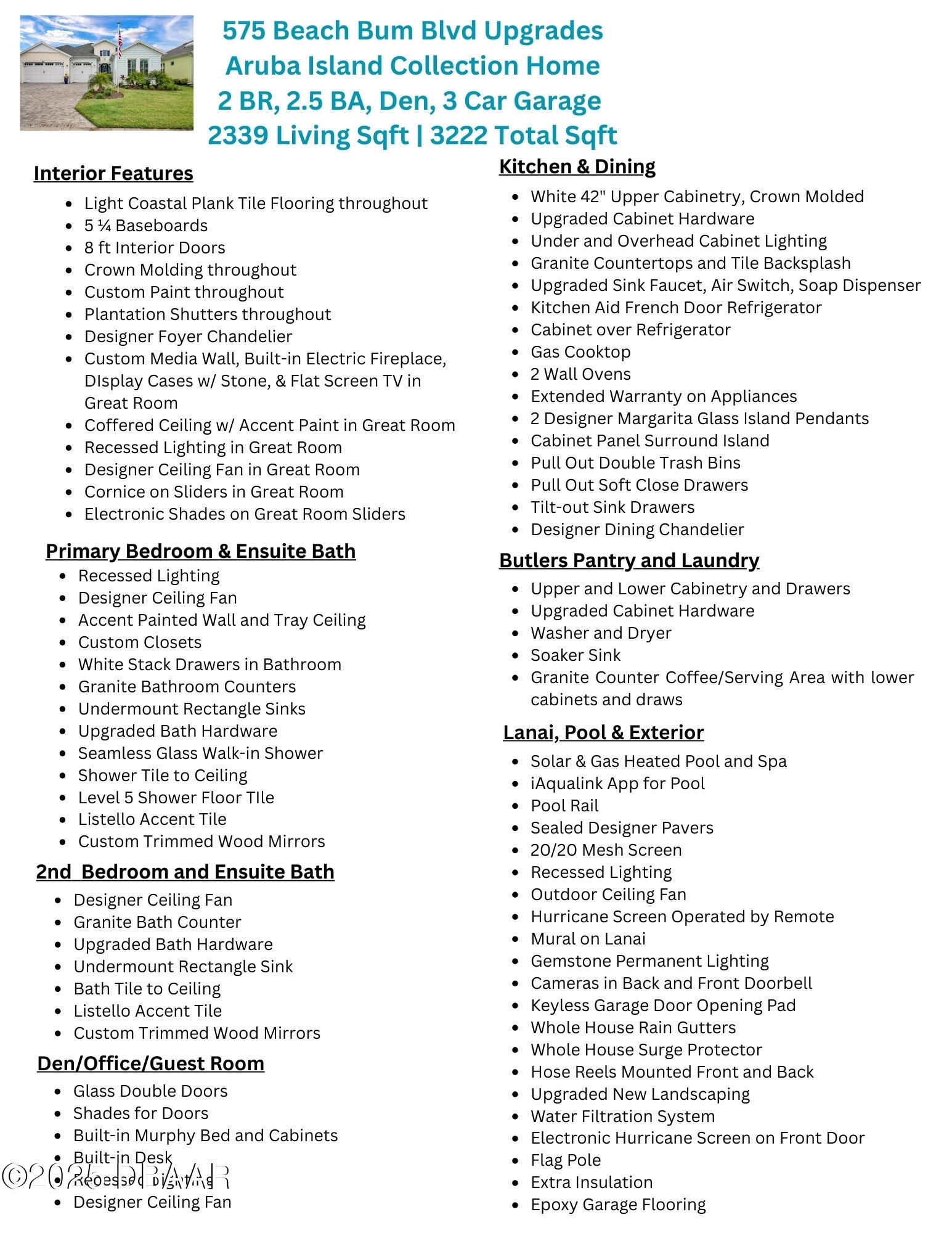 Perfection at its finest with this upgraded Aruba as the home wraps you in coastal elegance. SPECTACULAR POND VIEW. Lounge by the sparkling pool w/ sun shelf & spa, warmed by solar & gas heat & framed by lush palms with premium paver deck. Inside, tropical hues, plank tile floors, plantation shutters & soaring 8' doors create a breezy, elevated vibe. The Great Room invites connection w/ its coffered ceiling, accent paint custom media wall w/ stone fireplace. Cook, gather & celebrate in a kitchen designed for joy. Granite counters, gas cooktop, double ovens, & whimsical Margarita glass pendants adorn the island. Butler's pantry. Upgraded fixtures throughout. Perfect den/office/guest room includes glass french doors, Murphy bed & built in desk. Retreat to a serene primary suite with tray ceiling, accent wall, built-in closets & spa like ensuite bath. 3-car garage w/ epoxy flooring. HURRICANE SHADES FOR LANAI & FRONT DOOR. Luxury meets laid-back living in Vibrant Latitude Margaritaville
