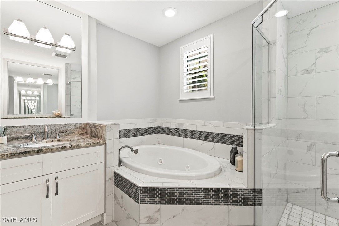 - Bathtub, Dual Sinks, Entrance Foyer, Eat-in Kitchen, Jetted Tub, Kitchen Island, Pantry, Separate Shower, Cable TV, Window Treatments, Split Bedrooms
