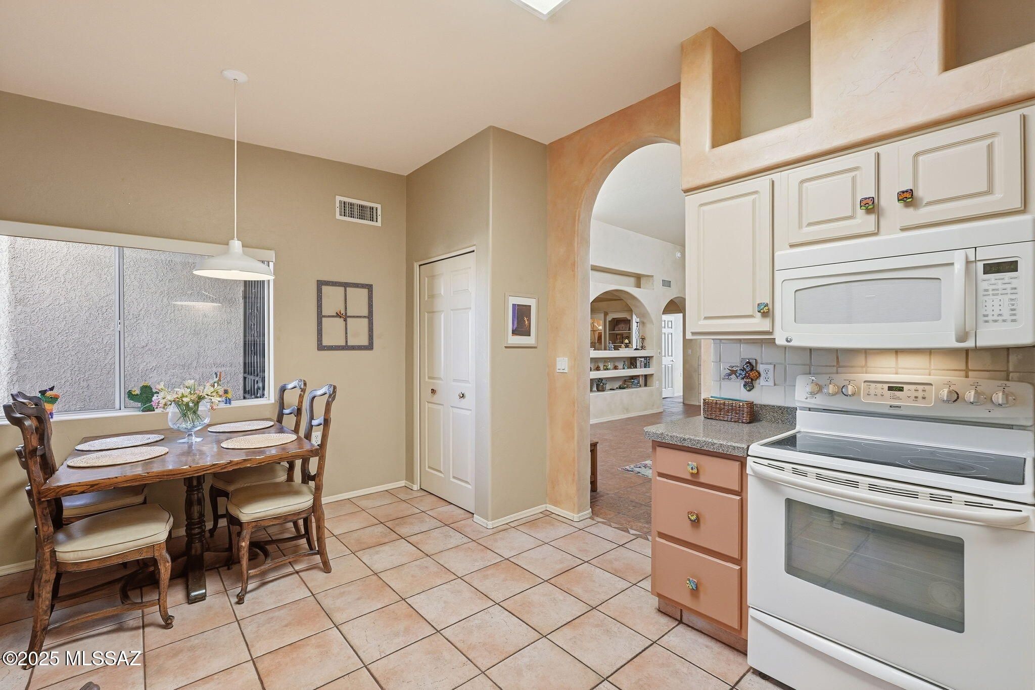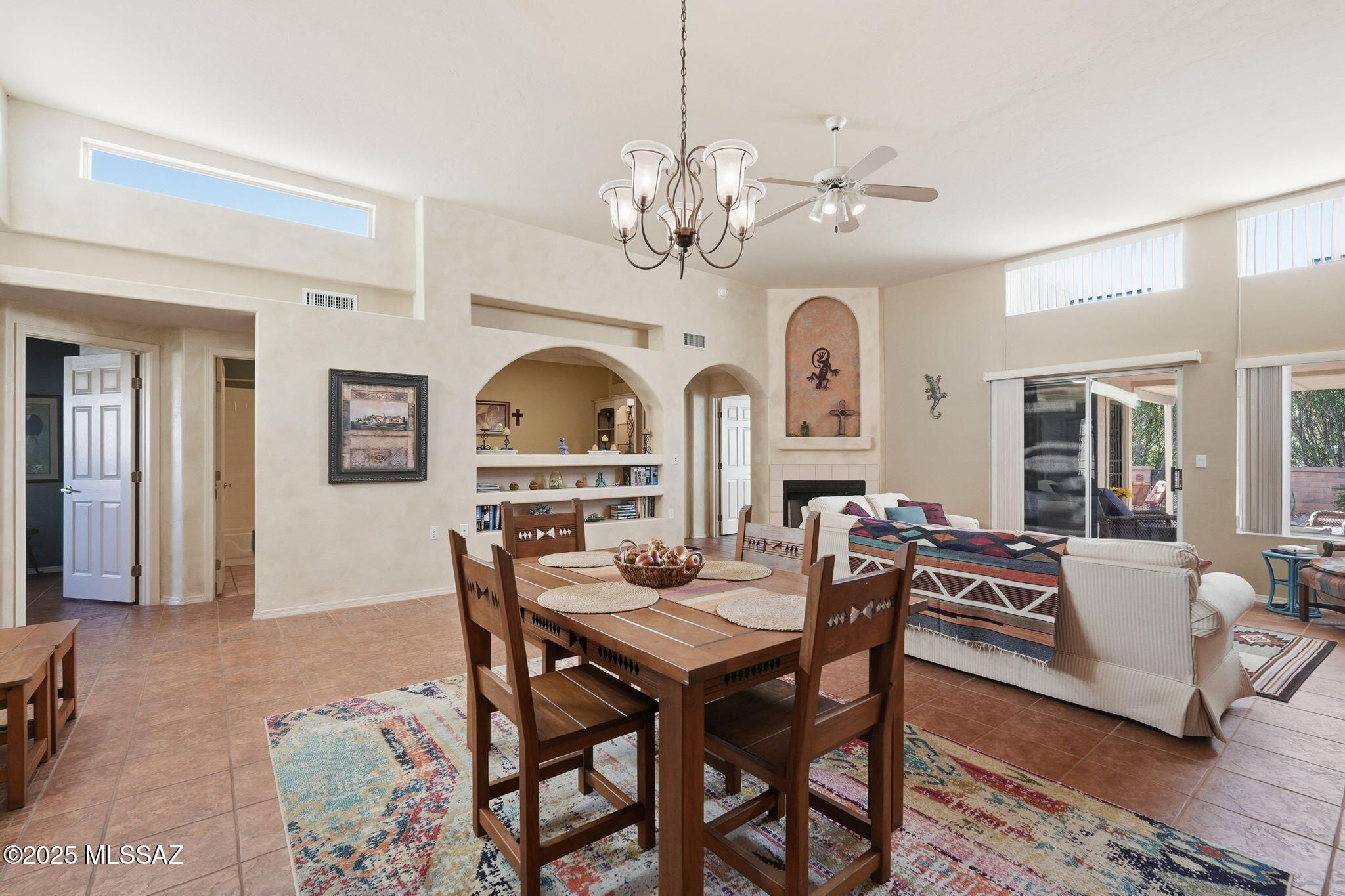 Welcome to 575 W Via Rosaldo -- a beautifully upgraded, turn-key, fully furnished 1,462 sq ft townhome in the desirable Colonia De Los Alamos - Springpointe community with Green Valley Recreation. Whether you're looking for a winter retreat, full-time residence, or a rental-ready lock-and-leave, this home offers effortless Arizona living.Clerestory windows brighten the great room and dining area with soft natural daylight, creating a warm and uplifting atmosphere throughout the day. The open living space centers around a classic fireplace, perfect for relaxed mornings and cozy evenings. The kitchen features granite counters and freshly painted cabinetry, combining modern function with timeless style.