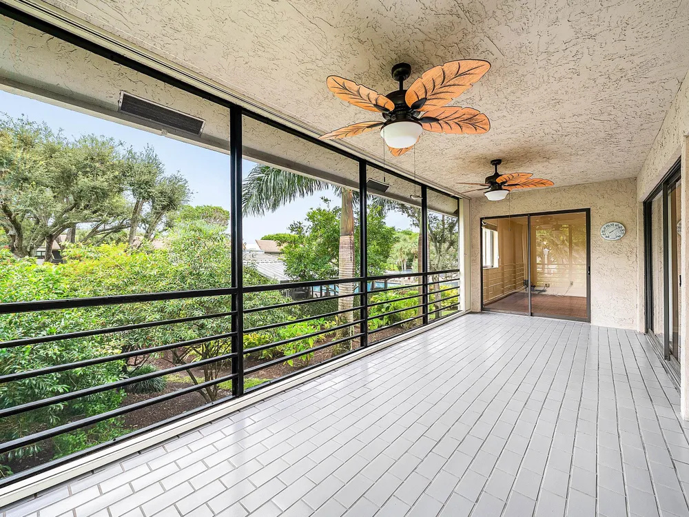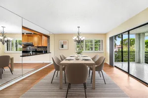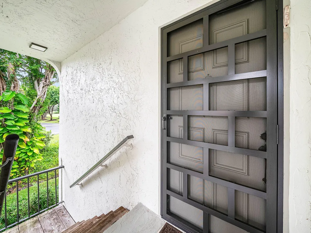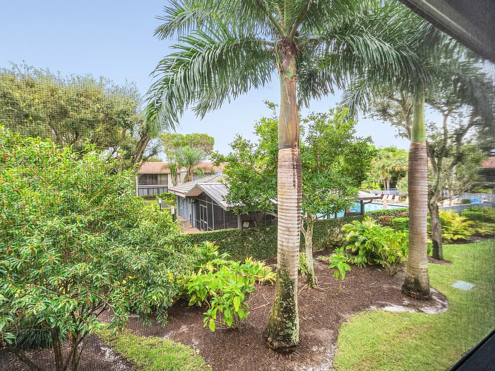 Immaculate, beautifully maintained 3-bedroom residence with numerous thoughtful upgrades. Enjoy custom closets, elegant plantation shutters, and wood flooring in two bedrooms plus the spacious living and dining rooms. The kitchen offers solid wood cabinetry, stainless steel appliances, and generous counter space for easy meal prep. A large screened lanai overlooks lush, manicured landscaping--an inviting place to relax or entertain. Hurricane accordion shutters secure every window and lanai opening for year-round peace of mind. A sparkling, recently renovated community pool sits behind the building for unmatched convenience. Thoughtfully designed for comfort and function, the home enjoys natural light, a setting & a low-maintenance lifestyle. Move-in ready, spotless, easy to show!
