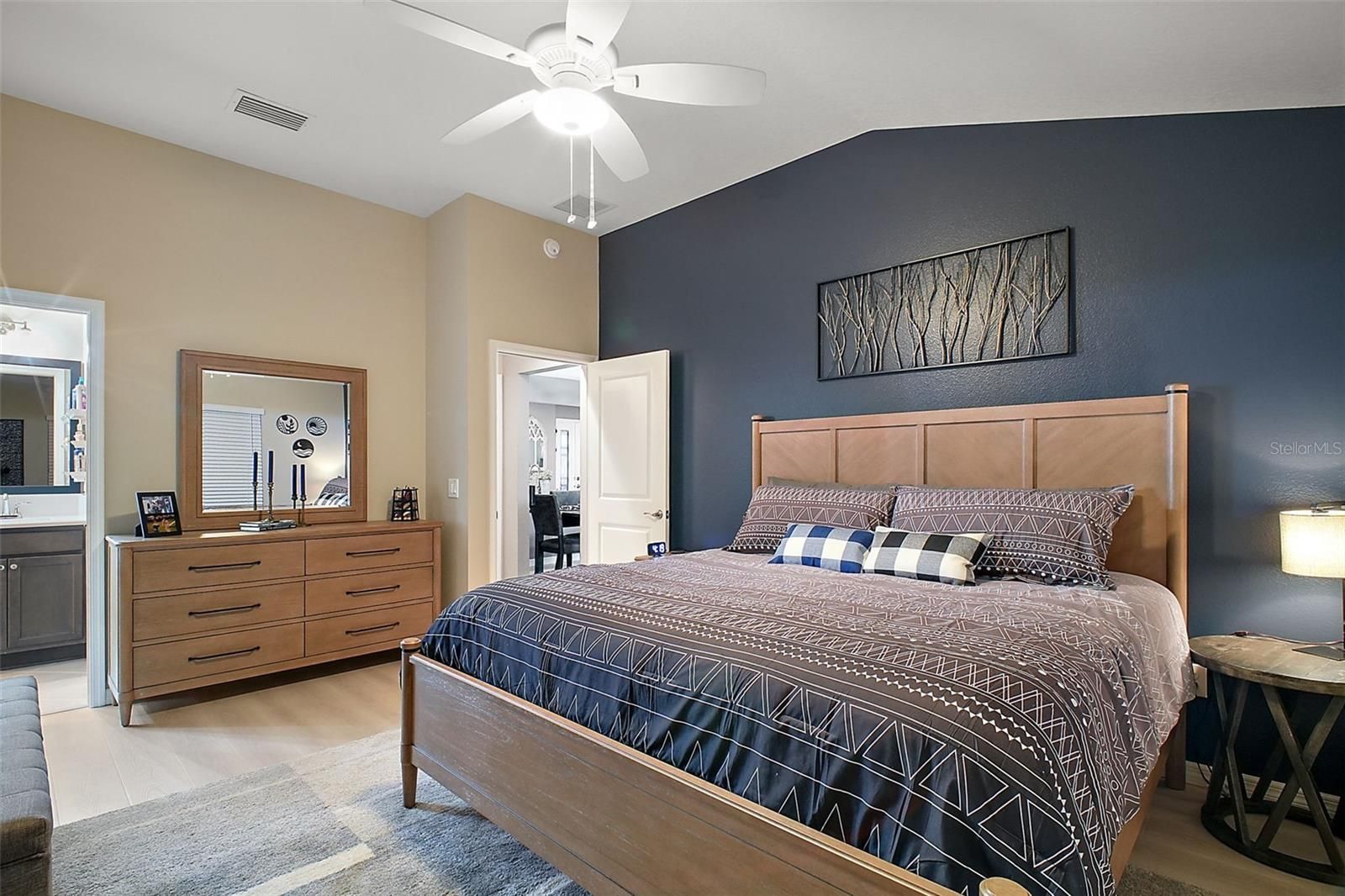 - Ceiling Fan(s), High Ceilings, Living/Dining Room, Open Floorplan, Main Level Primary, Solid Surface Counters, Stone Counters, Thermostat, Vaulted Ceiling(s)