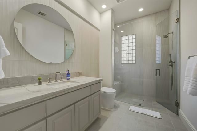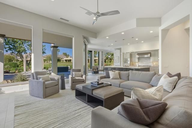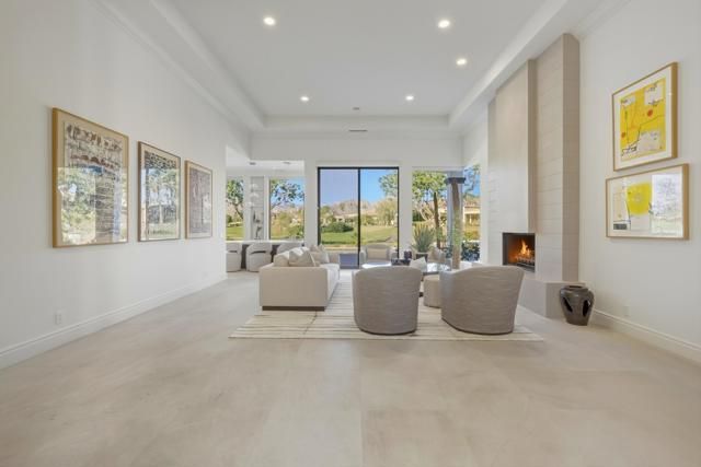 Welcome to a newly reimagined residence in the prestigious PGA West Summit Estates, perfectly positioned to capture Iconic Amen Corner views--the legendary vantage point overlooking the triple fairway, shimmering lake, and dramatic southwestern mountain backdrop. This semi-custom estate has undergone an extensive, top-to-bottom luxury renovation, elevating every space with refined materials, designer finishes, and a fresh contemporary aesthetic.From the moment you step into the private gated courtyard, the home reveals an atmosphere of modern serenity. Inside, soaring ceilings, expansive walls of glass, and elegant architectural lines frame panoramic fairway and mountain vistas, creating a seamless connection between the interior and the stunning outdoor setting.The full interior remodel showcases a sophisticated palette and exceptional craftsmanship throughout. Upgrades include all-new interior paint, beautifully updated flooring, new bathroom designs with premium plumbing fixtures, sinks, toilets, lighting, illuminated mirrors, custom glass shower enclosures, and a luxurious freestanding soaking tub in the spa-inspired primary bath. The kitchen and bar areas shine with Taj Mahal slab countertops, new refrigeration systems (kitchen fridge, wine cooler, and bar fridge), a new microwave, and a completely redesigned island with striking modern lines.Both the family room and primary suite now feature custom-built entertainment centers, complementing the home's sleek new lighting, recessed LED can fixtures, and contemporary ceiling fans. Additional enhancements include new carpet in all bedrooms, updated window shades throughout (both motorized and manual), and thoughtfully upgraded Moen water-leak detection for peace of mind.The living room centers around a magnificent Creme de Provence limestone fireplace surround, a sculptural focal point that elevates the entire space. A newly redesigned bar adds sophistication and convenience for entertaining, while new AV systems, professional Ring cameras, and a fully monitored security system provide modern functionality and security.Outdoors, the transformation continues with new pool and fountain equipment and beautifully refreshed exterior landscaping featuring new plantings and rock accents.