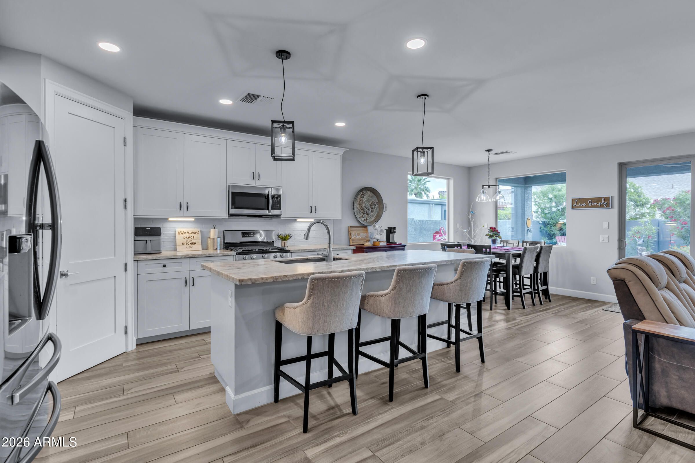Welcome home to this immaculate, beautifully updated 3-bed / 2-bath single-level residence in the highly desirable 55+ community of Apache Wells. Completely move-in ready with high-end finishes throughout, this is a rare opportunity to secure a turnkey home in one of East Mesa's most amenity-rich active adult communities. The eat-in kitchen is a true centerpiece, featuring marble countertops, upgraded wood cabinetry, tile backsplash, stainless steel appliances, a breakfast bar, and a walk-in pantry. It flows seamlessly into the main living area, creating a functional and inviting space, while a formal dining area provides additional room to host. Sliding glass doors lead directly to the covered patio, extending your living space outdoors. The spacious primary suite is filled with natural light and offers a large walk-in closet and a beautifully appointed ensuite bath with dual vanities and a stunning floor-to-ceiling stone walk-in shower with dual showerheads, including a rainfall feature. Two additional bedrooms are generously sized and feature ample closet space, making them ideal for guests, a home office, or a hobby space. Step outside to your private backyard retreat, complete with a fully enclosed covered patio, low-maintenance artificial turf, and your own putting green. This peaceful outdoor setting is ideal for relaxing mornings, evening gatherings, or entertaining in a quiet, serene environment. Additional highlights include a new AC (2024), an extended 20 x 32 two-car garage with extra storage potential, exterior motorized power blinds on all windows, a tankless hot water heater, and a dedicated laundry room with sink, cabinetry, and ample counter space. Residents of Apache Wells enjoy an exceptional lifestyle with access to an 18-hole golf course, a full-service clubhouse, a heated pool and spa, pickleball and bocce shuffleboards, a billiards room, ping pong, a fitness center, woodworking and hobby shops, and a wide variety of organized clubs, social events, and activities. The community also offers convenient on-site dining, nearby shopping and medical facilities, and quick access to major freeways, making it easy to enjoy everything East Mesa and the greater Phoenix area have to offer.