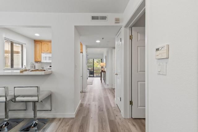 Convenient Los Gatos location! This first-floor end unit is light and bright with extra windows that bring in plenty of natural light. Featuring new flooring and fresh paint throughout, this two-bedroom, one-bathroom home is move-in ready. The functional dining area includes a breakfast bar that opens to the living space, creating a comfortable layout for everyday living. Enjoy the large private deck with views of the pool and beautiful redwood trees, offering a peaceful space to relax or entertain. Additional features include dual-pane windows, central forced-air heating and air conditioning, and an in-unit washer and dryer. The gated parking garage includes an assigned parking space conveniently located just below the unit. Community amenities include a pool and spa located just steps from the home, along with a BBQ area, community room with kitchen, fitness center, and an extra storage closet in the garage. Ideally located near dining and shopping in both Downtown Los Gatos and Downtown Campbell, with easy freeway access, nearby parks, and the scenic Los Gatos Creek Trail. This is a 55+ gated community where at least one occupant must be 55 or older, though buyers may be younger, an excellent opportunity to enjoy the best of Los Gatos living at exceptional value.
