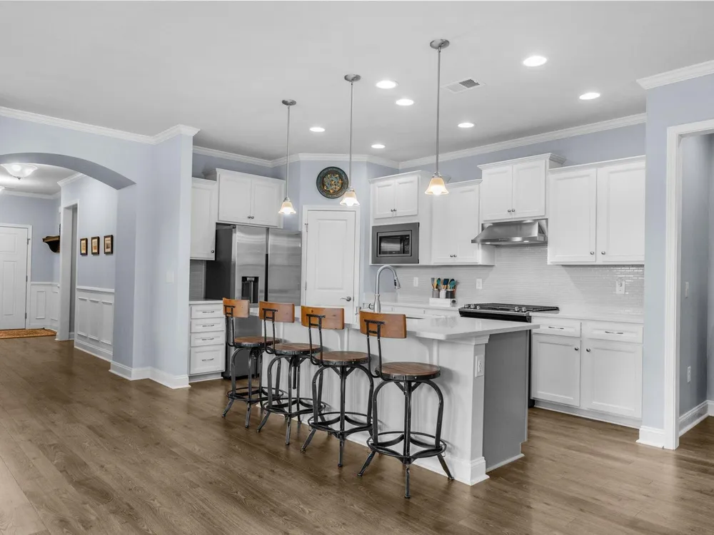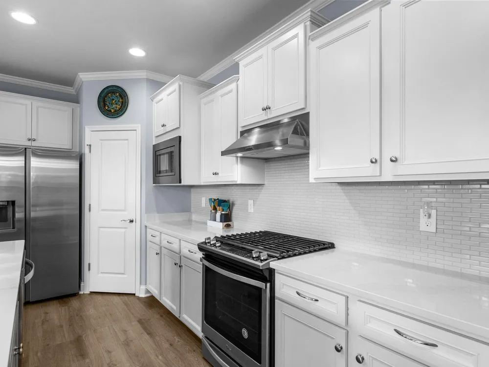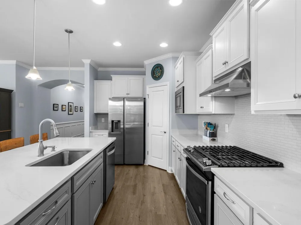 - Kitchen Island, Stainless Steel Appliances, Solid Surface Counters