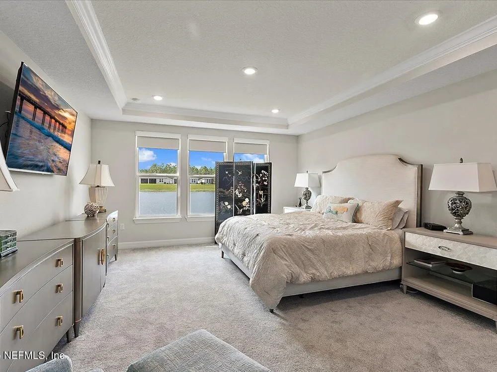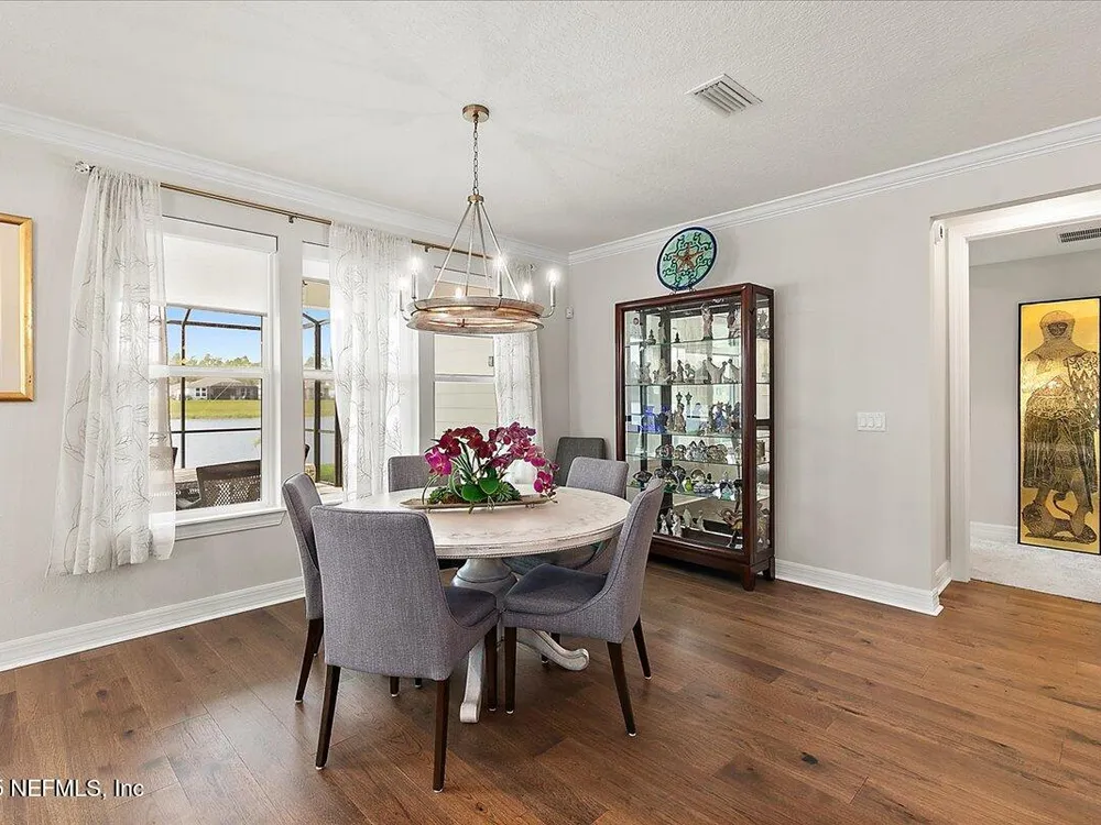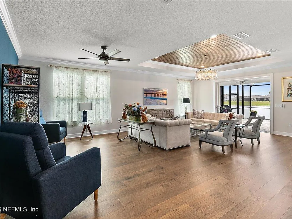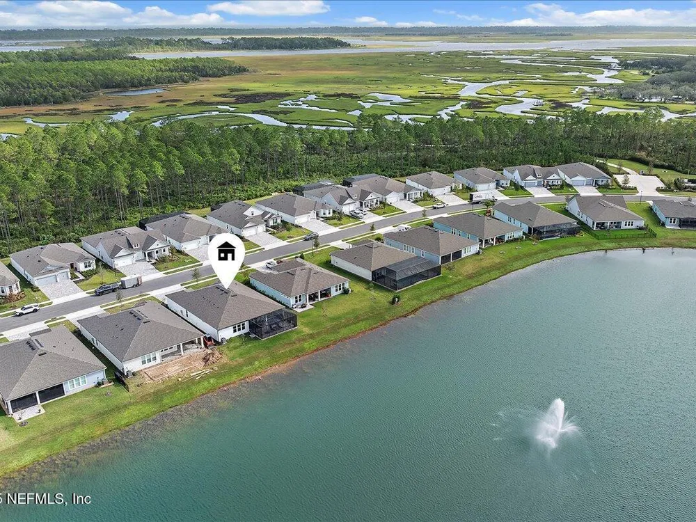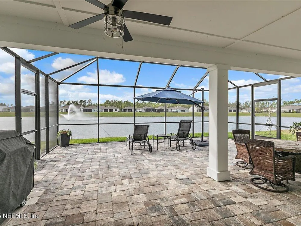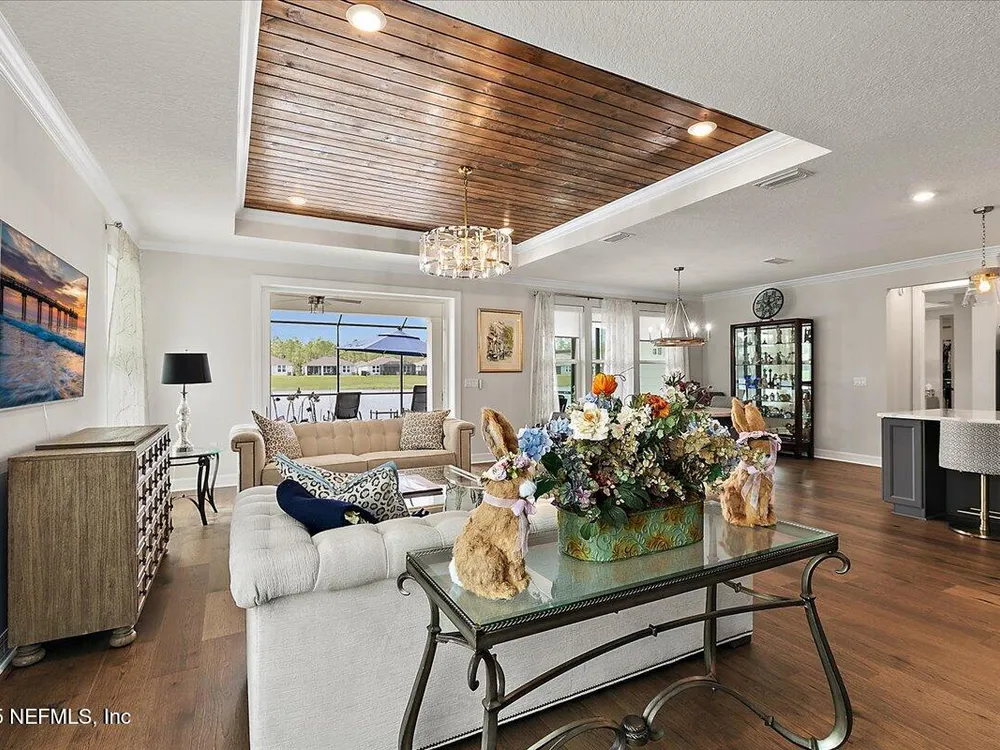 Rare opportunity to own a renown estate home on a breathtaking WATER lot! Built with over $250,000 in upgrades on a premier homesite valued at more than $250,000, this stunning residence blends timeless elegance with modern design. The open floor plan is anchored by an extended gathering room with pocket sliding doors that seamlessly connect indoor living to the screened lanai and expansive patio overlooking the tranquil water. Designer hardwood floors & top-of-the-line tile flow throughout, complementing the chef's kitchen w/ highest-level 42'' cabinetry, gourmet appliances including convection oven, beverage refrigerator & a large island perfect for entertaining. Sophisticated details abound—tray ceilings, crown molding, upgraded baseboards, motorized shades, a designer front door & show-stopping lighting. Upgrades include central vac, attic with pull-down stairs, a 4' extended garage & more. This meticulously designed home offers luxury, comfort & unmatched water view. A must see. Del Webb Nocatee, the newest 55+ community where luxury living meets unparalleled amenities including: resort pools, spa tub, pickle ball (over 300 members), tennis, bocce, billiards, a full service restaurant and bar, ballroom, fitness center, community garden, kayak launch to the intracoastal etc. If that is not enough, you can enjoy all that the community of Nocatee has to offer just a few miles away on golf cart paths, including waterparks, concerts, food trucks, restaurants and shopping.
