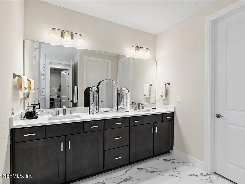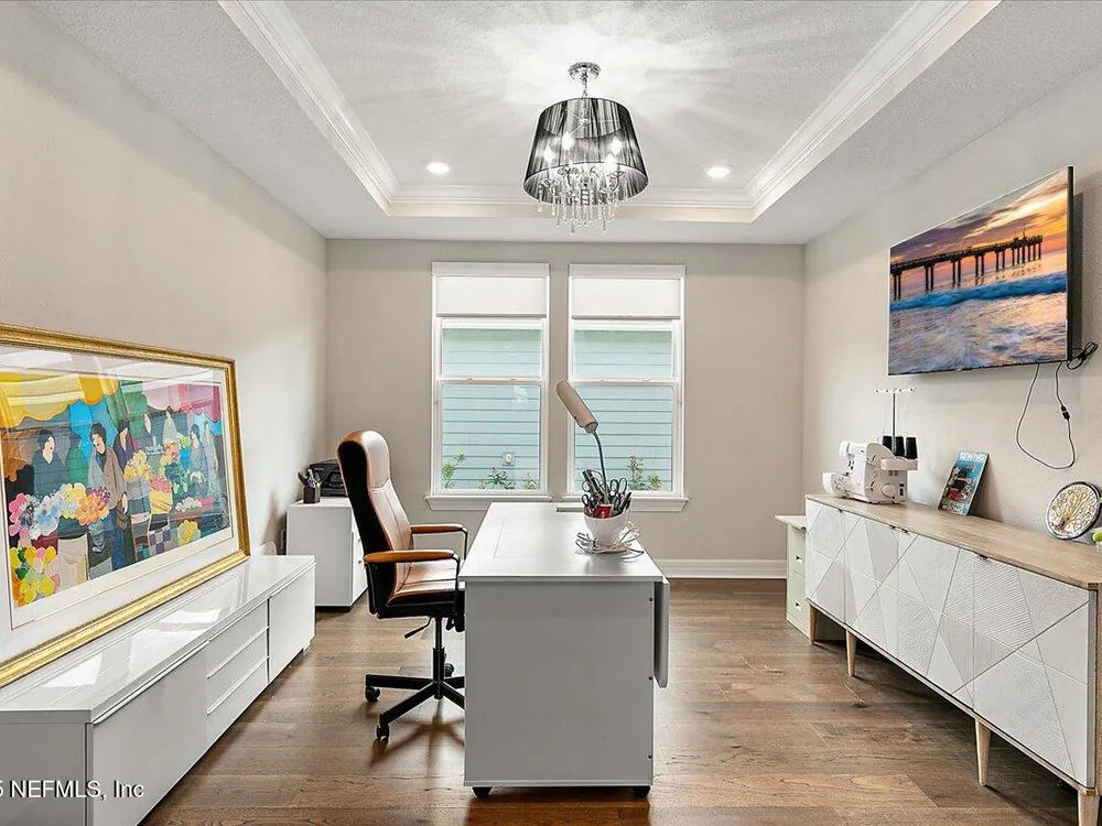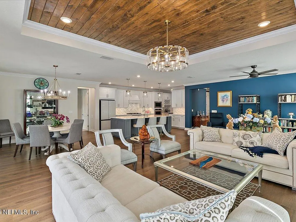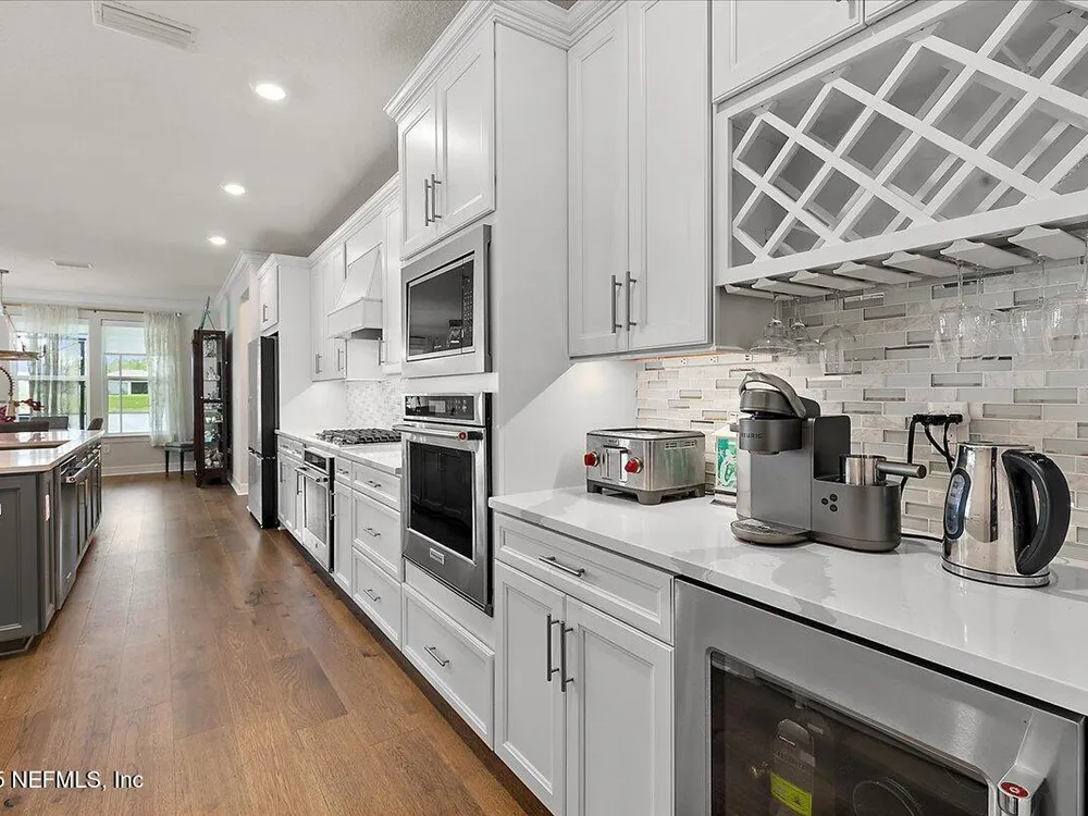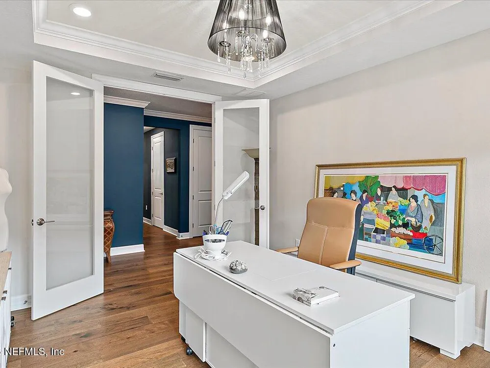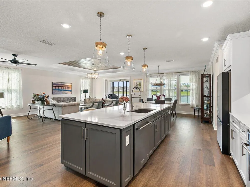Rare opportunity to own a renown estate home on a breathtaking WATER lot! Built with over $250,000 in upgrades on a premier homesite valued at more than $250,000, this stunning residence blends timeless elegance with modern design. The open floor plan is anchored by an extended gathering room with pocket sliding doors that seamlessly connect indoor living to the screened lanai and expansive patio overlooking the tranquil water. Designer hardwood floors & top-of-the-line tile flow throughout, complementing the chef's kitchen w/ highest-level 42'' cabinetry, gourmet appliances including convection oven, beverage refrigerator & a large island perfect for entertaining. Sophisticated details abound—tray ceilings, crown molding, upgraded baseboards, motorized shades, a designer front door & show-stopping lighting. Upgrades include central vac, attic with pull-down stairs, a 4' extended garage & more. This meticulously designed home offers luxury, comfort & unmatched water view. A must see. Del Webb Nocatee, the newest 55+ community where luxury living meets unparalleled amenities including: resort pools, spa tub, pickle ball (over 300 members), tennis, bocce, billiards, a full service restaurant and bar, ballroom, fitness center, community garden, kayak launch to the intracoastal etc. If that is not enough, you can enjoy all that the community of Nocatee has to offer just a few miles away on golf cart paths, including waterparks, concerts, food trucks, restaurants and shopping.