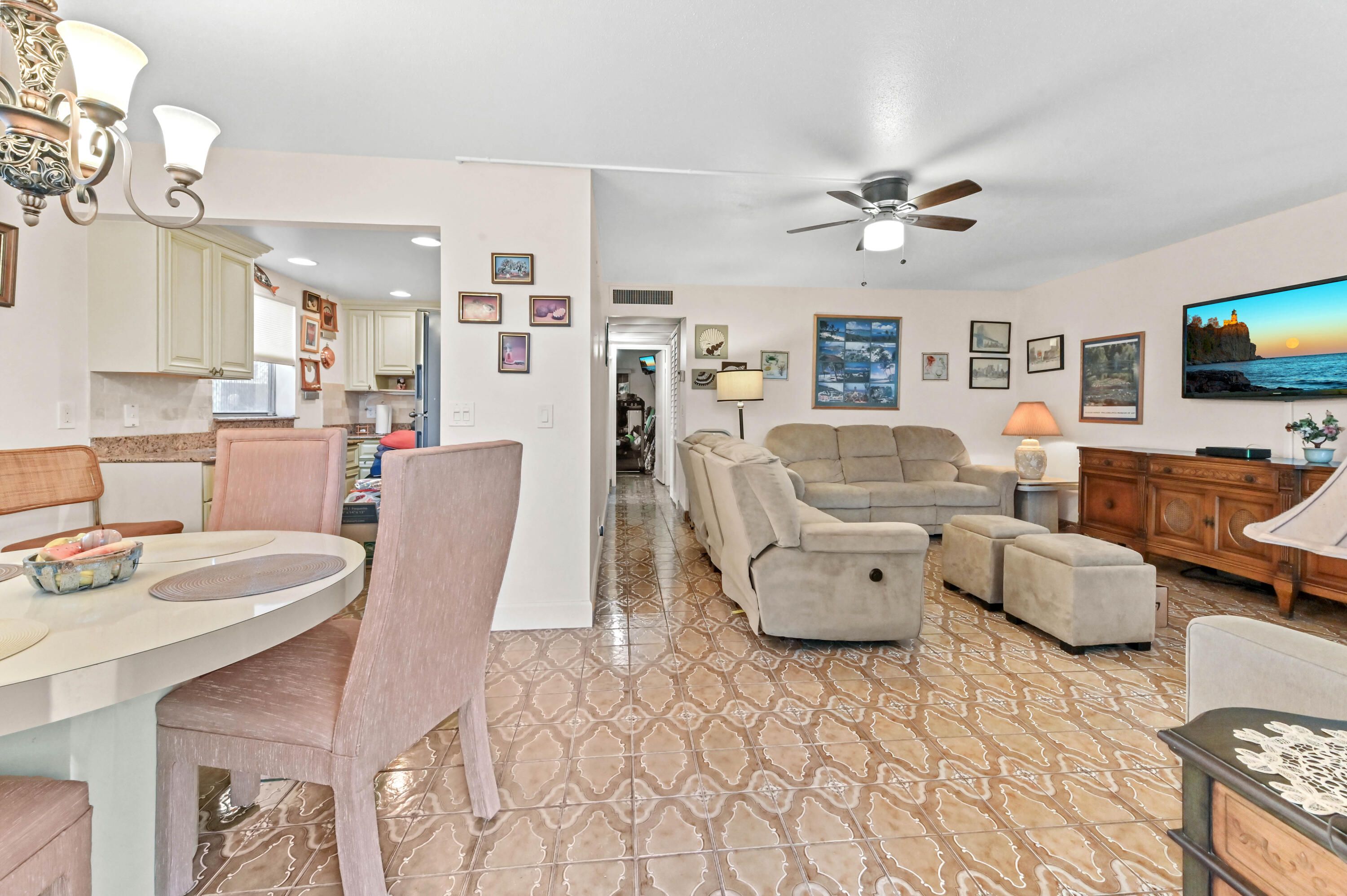 Behold, an extraordinary living experience awaits at 577 Monaco Boulevard, anchored in the renowned Kings Point community of Delray Beach, Florida. This corner unit sparkles with inviting amenities and bright, natural light that pours into every room, welcoming you into a living area that celebrates harmony and relaxation. The updated kitchen invites culinary creativity with its elegant enhancements. Marvel at the splendor of the granite countertops, which fuse aesthetic appeal with functionality. The contemporary cabinetry complements the overall atmosphere, while the premium crown moulding and strategic recessed lighting amplify the elegance of the decor. Adding to the interior's allure is the imported Italian tile flooring that graces the kitchen and extends into the living area, delivering a touch of warmth and opulence. Experience tranquility in the inviting bedroom that is carpeted, offering the comfort of plush flooring underfoot. Additional interior features include an enclosed patio that not only extends the living space but also provides ample storage. The inclusion of a utility closet with washer/dryer extends convenience right into the comfort of your home. As a resident of this unparalleled Kings Point community, you gain access to highly sought-after amenities designed to enhance your lifestyle. Engage your passion for golf at one of two 18-hole courses, expertly crafted by none other than renowned architect Robert Trent Jones, Sr. Additionally, enjoy leisure or invigorating workouts at the available swimming facilities, exercise studio, and tennis courts. Delight your palate at the community's in-house dining venues: The East End Cafe and The Bistro. These eateries provide a satisfying selection for every meal and a cozy ambiance for coffee chats. Finally, the community theatre stands as a beacon of culture, offering a stream of events that cater to entertainment, education, and social engagement. This move-in ready home is a part of a vibrant 55+ community that offers residents more than a place to live, it promises a dynamic, enriching lifestyle. Furthermore, furniture negotiation adds flexibility to your moving arrangements. Become a part of the Kings Point community and embrace the enduring charm of 577 Monaco Boulevard.