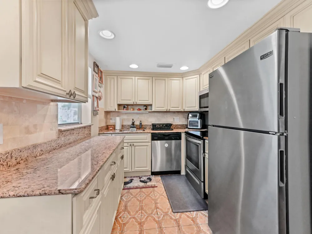 Behold, an extraordinary living experience awaits at 577 Monaco Boulevard, anchored in the renowned Kings Point community of Delray Beach, Florida. This corner unit sparkles with inviting amenities and bright, natural light that pours into every room, welcoming you into a living area that celebrates harmony and relaxation.The updated kitchen invites culinary creativity with its elegant enhancements. Marvel at the splendor of the granite countertops, which fuse aesthetic appeal with functionality. The contemporary cabinetry complements the overall atmosphere, while the premium crown moulding and strategic recessed lighting amplify the elegance of the decor.