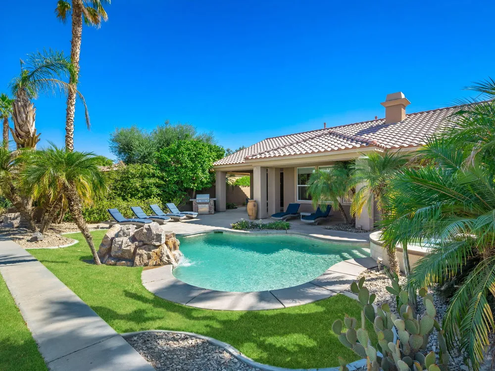 Welcome to the popular Pasadera 1 Floor plan located behind the Legends gate at PGA West! This home offers 3 bedrooms, 3.5 baths including a private casita for your family & friends to enjoy! Great room concept with tile flooring, fireplace for those chilly nights, wet bar for entertaining all overlooking kitchen & dining area. The kitchen offers granite slab countertops, ample warm wood tone cabinetry, island for additional seating, & pantry! Primary suite has direct access to the pool & spa as well as a soaking tub, walk in shower, double vanities and walk in closet with built in storage. Step into the backyard that overlooks the Western mountains and double fairway of the 8th & 9th of Weiskopf Private Course! Enjoy the pool with flowing waterfall or soak in the raised spa that flows into the pool! There is a built in BBQ and plenty of patio area for gatherings or to relax and enjoy the sun! There is a 2 car garage plus a golf cart garage. This home is offered furnished per written inventory!