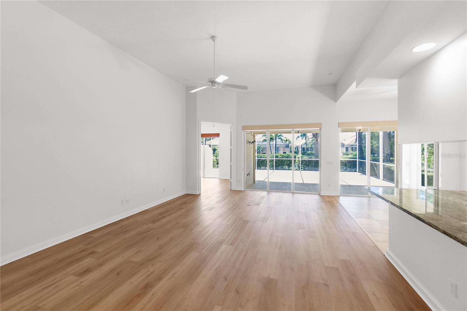 - Built-in Features, Cathedral Ceiling(s), Ceiling Fan(s), Central Vacuum, Eat-in Kitchen, High Ceilings, Kitchen/Family Room Combo, Open Floorplan, Main Level Primary, Solid Surface Counters, Split Bedrooms, Walk-In Closet(s), Window Treatments