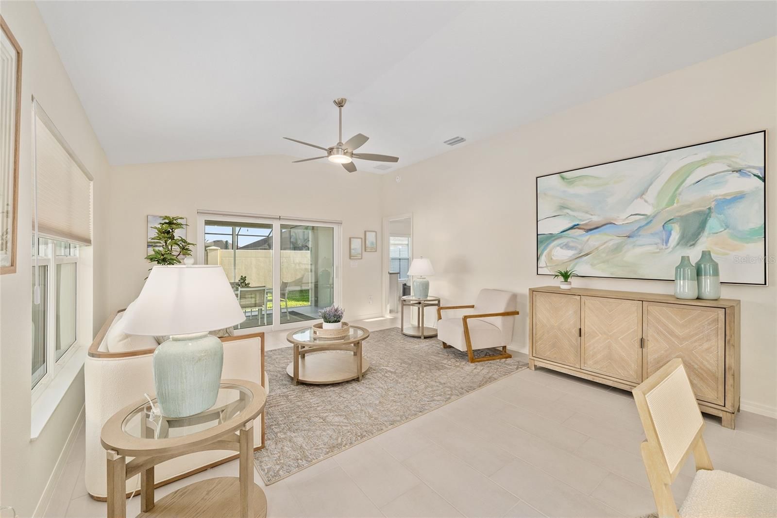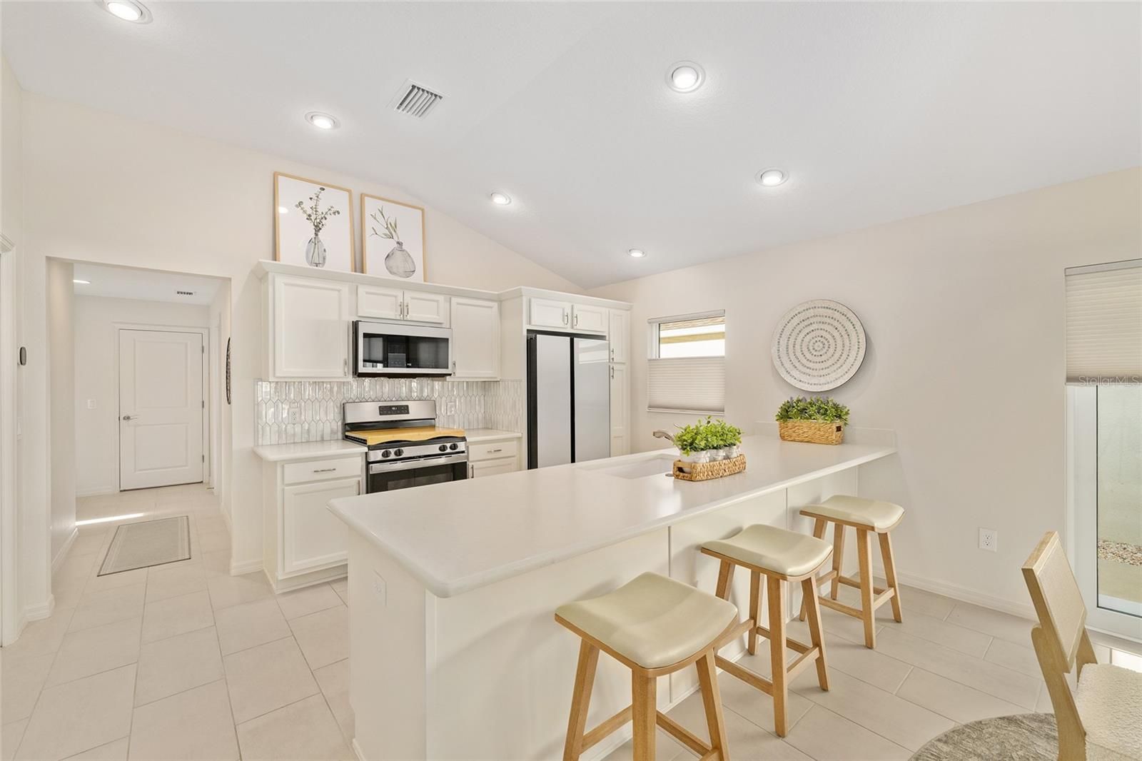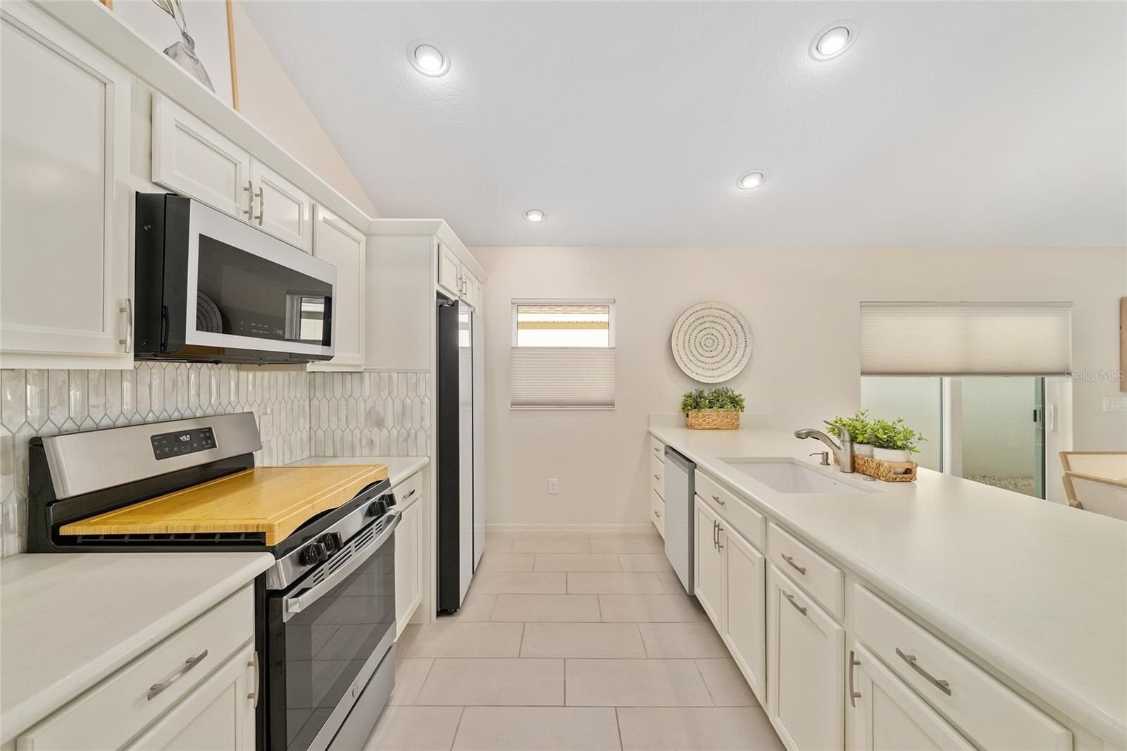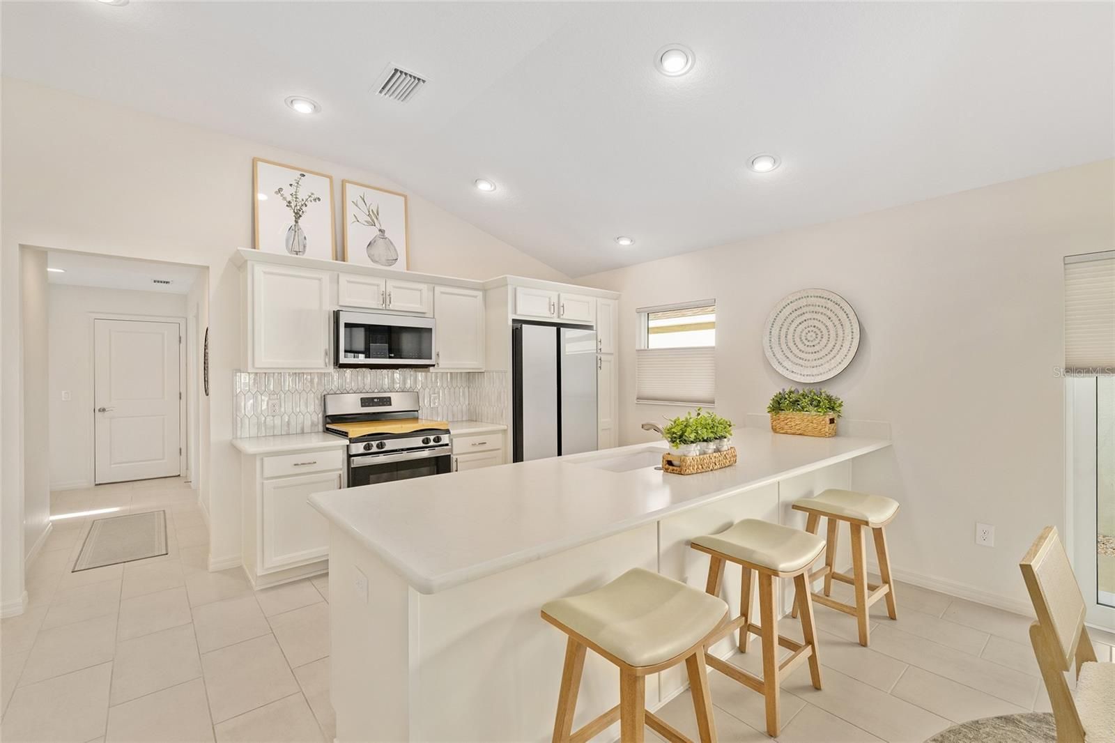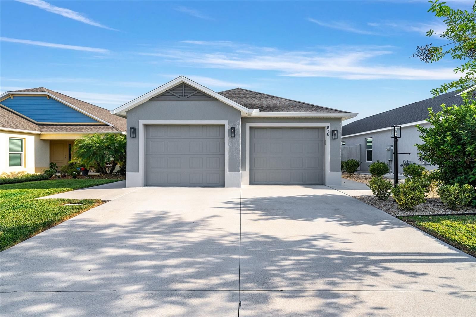 BETTER THAN NEW! This 2021 block-and-stucco 3-bedroom, 2-bath Charlotte Courtyard villa with a TWO-CAR GARAGE featuring separate doors —sold TURNKEY, As you enter you will notice TILE FLOORING throughout—NO CARPET anywhere, VAULTED CEILINGS and UPGRADES GALORE to include gutters, a Pegasus whole-home WATER FILTRATION and SOFTENER SYSTEMS, fresh interior and exterior paint, modern lighting and ceiling fans, and LED quiet garage door openers with battery backups. The kitchen and baths feature matching QUARTZ countertops, a full backsplash, and upgraded cabinetry with PULL-OUT SHELVING and a large pull out spice rack. Top-of-the-line Samsung Bespoke refrigerator, dishwasher, and microwave that match the cabinetry, create a sleek, contemporary look. The Primary bedroom features a TRAY CEILING, and primary bathroom features a large WALK-IN CLOSET, and DOUBLE SINK VANITY. This home also comes with the luxury of an INDOOR LAUNDRY ROOM equipped with WASH TUB. Sunshades upgraded from blinds add a polished touch, enjoy your lanai outback with a privacy wall that offers peaceful outdoor living. This villa pairs modern design with access to The Villages’ newest lifestyle destinations—TURNKEY, UPDATED, AND READY TO ENJOY! you will enjoy many nearby amenities including Eastport Town Square, several new golf courses, and Ezell Recreation Center (˜5 minutes) with putt-putt, organized pickleball, indoor gym, and ping pong. Also close to Southern Oaks Championship Golf Course, Sawgrass Grove with live music nightly, restaurants, and The Villages Produce, Mickey Lee Chip & Jubilee Putt-Putt courses, Homestead Recreation Center with the Boardwalk Nature Trail, and even the Astronomy Observation Pads.