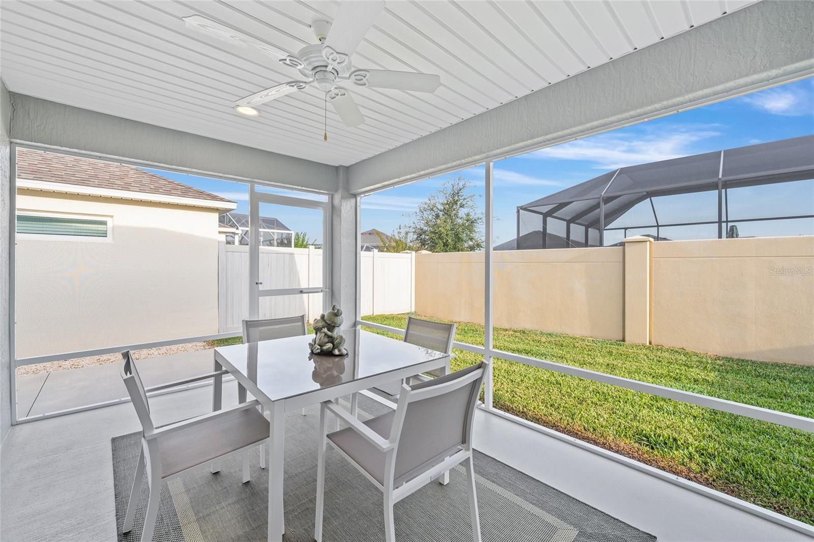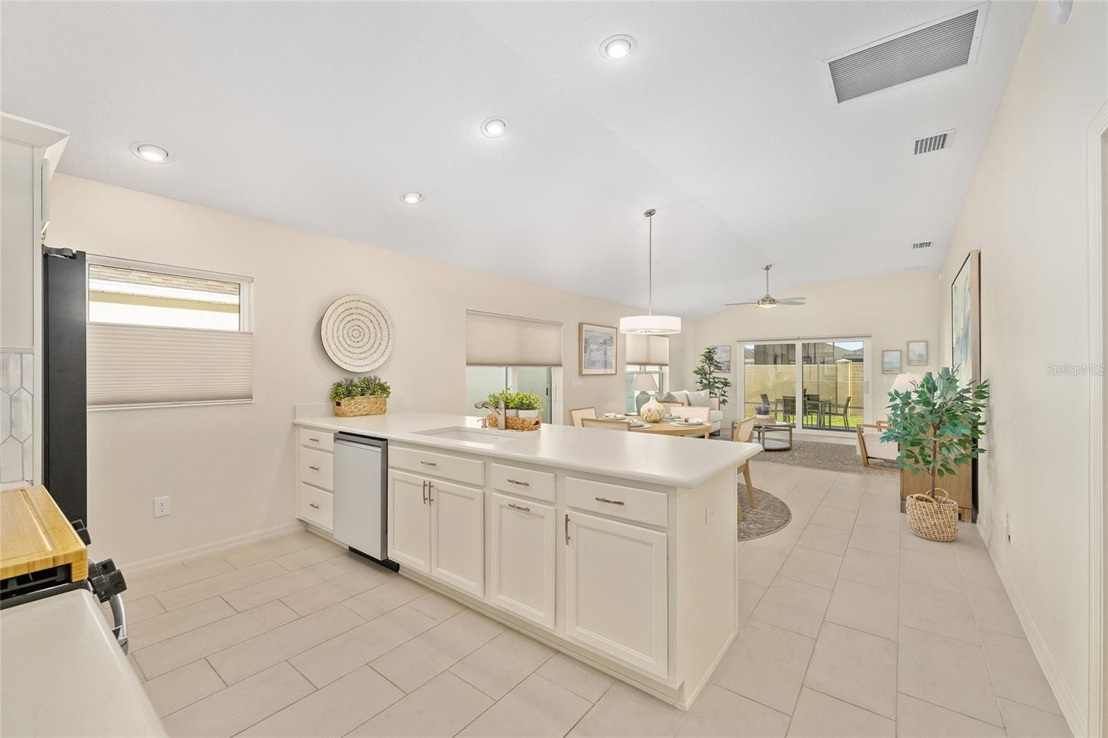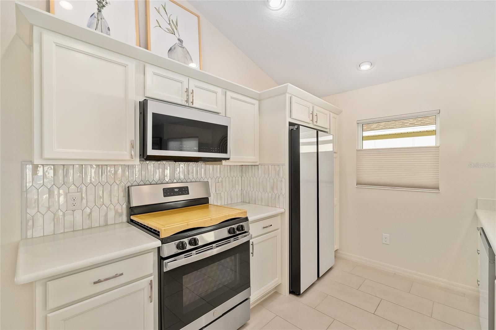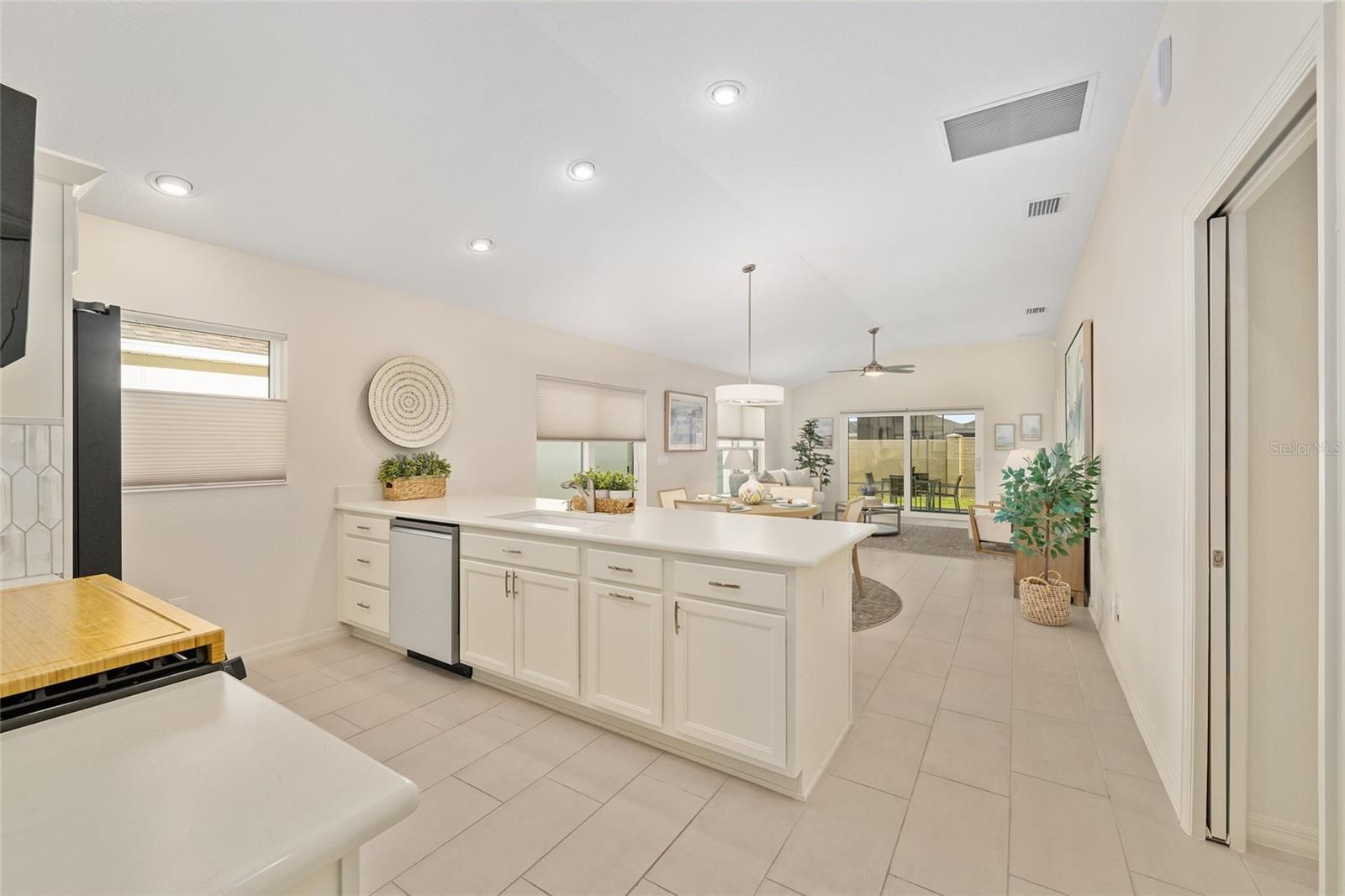 BETTER THAN NEW! This 2021 block-and-stucco 3-bedroom, 2-bath Charlotte Courtyard villa with a TWO-CAR GARAGE featuring separate doors —sold TURNKEY, As you enter you will notice TILE FLOORING throughout—NO CARPET anywhere, VAULTED CEILINGS and UPGRADES GALORE to include gutters, a Pegasus whole-home WATER FILTRATION and SOFTENER SYSTEMS, fresh interior and exterior paint, modern lighting and ceiling fans, and LED quiet garage door openers with battery backups. The kitchen and baths feature matching QUARTZ countertops, a full backsplash, and upgraded cabinetry with PULL-OUT SHELVING and a large pull out spice rack. Top-of-the-line Samsung Bespoke refrigerator, dishwasher, and microwave that match the cabinetry, create a sleek, contemporary look. The Primary bedroom features a TRAY CEILING, and primary bathroom features a large WALK-IN CLOSET, and DOUBLE SINK VANITY. This home also comes with the luxury of an INDOOR LAUNDRY ROOM equipped with WASH TUB. Sunshades upgraded from blinds add a polished touch, enjoy your lanai outback with a privacy wall that offers peaceful outdoor living. This villa pairs modern design with access to The Villages’ newest lifestyle destinations—TURNKEY, UPDATED, AND READY TO ENJOY! you will enjoy many nearby amenities including Eastport Town Square, several new golf courses, and Ezell Recreation Center (˜5 minutes) with putt-putt, organized pickleball, indoor gym, and ping pong. Also close to Southern Oaks Championship Golf Course, Sawgrass Grove with live music nightly, restaurants, and The Villages Produce, Mickey Lee Chip & Jubilee Putt-Putt courses, Homestead Recreation Center with the Boardwalk Nature Trail, and even the Astronomy Observation Pads.