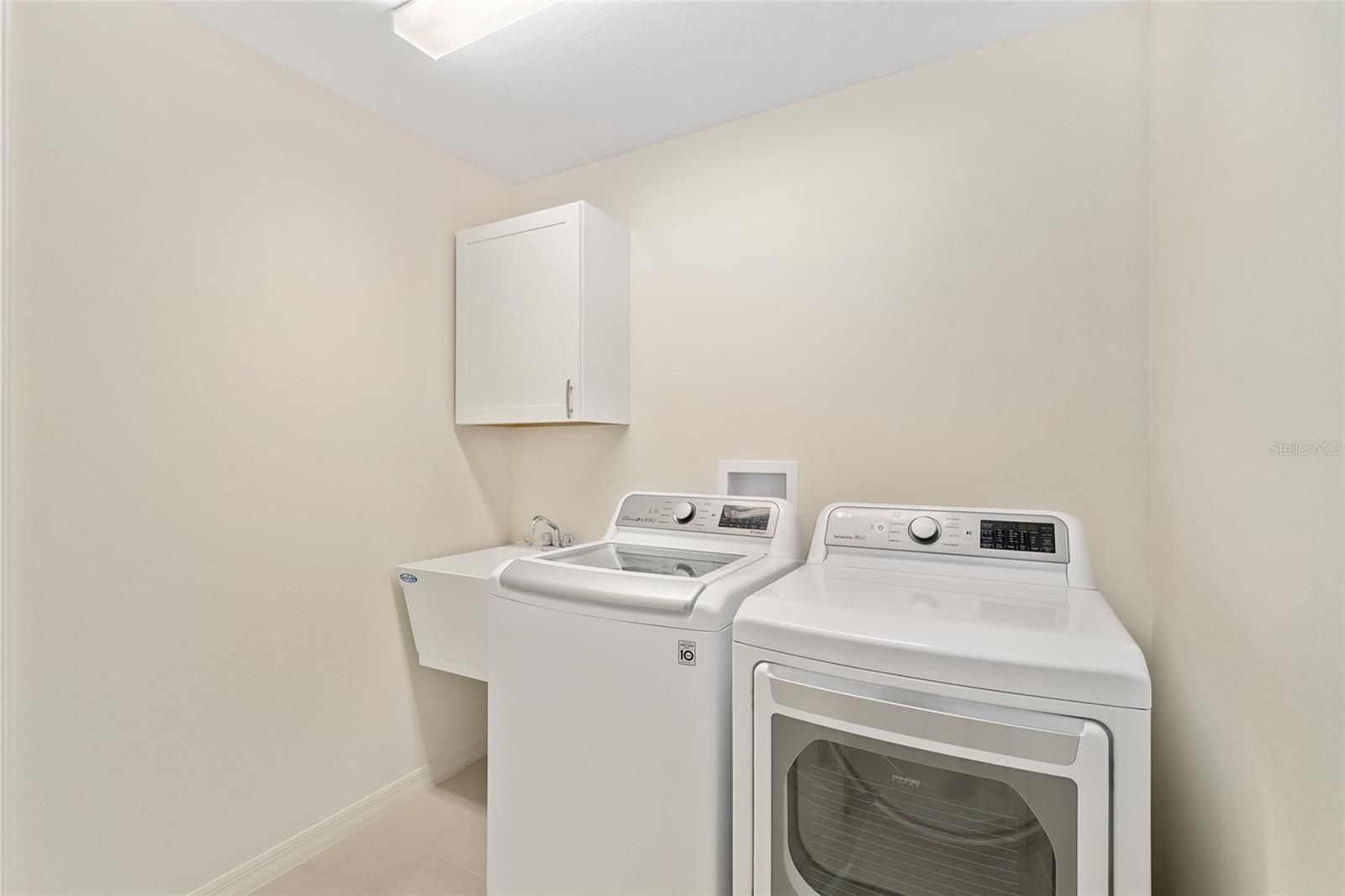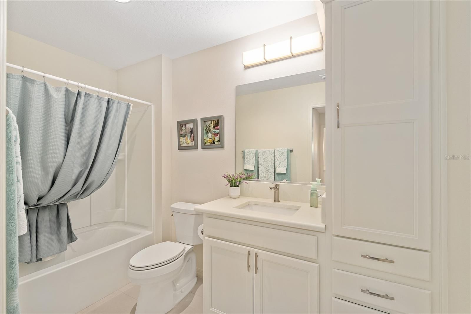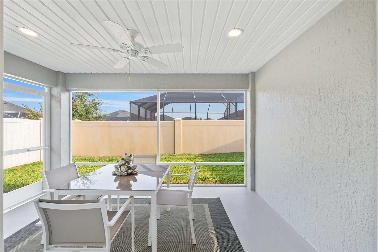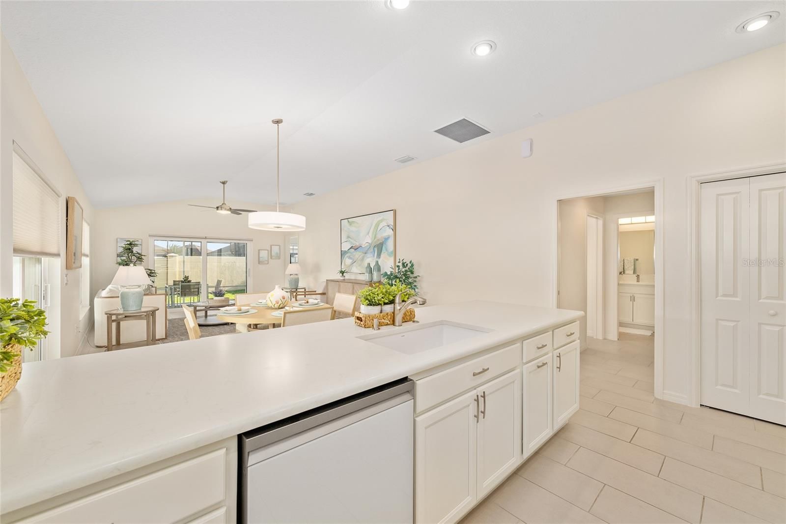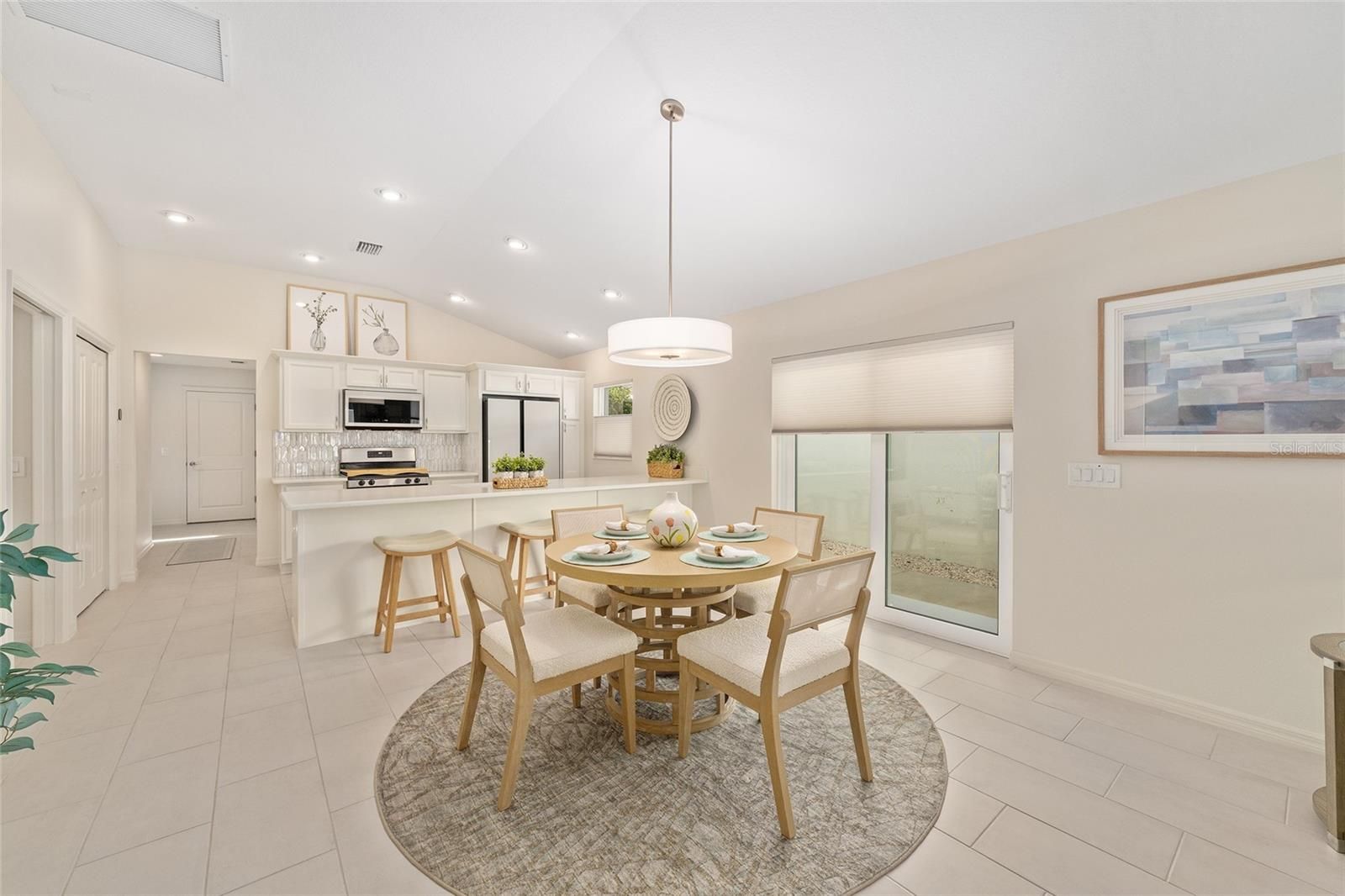 BETTER THAN NEW! This 2021 block-and-stucco 3-bedroom, 2-bath Charlotte Courtyard villa with a TWO-CAR GARAGE featuring separate doors —sold TURNKEY, As you enter you will notice TILE FLOORING throughout—NO CARPET anywhere, VAULTED CEILINGS and UPGRADES GALORE to include gutters, a Pegasus whole-home WATER FILTRATION and SOFTENER SYSTEMS, fresh interior and exterior paint, modern lighting and ceiling fans, and LED quiet garage door openers with battery backups. The kitchen and baths feature matching QUARTZ countertops, a full backsplash, and upgraded cabinetry with PULL-OUT SHELVING and a large pull out spice rack. Top-of-the-line Samsung Bespoke refrigerator, dishwasher, and microwave that match the cabinetry, create a sleek, contemporary look. The Primary bedroom features a TRAY CEILING, and primary bathroom features a large WALK-IN CLOSET, and DOUBLE SINK VANITY. This home also comes with the luxury of an INDOOR LAUNDRY ROOM equipped with WASH TUB. Sunshades upgraded from blinds add a polished touch, enjoy your lanai outback with a privacy wall that offers peaceful outdoor living. This villa pairs modern design with access to The Villages’ newest lifestyle destinations—TURNKEY, UPDATED, AND READY TO ENJOY! you will enjoy many nearby amenities including Eastport Town Square, several new golf courses, and Ezell Recreation Center (˜5 minutes) with putt-putt, organized pickleball, indoor gym, and ping pong. Also close to Southern Oaks Championship Golf Course, Sawgrass Grove with live music nightly, restaurants, and The Villages Produce, Mickey Lee Chip & Jubilee Putt-Putt courses, Homestead Recreation Center with the Boardwalk Nature Trail, and even the Astronomy Observation Pads.
