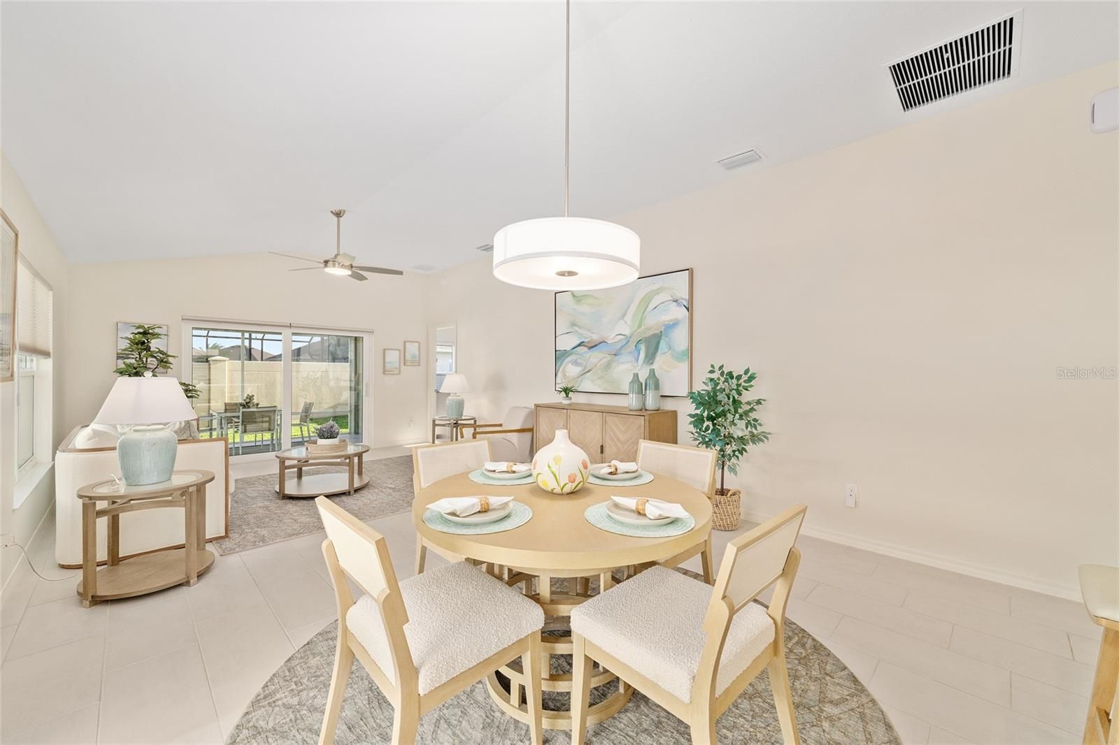 - Ceiling Fan(s), Eat-in Kitchen, Living/Dining Room, Open Floorplan, Main Level Primary, Stone Counters, Vaulted Ceiling(s), Walk-In Closet(s), Window Treatments