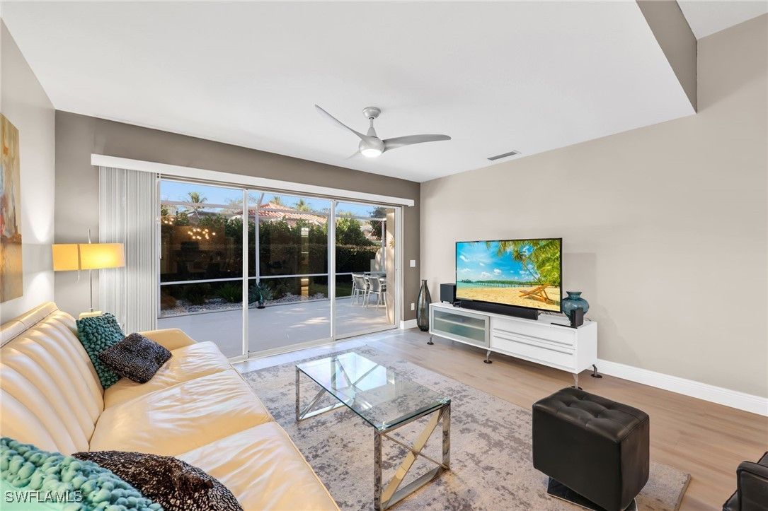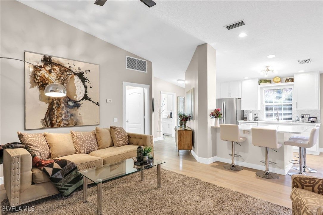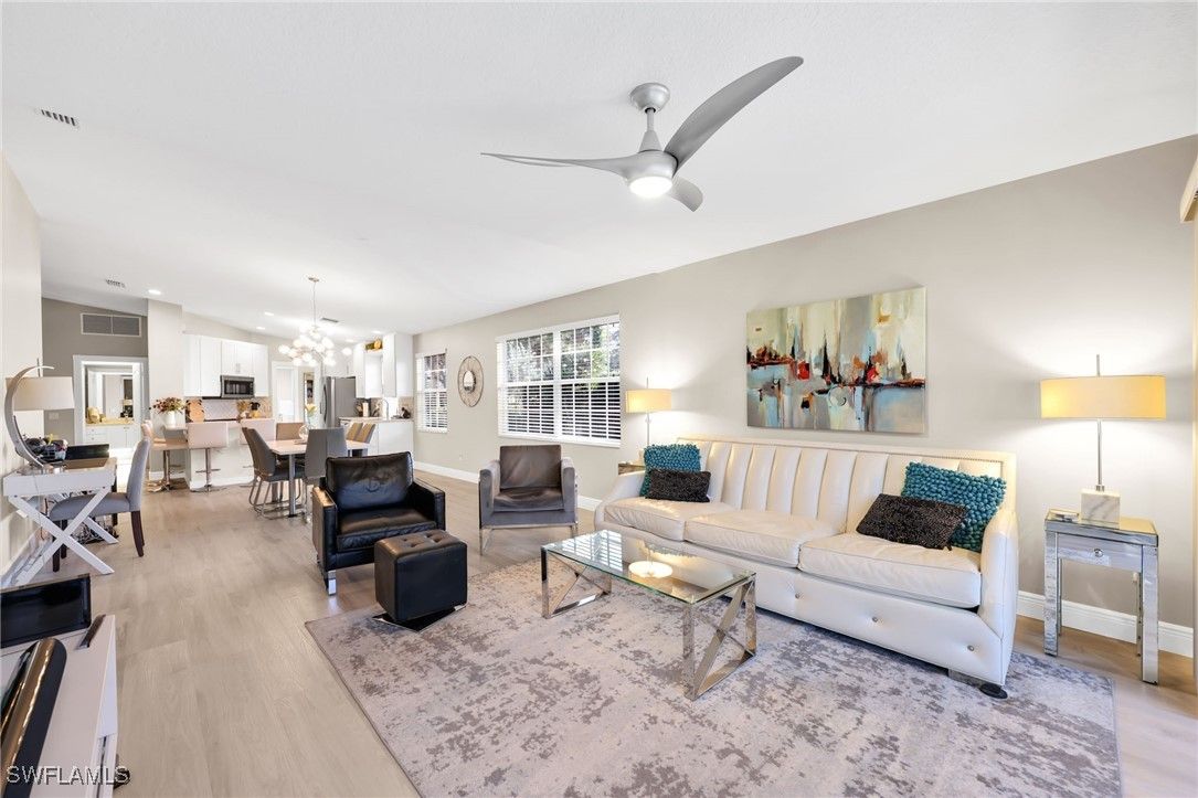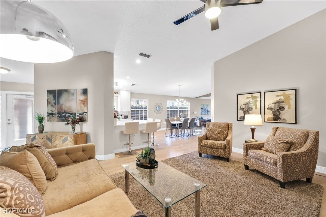 BUILT SOLID – Original DiVosta Capri with Exceptional Privacy. Experience refined Florida living in this beautifully remodeled and expanded Capri model, offering a rare blend of privacy, quality construction, and timeless elegance. A custom-built private patio provides a peaceful outdoor retreat, perfectly extending the living space. Truly move-in ready with no work required, this professionally landscaped home is ideally located near the front gate for added convenience and exclusivity. The residence borders a scenic walkway leading directly to a park and the community’s Town Center. Crafted with DiVosta’s renowned poured-concrete construction and 6-foot privacy wall, the home also features smooth-coat walls, custom-finished closet systems, and central vacuum. Added peace of mind comes from enhanced hurricane protection, including a custom hurricane-rated front door, accordion shutters, and a new roof (2021). Thoughtful upgrades are evident throughout. Quartz countertops enhance the kitchen, bathrooms, and laundry room, complemented by fresh designer paint and luxury plank flooring throughout. The spa-inspired bathrooms have been fully renovated with frameless glass enclosures and custom mirrors. The open-concept kitchen has been redesigned with new cabinet doors, upgraded hardware, stainless steel appliances, and a striking backsplash—ideal for both everyday living and entertaining. Every upgrade has been professionally executed with care, resulting in a home that offers comfort, style, and lasting quality. Located in the prestigious Island Walk community, residents enjoy gated, resort-style living with a grand Town Center clubhouse, resort and lap pools, state-of-the-art fitness center, tennis and pickleball courts, bocce, lawn bowling, croquet, and a putting green. Miles of scenic walking and biking paths wind through lakes and bridges, complemented by an active social calendar and exceptional on-site conveniences including a restaurant, post office, gas station, car wash, and salon services. Ideally situated just minutes from upscale shopping, fine dining, and Naples’ world-renowned beaches.