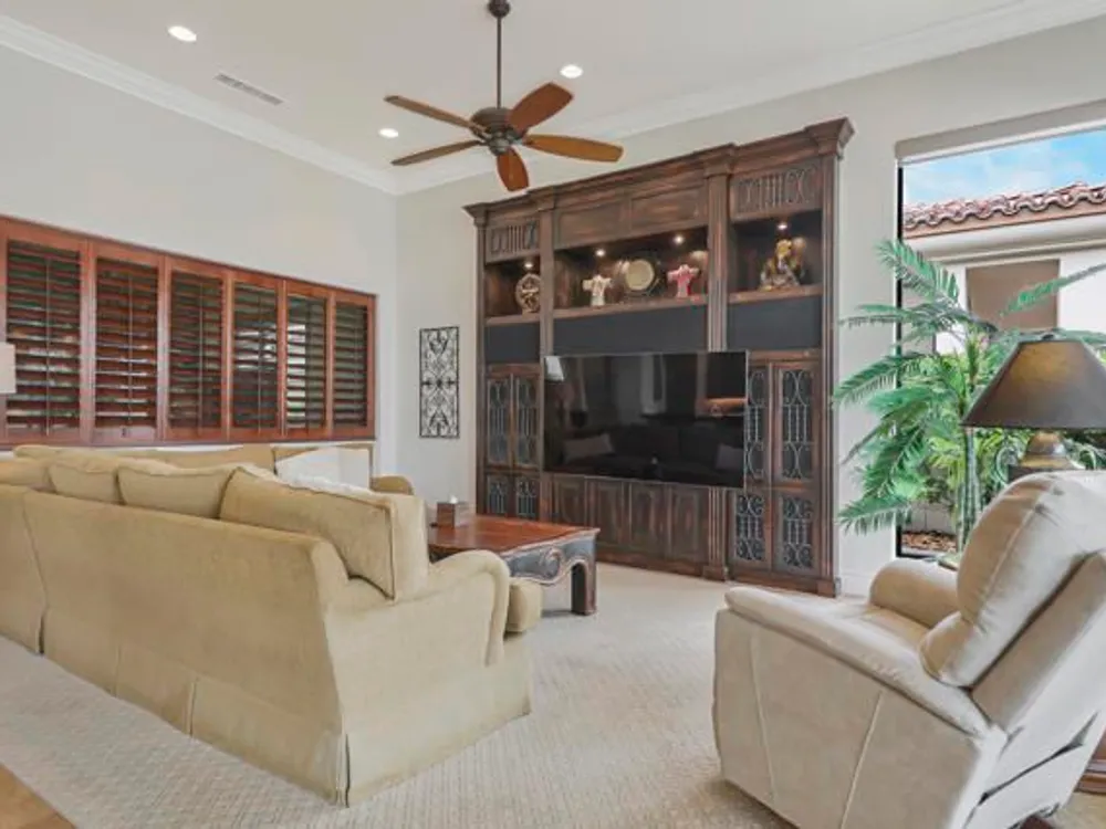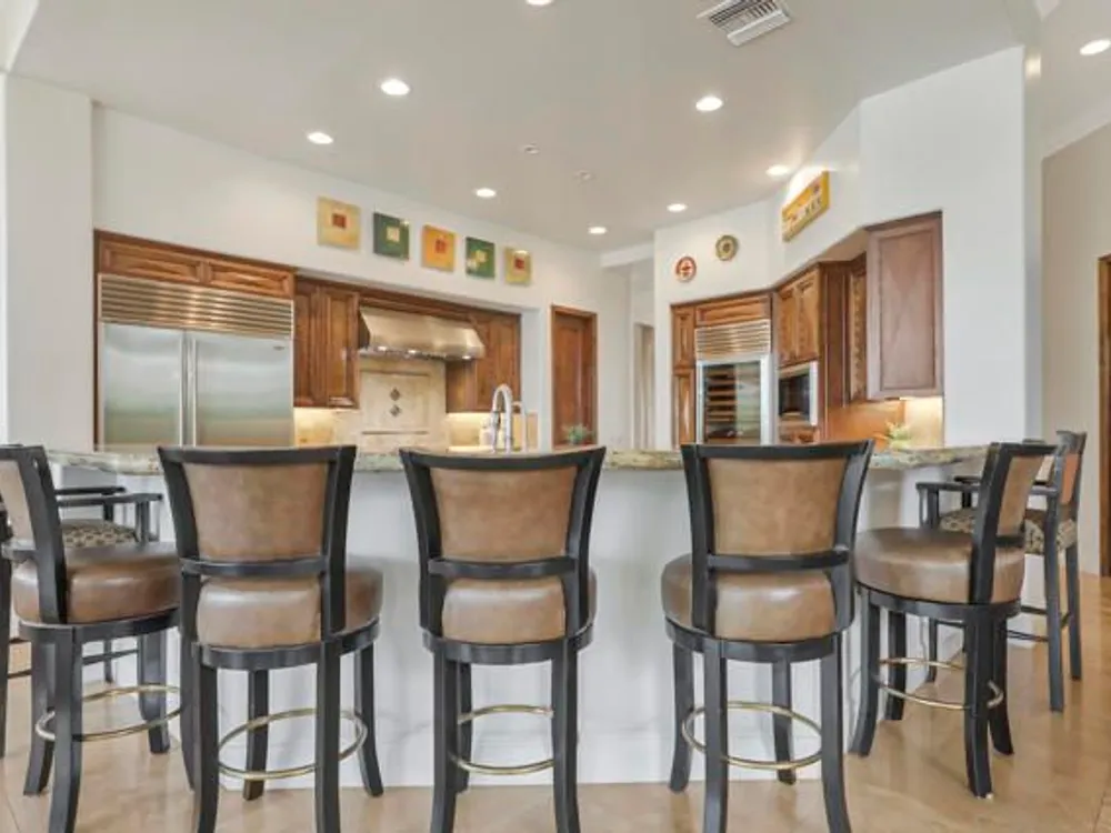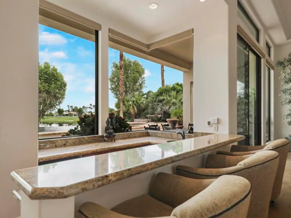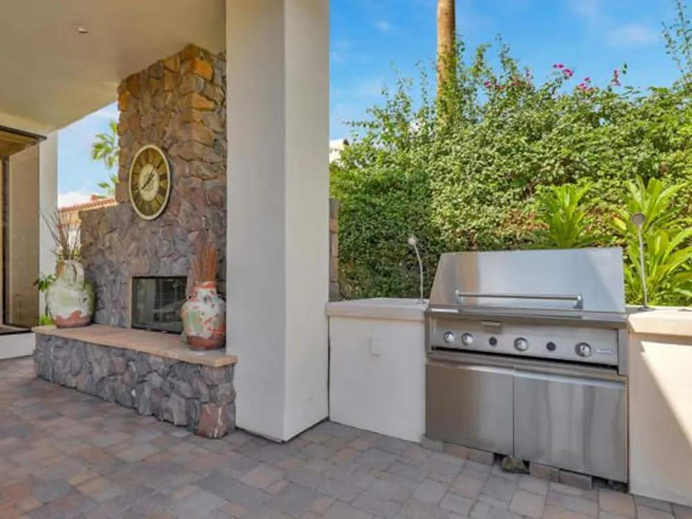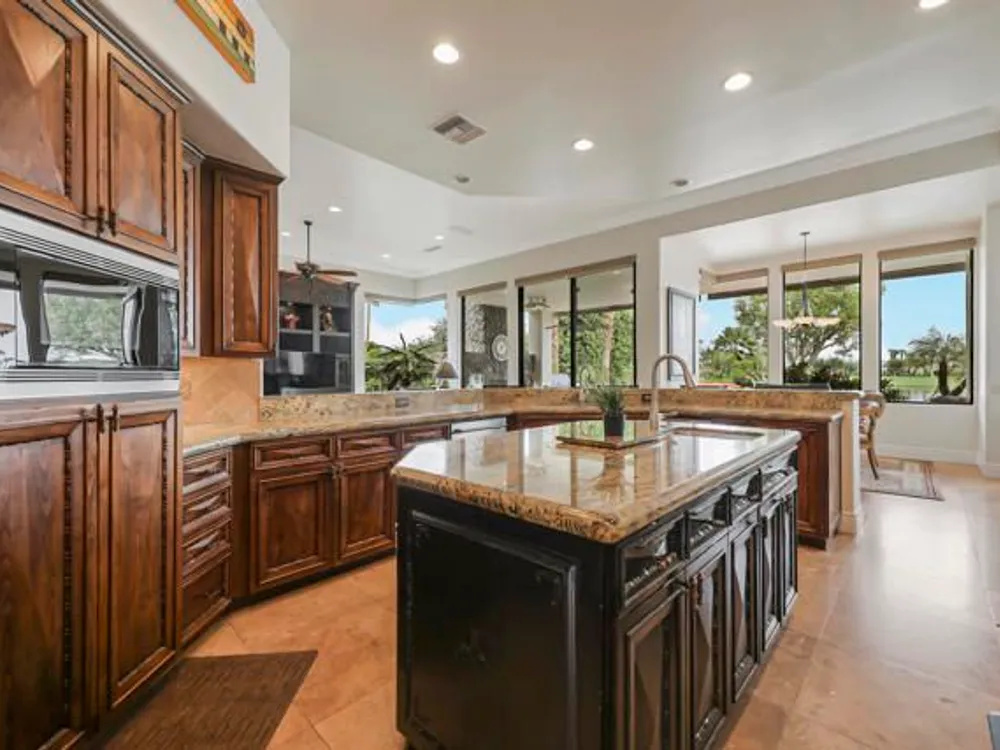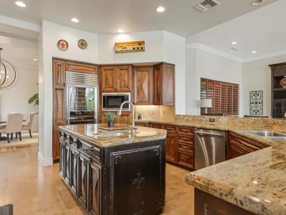Set against a spectacular lakeside backdrop with breathtaking mountain and golf course views on the 11th hole of the Weiskopf Course, this stunning home feels like a model. Offering approximately 4,828 sq. ft. of pure luxury, it features four bedrooms, including an office, 4.5 baths, and a private two-room casita. Designed for both comfort and style, the open floor plan boasts a spacious gourmet granite island kitchen with Wolf & Sub-Zero appliances, a granite sunken bar showcasing the incredible views, and elegant 24-inch travertine floors. Additional highlights include fresh new paint inside and out, electric shades, and a private gated entry courtyard with tranquil water features.The resort-style backyard is an entertainer's dream, complete with pavers, a saltwater infinity pool and spa, an outdoor fireplace, a fire pit, a built-in BBQ, and more. The home comes fully furnished and includes a golf cart--making it completely move-in ready. With low HOA fees and an unbeatable location, this extraordinary home offers the ultimate lifestyle. Call now to schedule your private showing of this spectacular property!