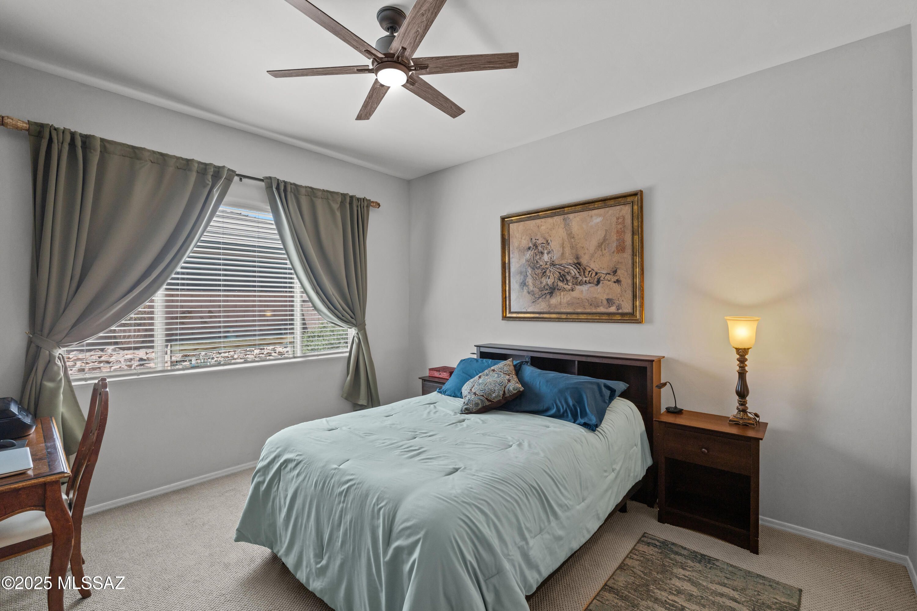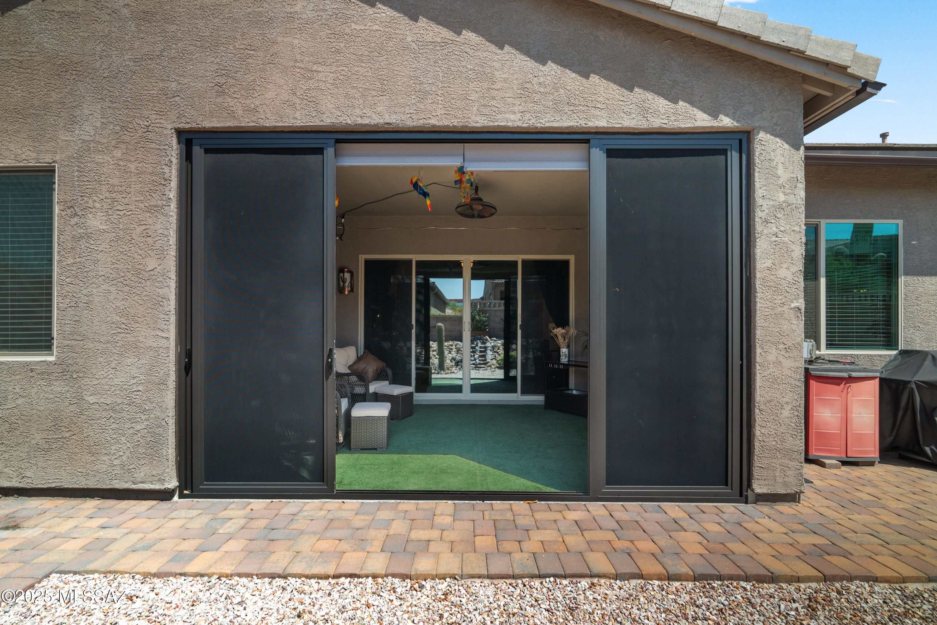 Immaculate San Bernardino model, built in 2021, brimming with upgrades! A security-screened courtyard welcomes you in. Wood-look tile floors flow throughout, with carpet in bedrooms. The upgraded kitchen boasts cabinet moulding, slide-out shelving & stainless appliances. Recessed lighting, ceiling fans, whole-house water softener & kitchen water filters add comfort. Enjoy a solar-screened-in back patio. Paver walkways linking all 3 patios lead around the home. BBQ area with a natural gas hookup, & a tranquil waterfall that boasts serene views from the living areas. Solar lighting, drip irrigation, plus a 4' extended garage with sink, insulated door & storage racks. Conveniently located to the Canoa Ranch Recreation Center, golf course, and all GVR has to offer!