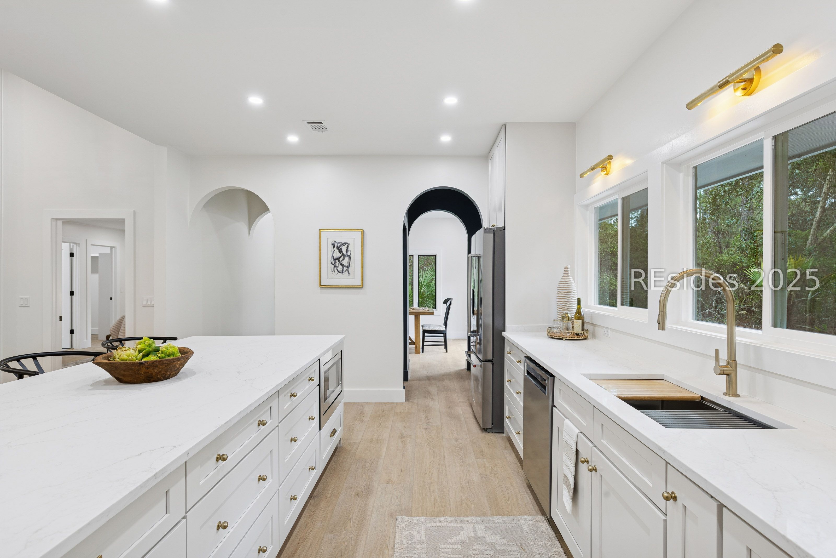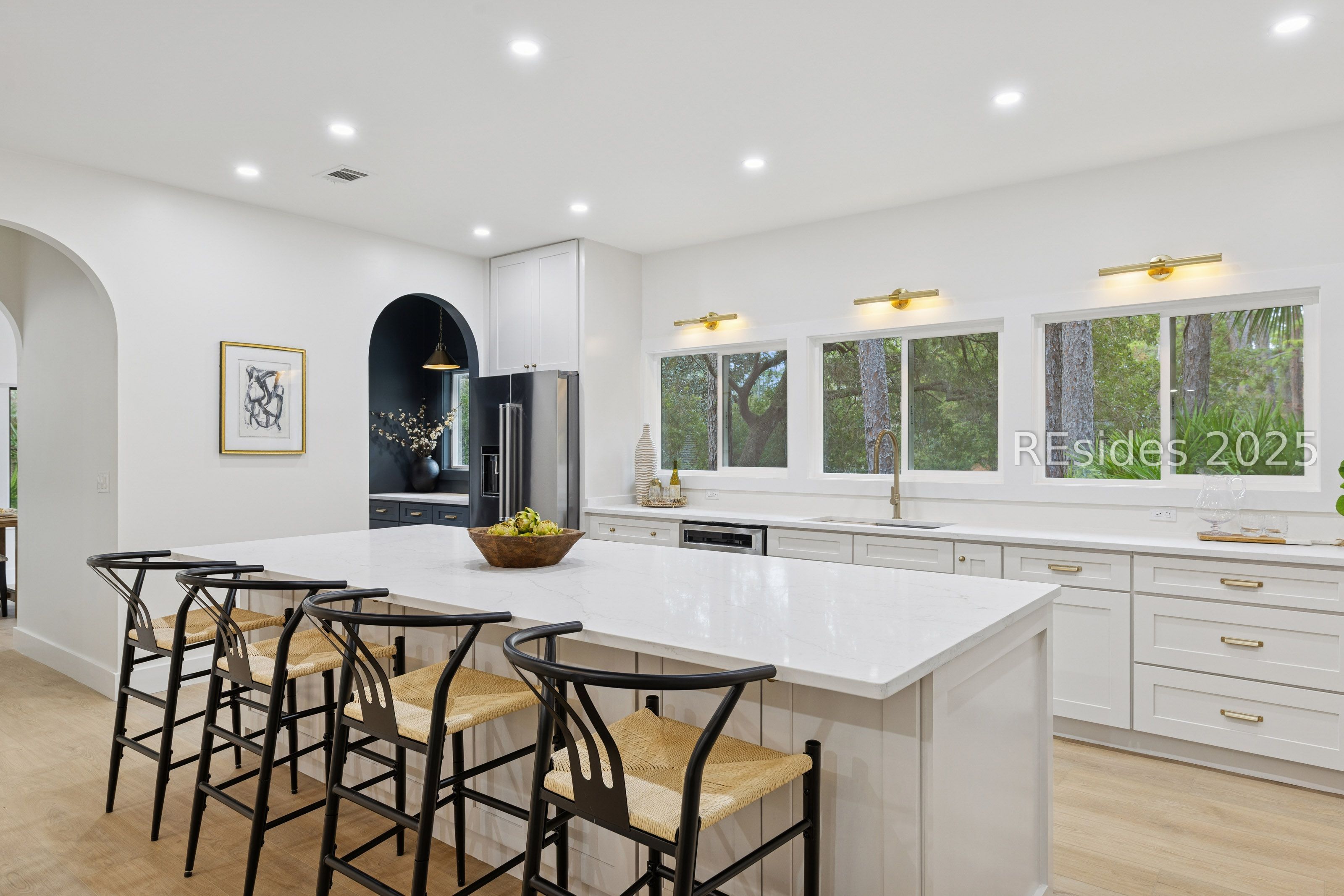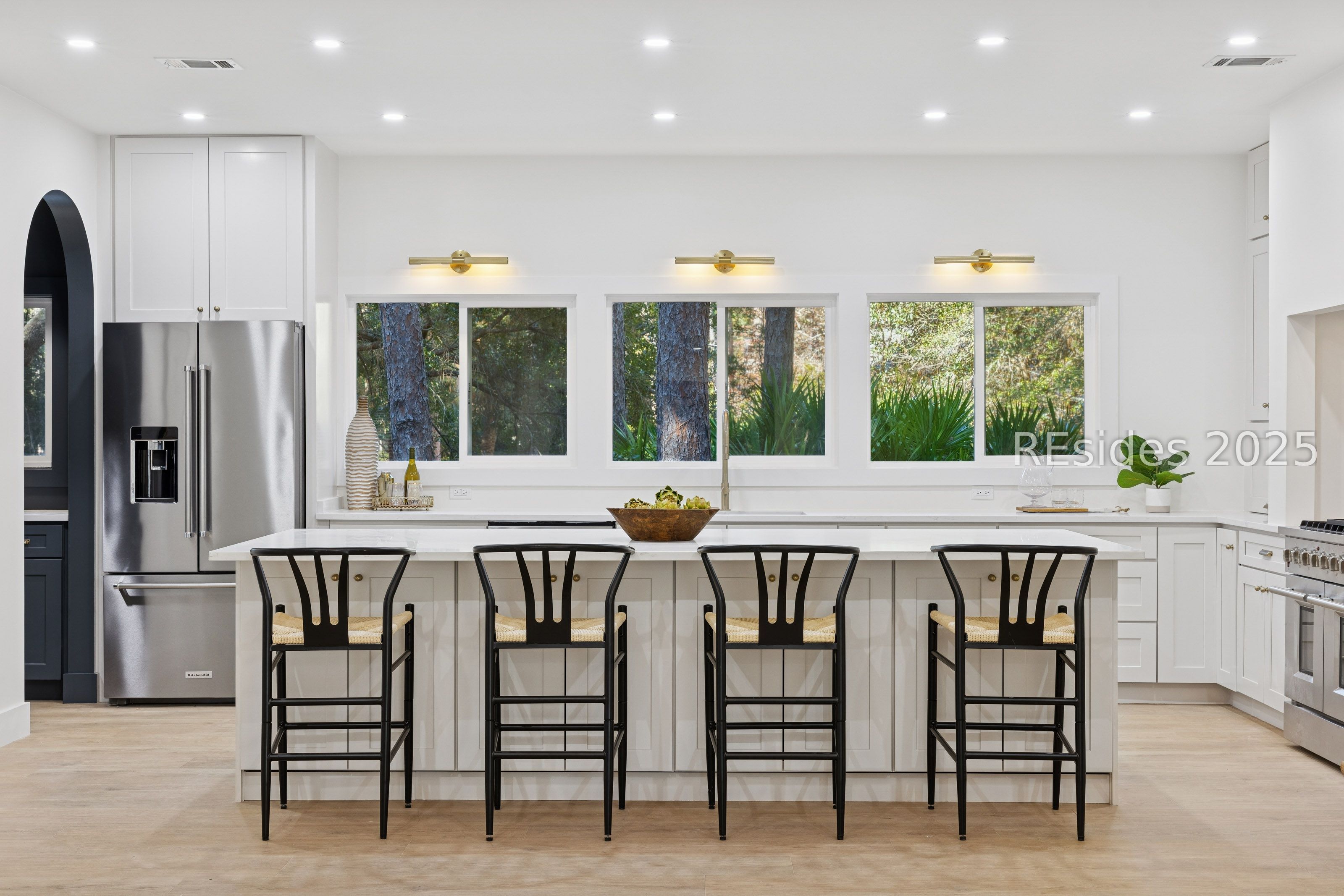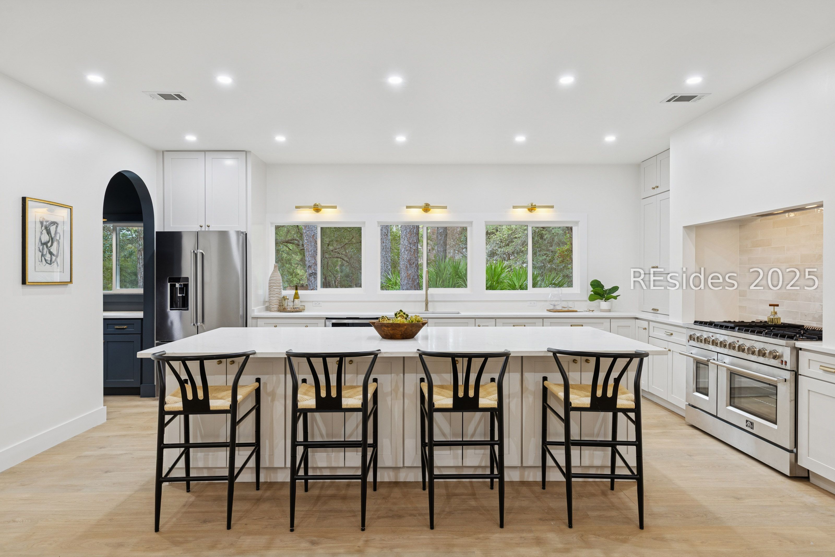 Located within the tranquil community of Hilton Head Plantation, this coastal modern home offers refined Lowcountry living on a nearly half-acre, private lagoon-front lot. Completely renovated, it features a bright, open floor plan with soaring cathedral ceilings and abundant natural light. The chef's kitchen includes a spacious island, quartz countertops, 48 inch gas range, kitchen aid appliances, and is ideal for both everyday living and entertaining. Four spacious bedrooms each include their own en suite bath, complemented by a dedicated office. Additional highlights include a huge roundabout driveway with ample parking, two-car garage, brand-new HVAC system, and thoughtful upgrades throughout, creating a move-in-ready retreat with exceptional privacy and serene water views.