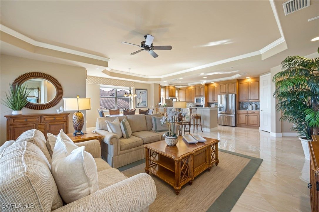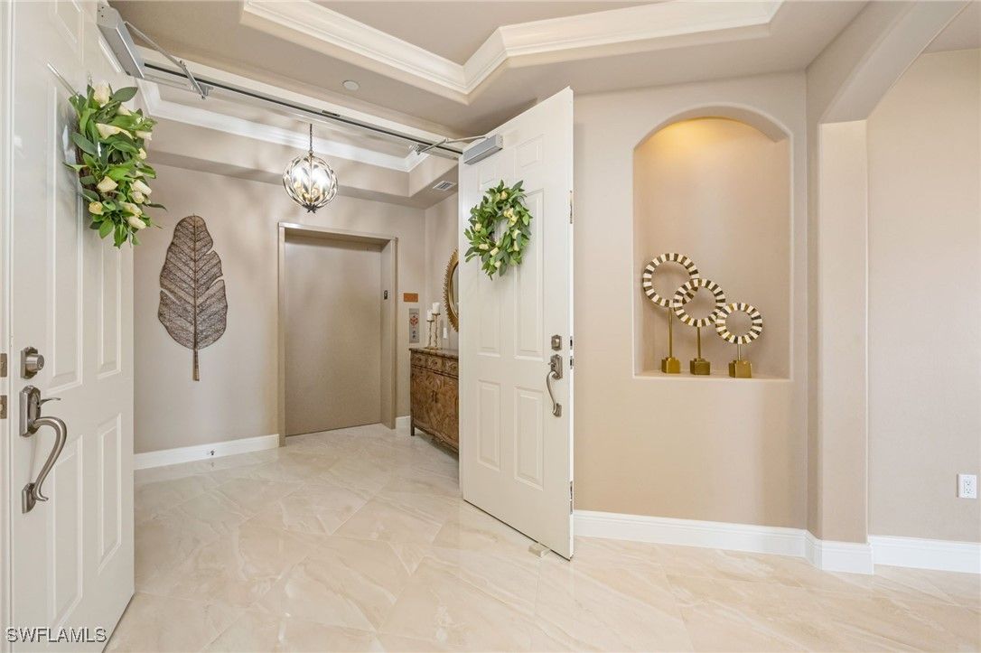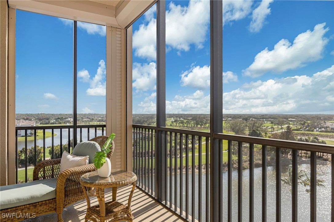 Experience luxury living in this stunning corner unit located in the prestigious Vista Pointe at the Vineyards. Set in the highly sought-after building 580, this residence has a private elevator for added convenience and exclusivity. The home's prime 7th-floor CORNER position offers the best panoramic views-enjoy breathtaking golf course vistas from the back, and the gulf skyline from the front. Abundant extra windows fill the open floorplan with natural light, highlighting the home's neutral colors and upgraded flooring. With three spacious bedrooms, each featuring its own private bath, plus an additional half bath for guests, comfort and privacy are assured. The lanai is equipped with hurricane shutters for peace of mind, and a dedicated GARAGE space provides secure parking. ONLY the residents of Vista Pointe enjoy exclusive amenities including a sparkling pool with spa, inviting BBQ area, tranquil waterfalls, a workout space, and a community kitchen with a social living room-perfect for gatherings and relaxation. Discover upscale, welcoming living tailored for today's discerning homebuyers. Immediate membership at the Vineyards Country Club is available but not mandatory. The club has been voted one of the best full-service golf clubs in SWFL.