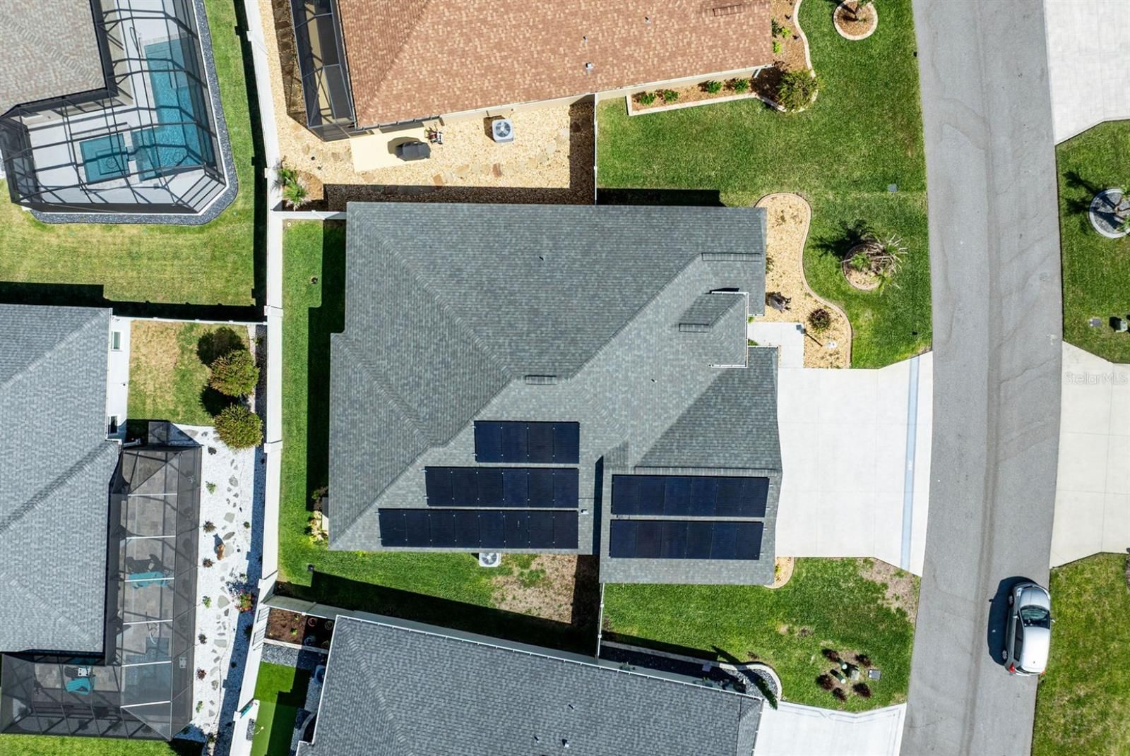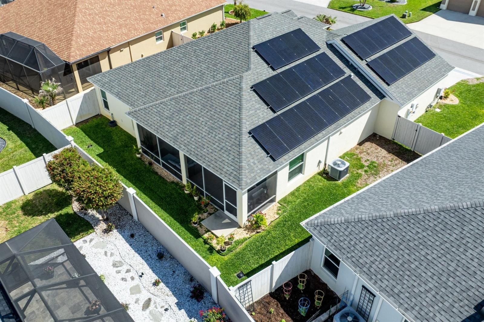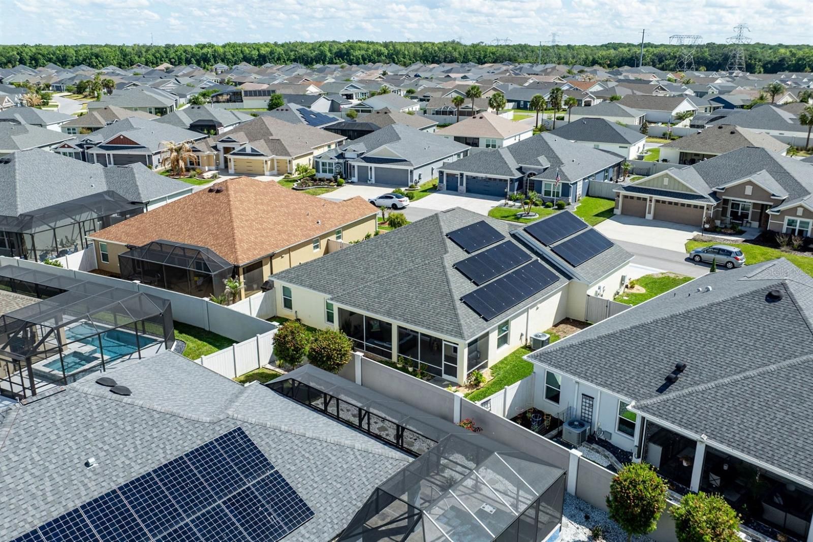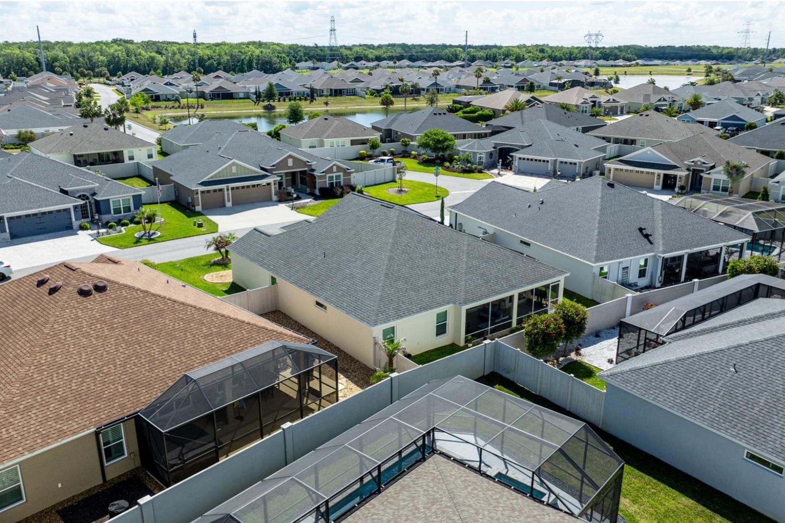 Welcome to your private retreat in the highly desirable Village of St. Catherine! This beautifully maintained and FULLY FENCED TURN-KEY Hudson Model VERANDA offers 3 Bedrooms, 2 Bathrooms, and 1,918 Sq. Ft. of living space, along with one of the most valuable features buyers are looking for today— a FULLY OWNED, PAID-IN-FULL WHOLE-HOME $45K SOLAR SYSTEM WITH BATTERY BACKUP! This is not leased solar—this is true SOLAR ownership and real value! The solar system powers the entire 200-amp service, includes battery backup for continuous emergency power, warranties in place, electric car charging capability in the garage, and the property is currently selling excess power back to the Leesburg Electric—helping offset monthly energy costs and generating monthly utility credits for the new owner. A rare and highly desirable feature that adds both security and long-term savings. Perfectly located near Sawgrass Grove, Eastport, and Middleton, this gorgeous home offers an open-concept layout designed for both everyday comfort and entertaining. The home has been S~T~R~E~T~C~H~E~D by 2 feet, creating additional living space and enhancing both the residential lanai and garage. Enjoy 6x36 ceramic tile flooring throughout, everywhere except the bedrooms, volume ceilings, neutral finishes, and quality turn-key furnishings. The expanded residential lanai provides the perfect place to relax and enjoy your private fenced backyard. The OVERSIZED 2-car garage plus golf cart garage is also 2 FEET DEEPER, offering exceptional storage and functionality. The large kitchen is a standout feature with French vanilla/light gray cabinetry, stainless steel appliances, gas range, kitchen island, breakfast nook, bar seating, pantry closet, and abundant prep and storage space—ideal for both entertaining and daily living. The spacious primary suite features a coffered ceiling, large walk-in closet, and a well-appointed primary bath with DOUBLE SINKS and a walk-in shower. A pocket door creates privacy for the guest bedrooms and guest bath with tub/shower combination. Additional features include PRIVATE, FENCED IN YARD, INTERIOR LAUNDRY with washer and dryer included, tankless water heater, smart home-ready wiring, enhanced landscaping, irrigation system, gutters, and excellent curb appeal throughout. This is more than just a home—it is efficiency, security, income-producing solar ownership, and The Villages lifestyle all in one exceptional property.
