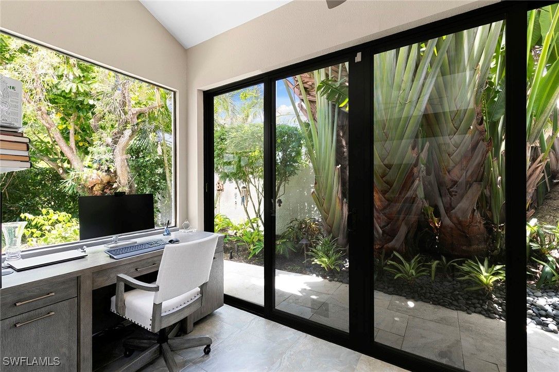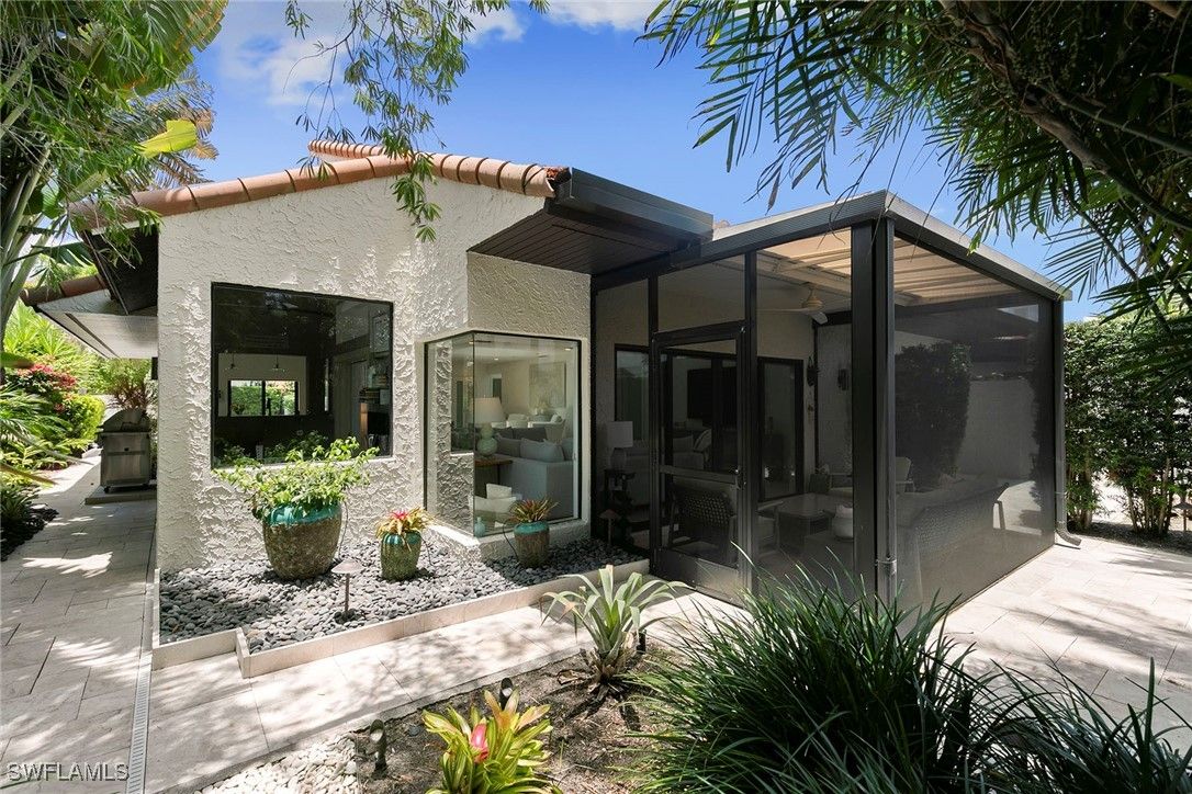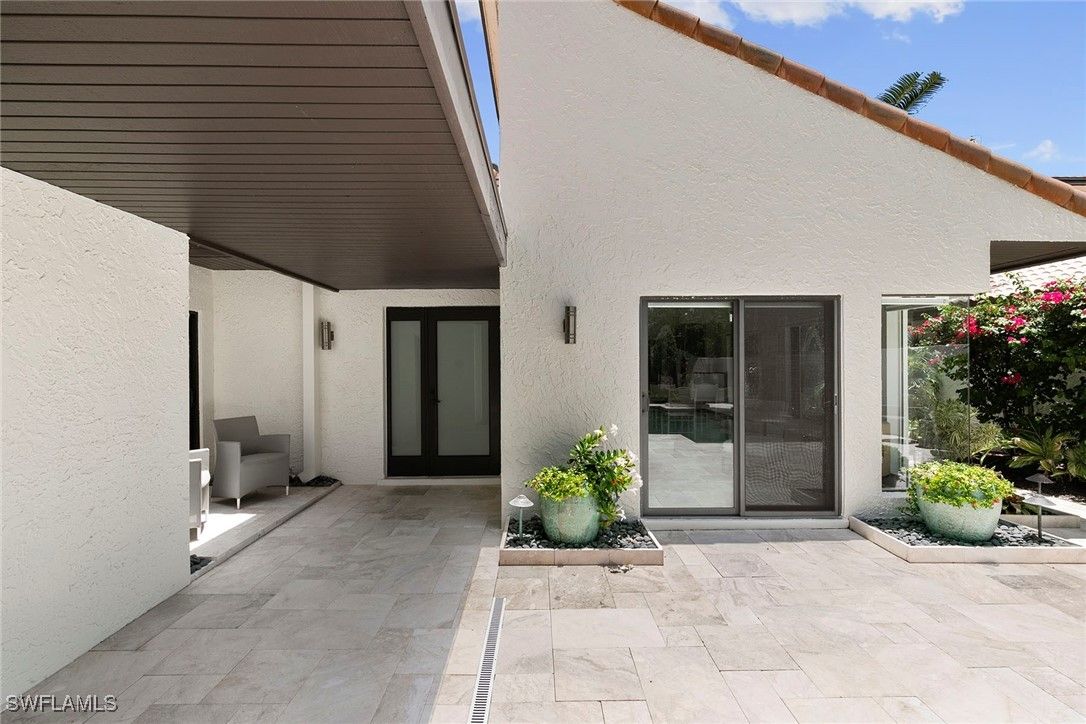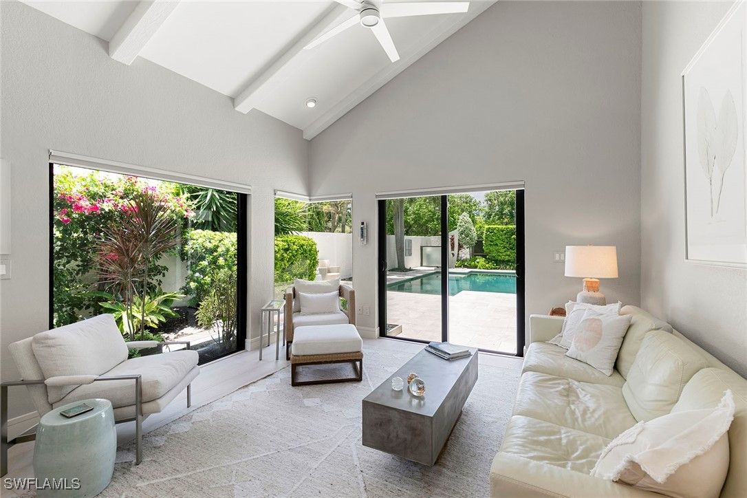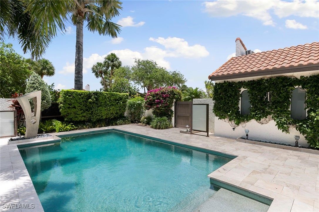 Welcome to Tierra Mar and a beautifully renovated villa in Pelican Bay offering an ideal balance of seclusion and convenience. This single-story residence is a private tropical retreat, with soaring ceilings, generous closets and walls of glass that frame tropical landscaping from nearly every room. The thoughtfully updated interior features a spacious living room, a modern kitchen, and a flexible second den/family room, ideal for guests to enjoy their own comfortable space to read or watch TV. Both baths have been recently renovated so there's not a project left to do in this villa. Go outside to your resort-style courtyard, complete with an enormous sparkling solar-heated pool and lush landscaping that is dramatically lit at night to create a tropical outdoor setting. Thoughtful additions are a home office and a screened-in back porch, ideal for morning coffee outside. An oversized two-car garage adds convenience, while the villa's south Pelican Bay location places you minutes from Artis-Naples, Waterside Shops and the beach. Pelican Bay residents enjoy private beachfront dining, tennis, a fitness center and miles of recreational paths. This is one of Naples desired outdoor and wellness-focused lifestyles, all in an X-500 flood zone.