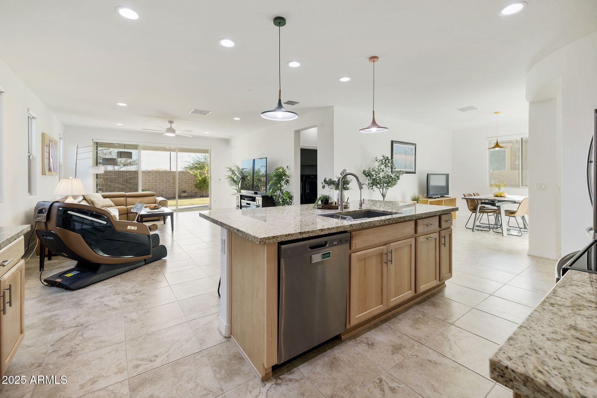 This popular Waltz plan is a great room plan with two-bedroom, two-bathroom, a den and a dining/flex room. The kitchen boasts granite counters, large island, upgraded maple recessed cabinets with brush nickel hardware, stainless steel appliances, stainless steel single-bowl sink with a goose neck faucet and pendant lighting. Additional cabinets at the key drop. The great room includes a multi-slider door. This home boasts upgraded 5 panel doors and tile throughout. The split floor plan offers privacy at the extended primary en-suite which has a raised vanity, double sinks, walk-in shower with bench, a walk-in closet and a private water closet. You'll love the double-door storage closet and separate laundry room with hanging rack and additional shelves. The Craftsman Elevation .... offers curb appeal. The backyard features a covered patio and professionally landscaped with real grass and a paver border. The home also includes an epoxy-floor garage with a service door and 2-foot extension for larger vehicles. The award-winning Encore 55+ community center offers a wealth of amenities, including a workout facility, a meeting room, a card room, a ping-pong room with 2 kilns, a billiard room, & the Proving Ground Café. Encore also features pickle ball, tennis, bocci ball and lots of green space with walking trails. Encore has something for everyone with its many year-round clubs & activities.