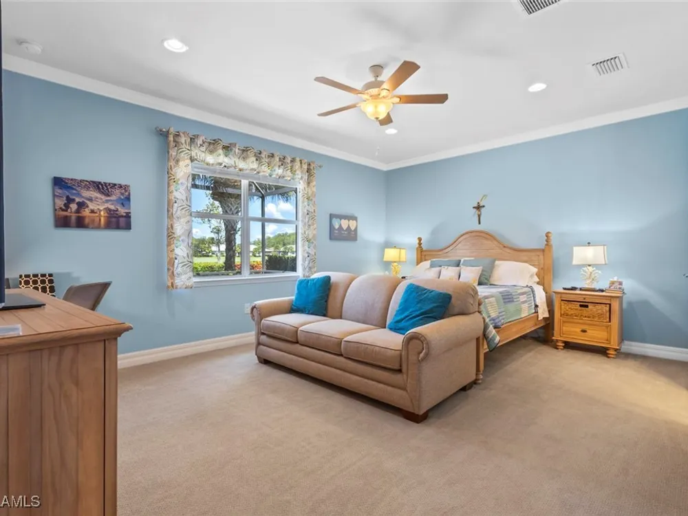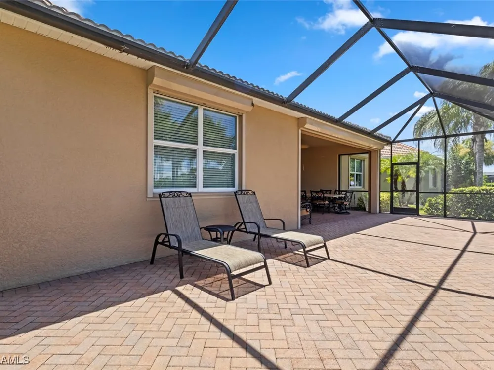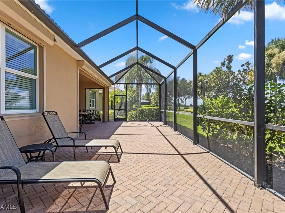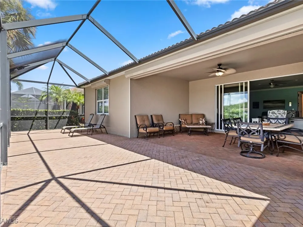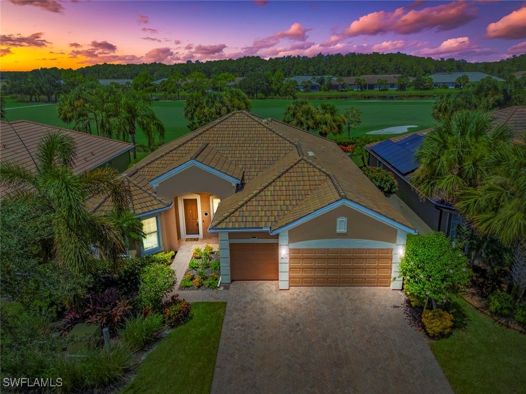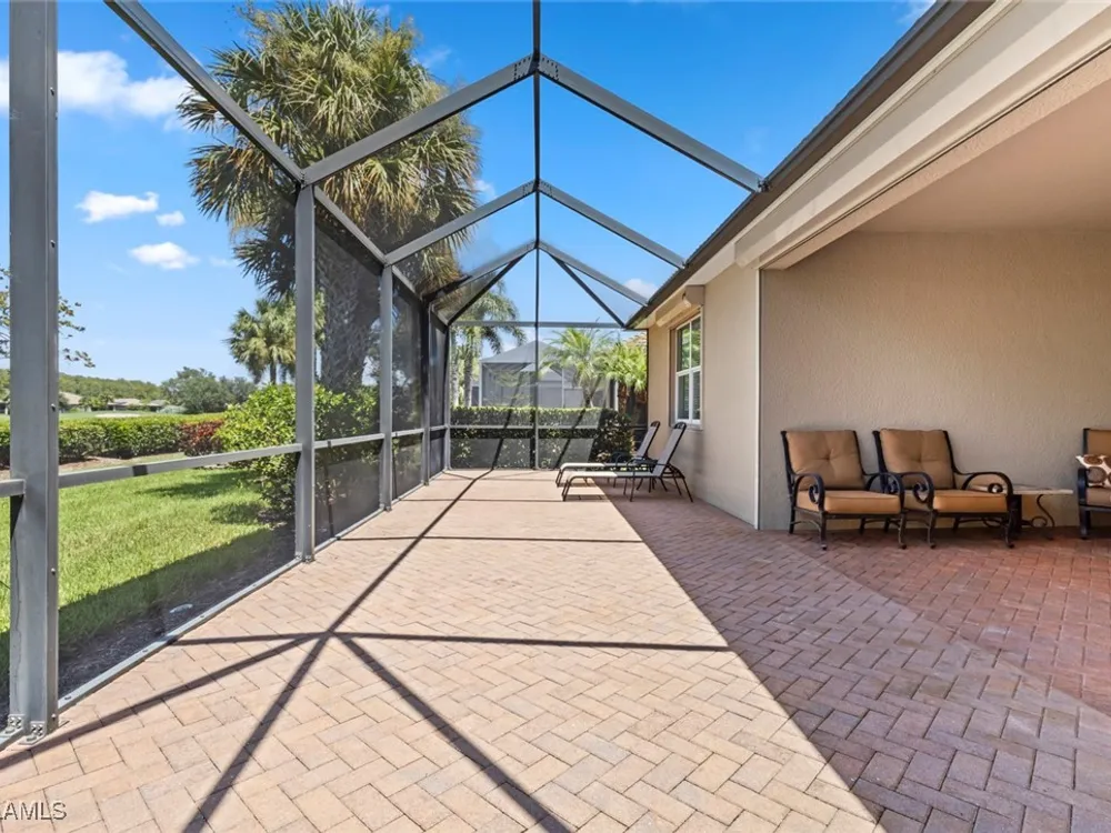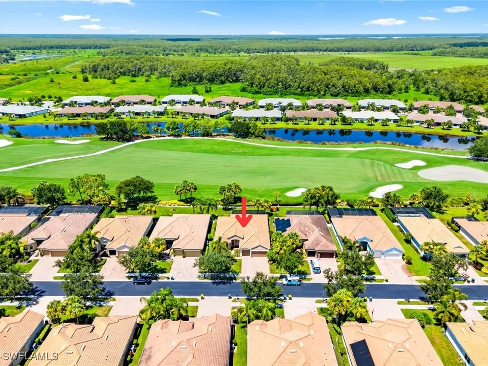 This beautiful DUNWOODY floor plan is located on the 2nd fairway of the Panther Run Golf Course, showcasing GOLF COURSE AND SUNSET VIEWS in the sought-after 55+ Del Webb Naples community with resort-style amenities. This floor plan is comparable to the popular STELLAR model. Inside, the GOURMET KITCHEN impresses with a large island, UPGRADED KITCHENAID APPLIANCES, custom backsplash, abundant cabinetry with pull-out drawers, and large pantry. The primary suite is a retreat of its own, featuring a custom walk-in closet and a spa-like bath with dual vanities and a spacious WALK-IN SHOWER WITH JETS. With 3 bedrooms plus a den, there’s ample flexibility for guests, an office, or hobbies. Flooring includes tile on the diagonal, wood in the den, and upgraded carpet in bedrooms. During storms you will have a peace of mind, the home is equipped with ELECTRIC HURRICANE SCREENS on all windows and doors. A 4-foot EXTENDED 3-car GARAGE offers room for a golf cart, workshop, or additional storage and extra outlets for all your needs. Step outside to an EXTENDED SCREENED LANAI overlooking the fairway. RECENT UPDATES include a NEW HOT WATER HEATER, replaced AC coils, CUSTOM LANDSCAPING, WASHER, and more! GOLF LOVERS —Panther Run Golf Club offers optional MEMBERSHIPS with premium golf experiences just steps from your backyard. In Del Webb Naples, you’ll enjoy WORLD-CLASS AMENITIES that rival luxury resorts: dine at the Rusty Putter Restaurant, soak in the RESORT-STYLE or LAP POOLS, break a sweat in the state-of-the-art FITNESS CENTER, and play your way through PICKLEBALL, TENNIS, bocce, billiards—even a top-tier GOLF SIMULATOR! Need groceries, church, or a bite to eat? Just hop in your golf cart and cruise into town—Publix and the heart of Ave Maria are just minutes away. This isn’t just a home—it’s a LIFESTYLE UPGRADE in one of Southwest Florida’s most vibrant 55+ communities. Don’t miss your chance to live where fun, fitness, and friendships flourish year-round!