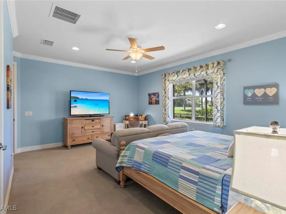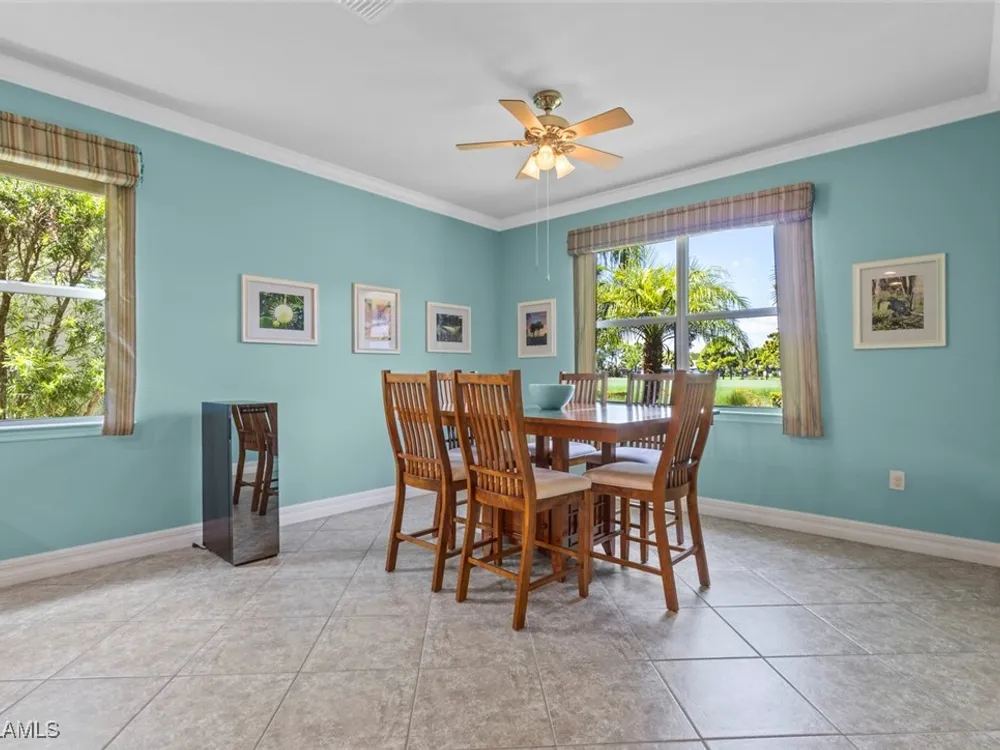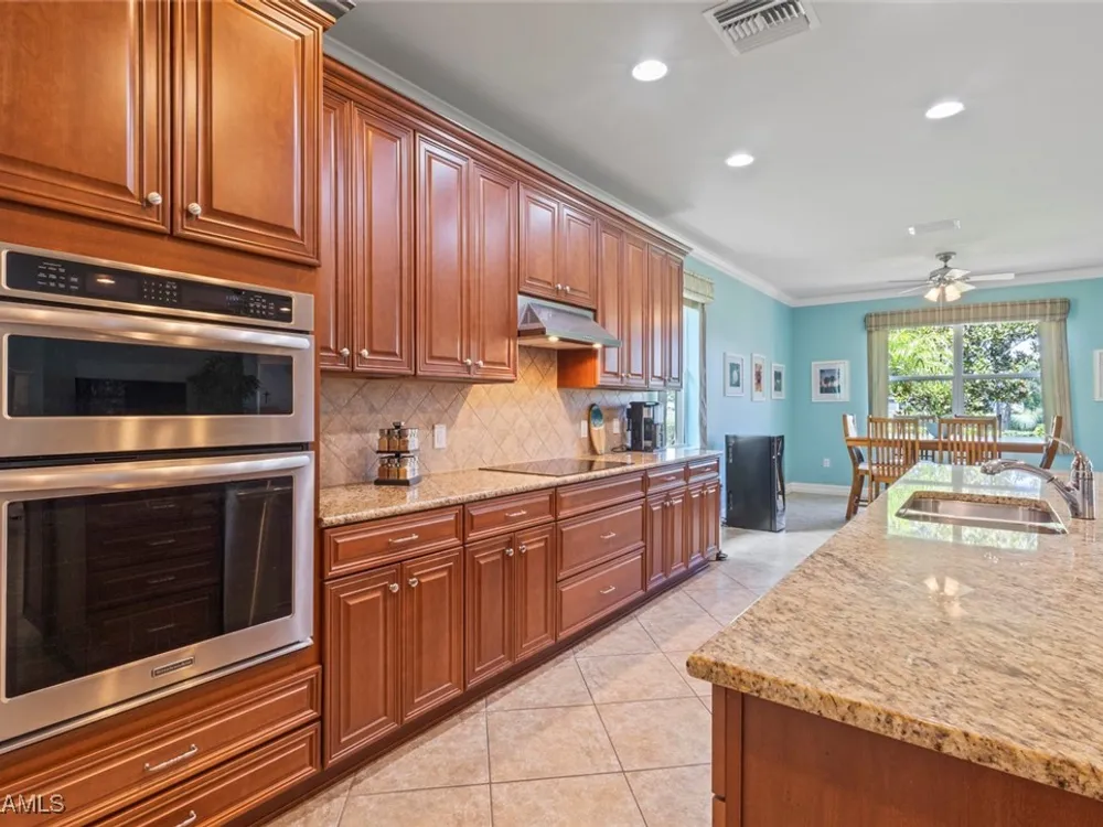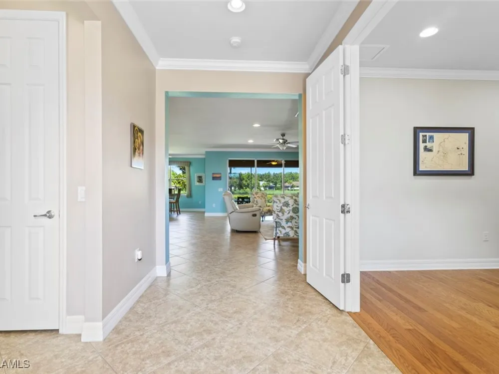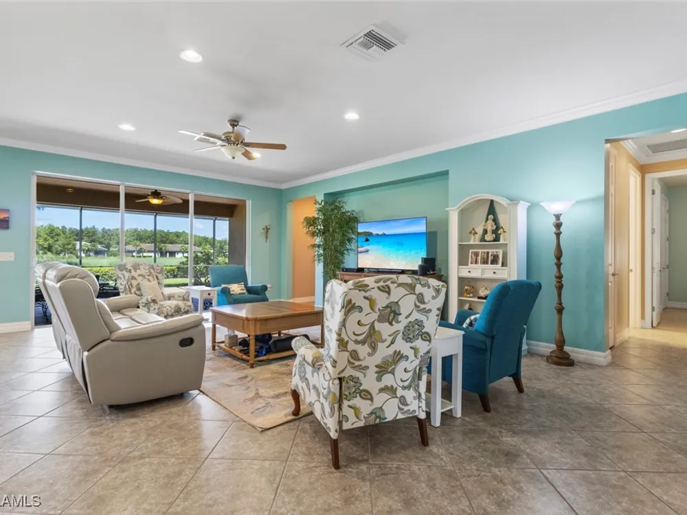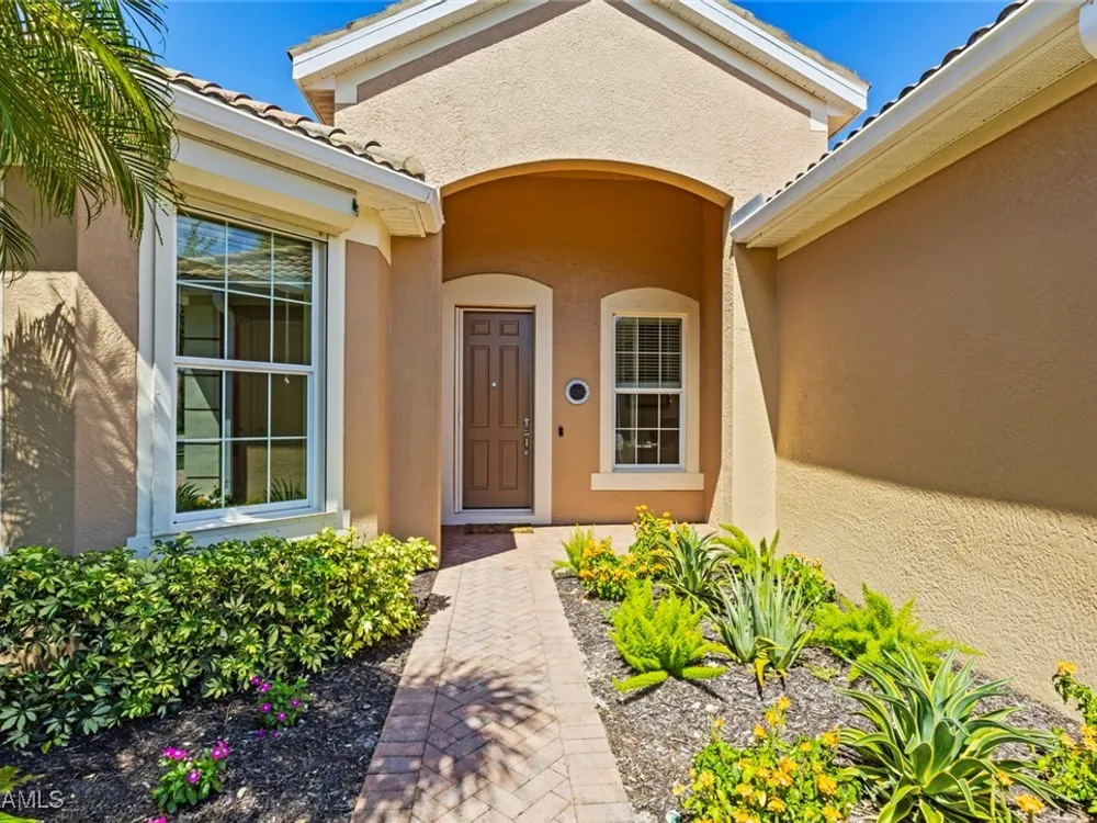 This beautiful DUNWOODY floor plan is located on the 2nd fairway of the Panther Run Golf Course, showcasing GOLF COURSE AND SUNSET VIEWS in the sought-after 55+ Del Webb Naples community with resort-style amenities. This floor plan is comparable to the popular STELLAR model. Inside, the GOURMET KITCHEN impresses with a large island, UPGRADED KITCHENAID APPLIANCES, custom backsplash, abundant cabinetry with pull-out drawers, and large pantry. The primary suite is a retreat of its own, featuring a custom walk-in closet and a spa-like bath with dual vanities and a spacious WALK-IN SHOWER WITH JETS. With 3 bedrooms plus a den, there’s ample flexibility for guests, an office, or hobbies. Flooring includes tile on the diagonal, wood in the den, and upgraded carpet in bedrooms. During storms you will have a peace of mind, the home is equipped with ELECTRIC HURRICANE SCREENS on all windows and doors. A 4-foot EXTENDED 3-car GARAGE offers room for a golf cart, workshop, or additional storage and extra outlets for all your needs. Step outside to an EXTENDED SCREENED LANAI overlooking the fairway. RECENT UPDATES include a NEW HOT WATER HEATER, replaced AC coils, CUSTOM LANDSCAPING, WASHER, and more! GOLF LOVERS —Panther Run Golf Club offers optional MEMBERSHIPS with premium golf experiences just steps from your backyard. In Del Webb Naples, you’ll enjoy WORLD-CLASS AMENITIES that rival luxury resorts: dine at the Rusty Putter Restaurant, soak in the RESORT-STYLE or LAP POOLS, break a sweat in the state-of-the-art FITNESS CENTER, and play your way through PICKLEBALL, TENNIS, bocce, billiards—even a top-tier GOLF SIMULATOR! Need groceries, church, or a bite to eat? Just hop in your golf cart and cruise into town—Publix and the heart of Ave Maria are just minutes away. This isn’t just a home—it’s a LIFESTYLE UPGRADE in one of Southwest Florida’s most vibrant 55+ communities. Don’t miss your chance to live where fun, fitness, and friendships flourish year-round!